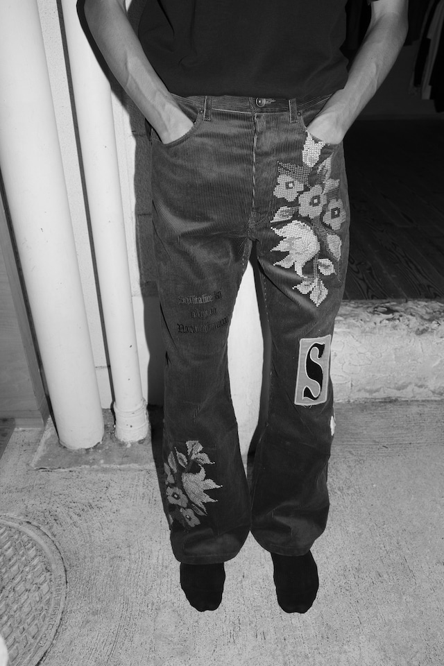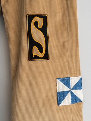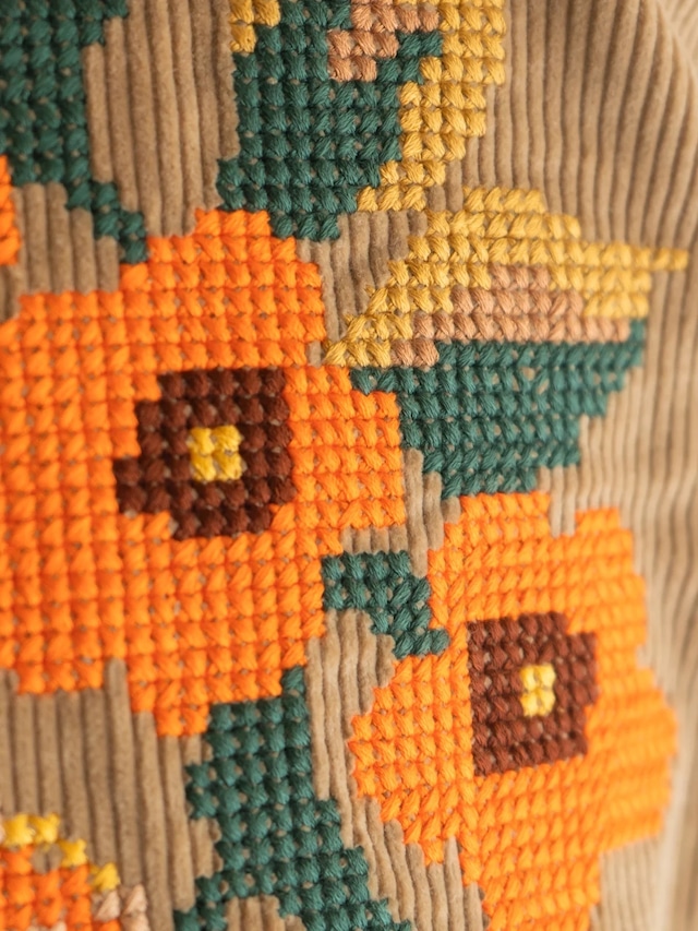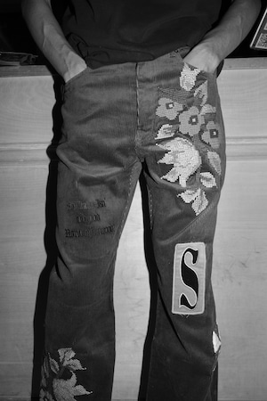 クロスステッチ刺繍が施されたコーデュロイフレアパンツ。