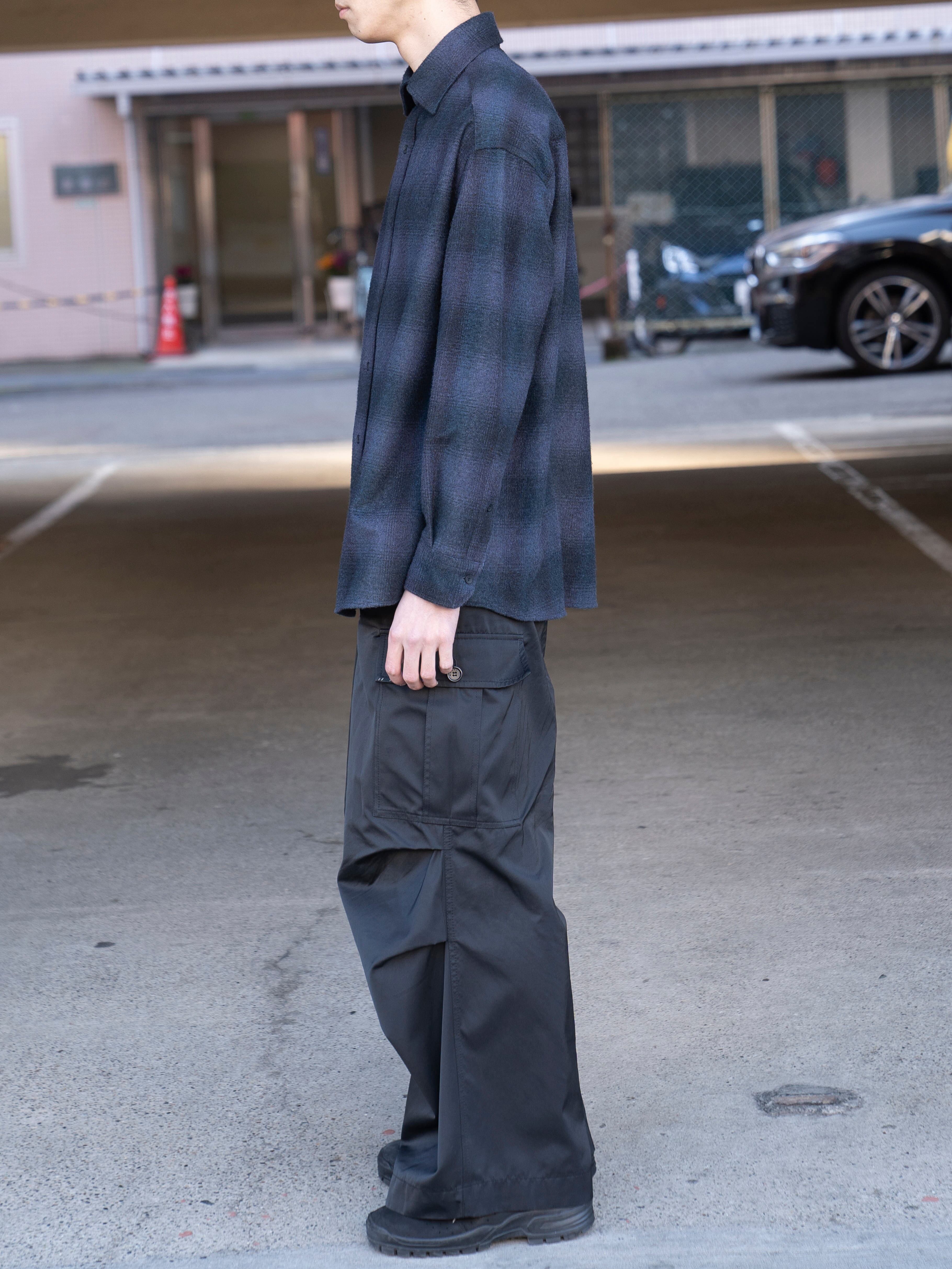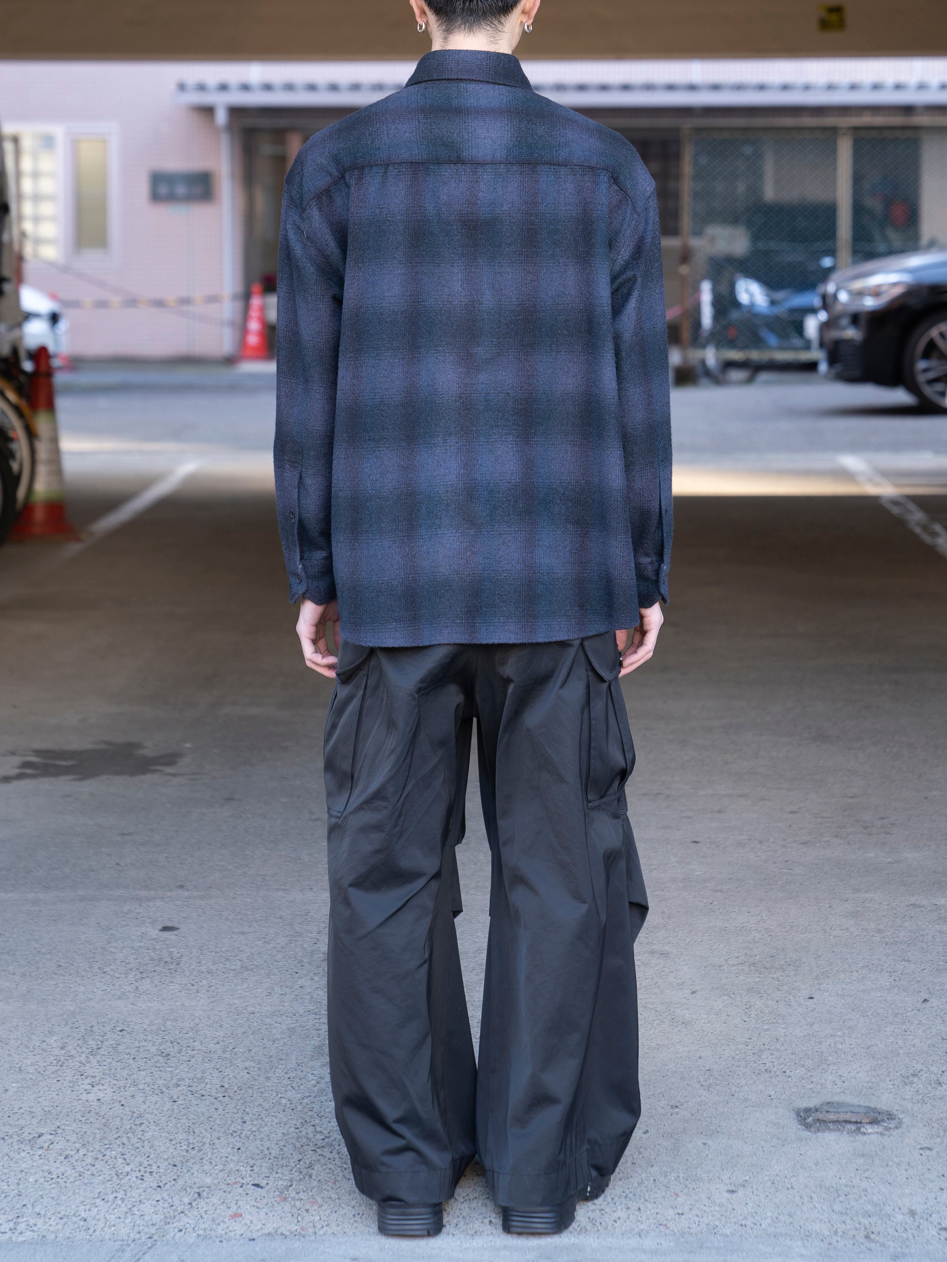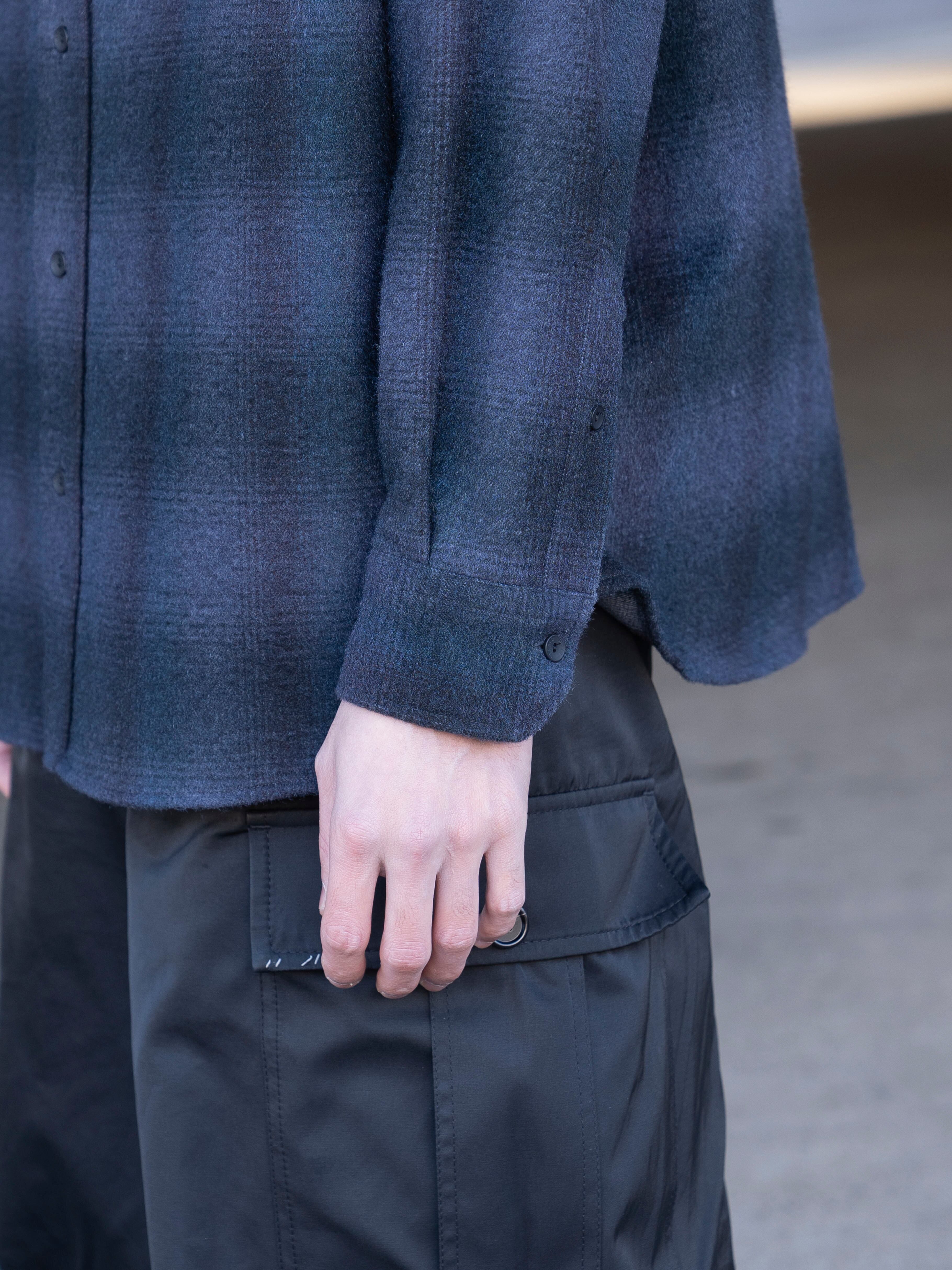 タテ糸に super140's のウール、ヨコ糸にタッサーシルク ( 野蚕 ) を使用したオンブレチェック。織組織は 1/2 の綾 ( タテ 1 に対してヨコ 2 の浮き ) にし、ややタテ糸の密度が高い規格になっています。 整理加工で起毛をした際、ヨコ糸が特に起毛の針にかかり毛足がでるのでチェック柄のバランスをとるために、タテ糸のカラーのコントラストを強くし、ヨコ糸のコントラストを弱くしています。織組織+密度+配色+濃度+整理加工のバランスが絶妙な生地です。