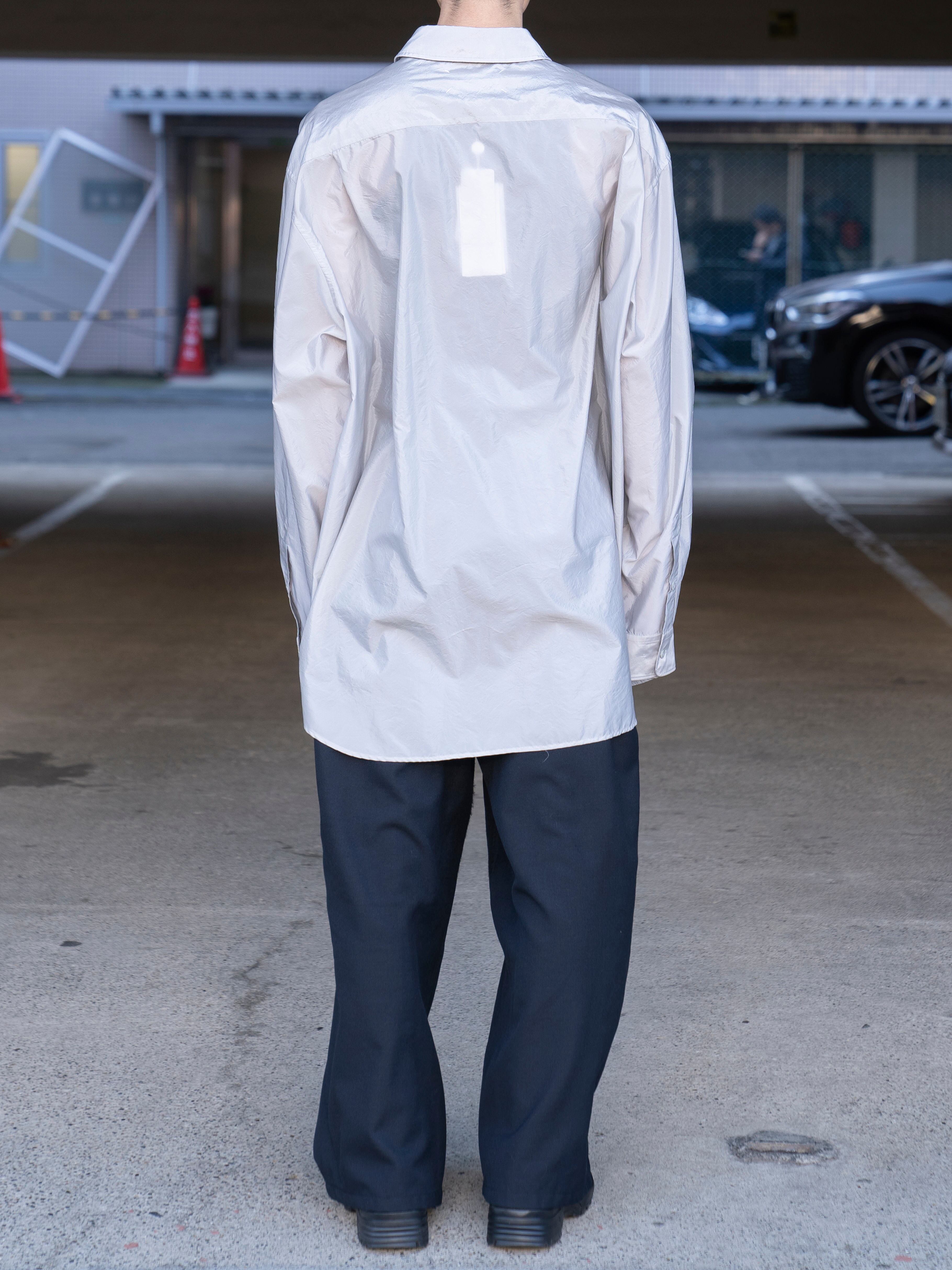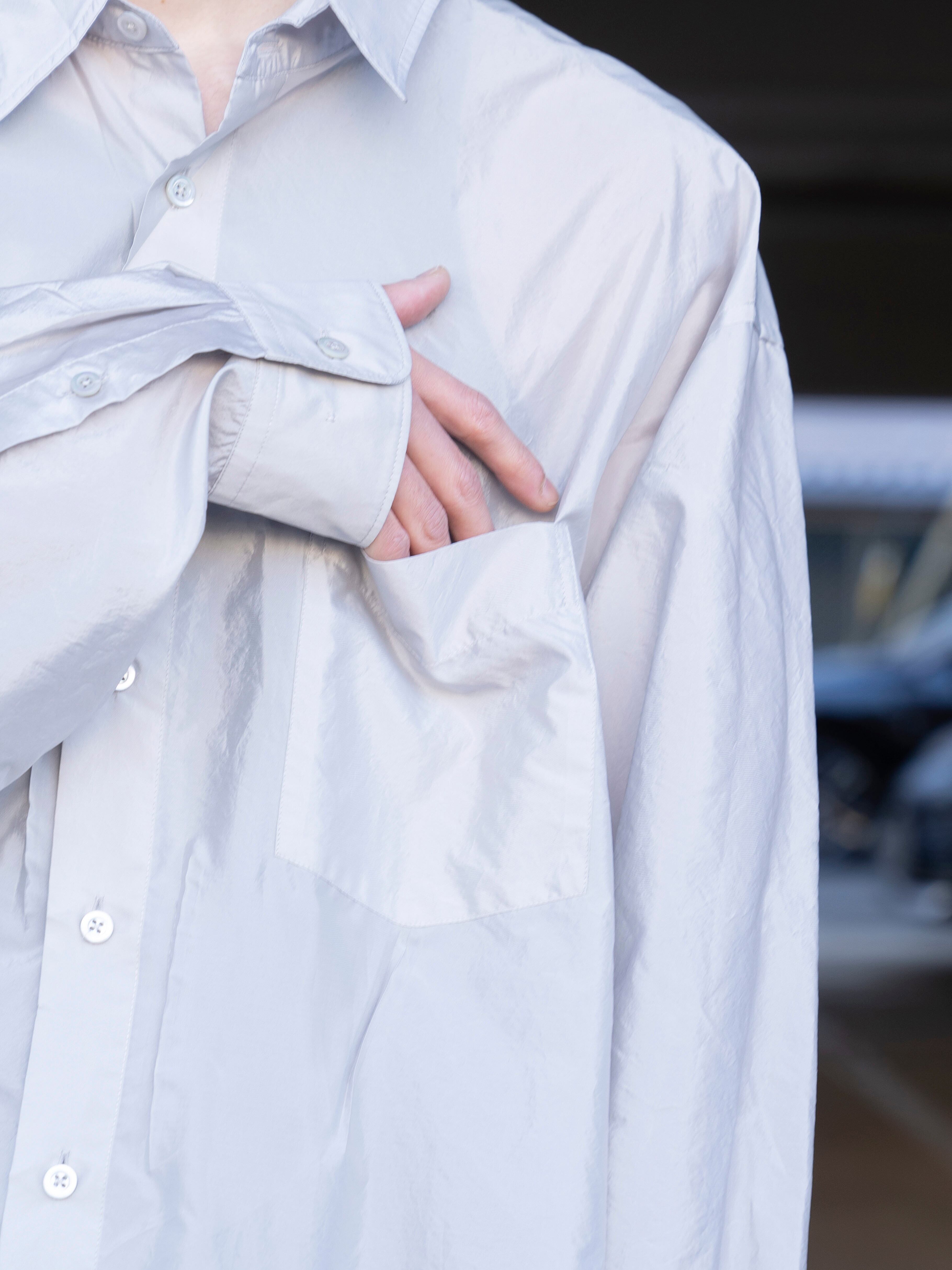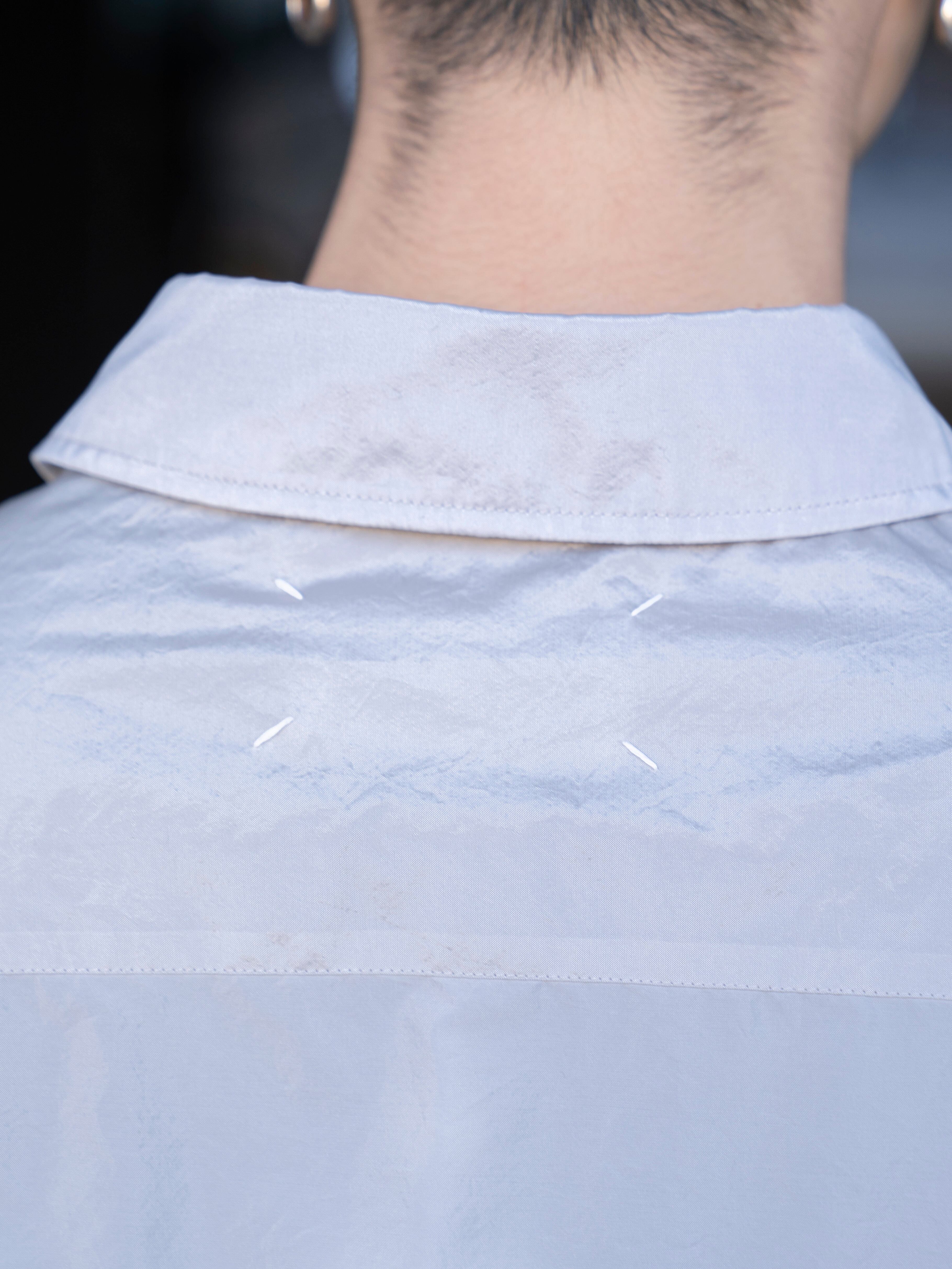 オーバーサイズのシルエットに、光と動きを捉える艶やかな生地を使用。「メモリー・オブ・ザ・クリース」テクニック(しわの記憶を表現する加工)によって、表面に現れるかすかな不規則性を生み、着用と動作の痕跡が洗練された“生きたエレガンス”を表現します。バックにはメゾン マルジェラのシグネチャーである4本の白いステッチが入り、ラベルの代わりとして存在感を放ちます。