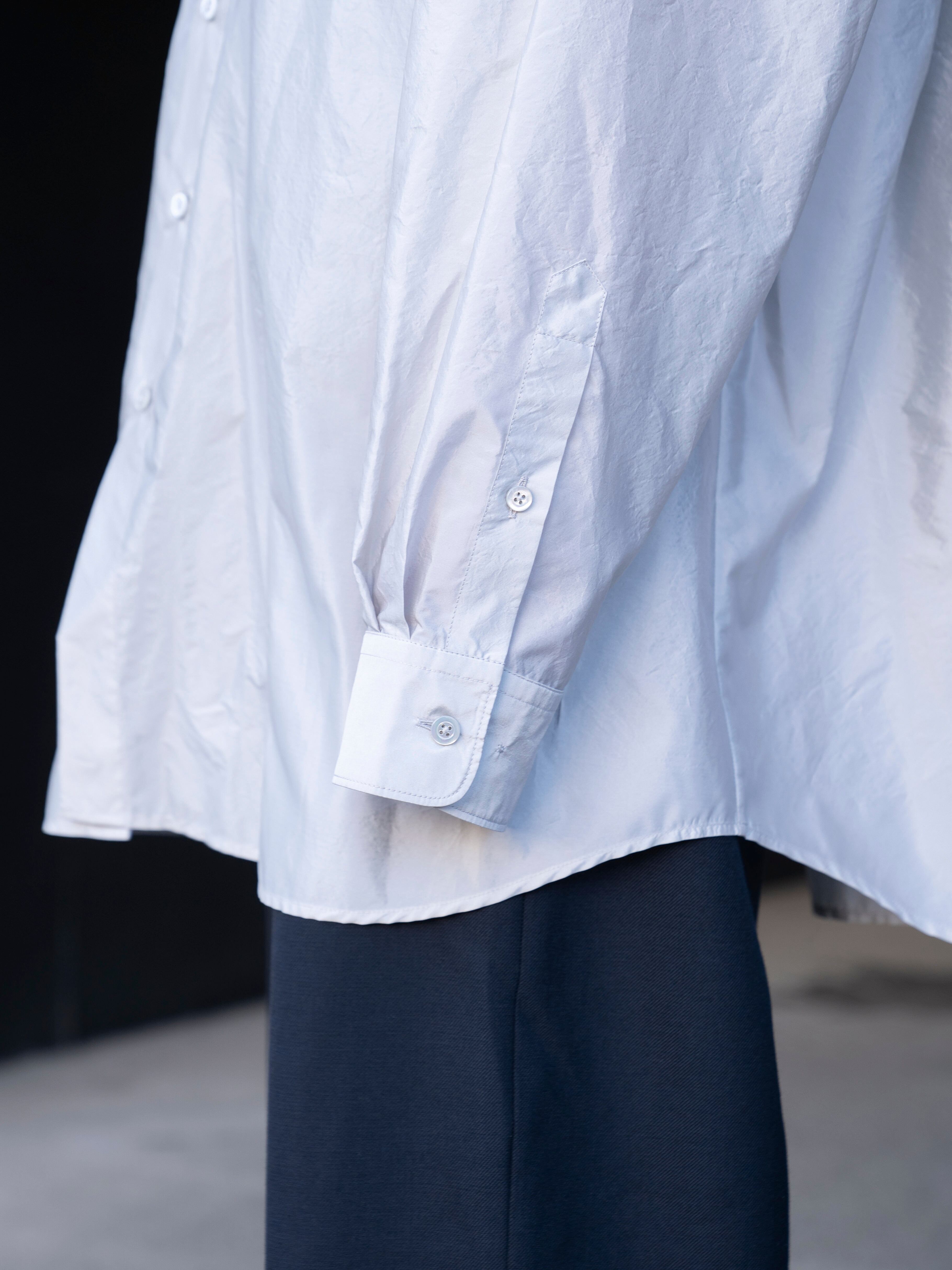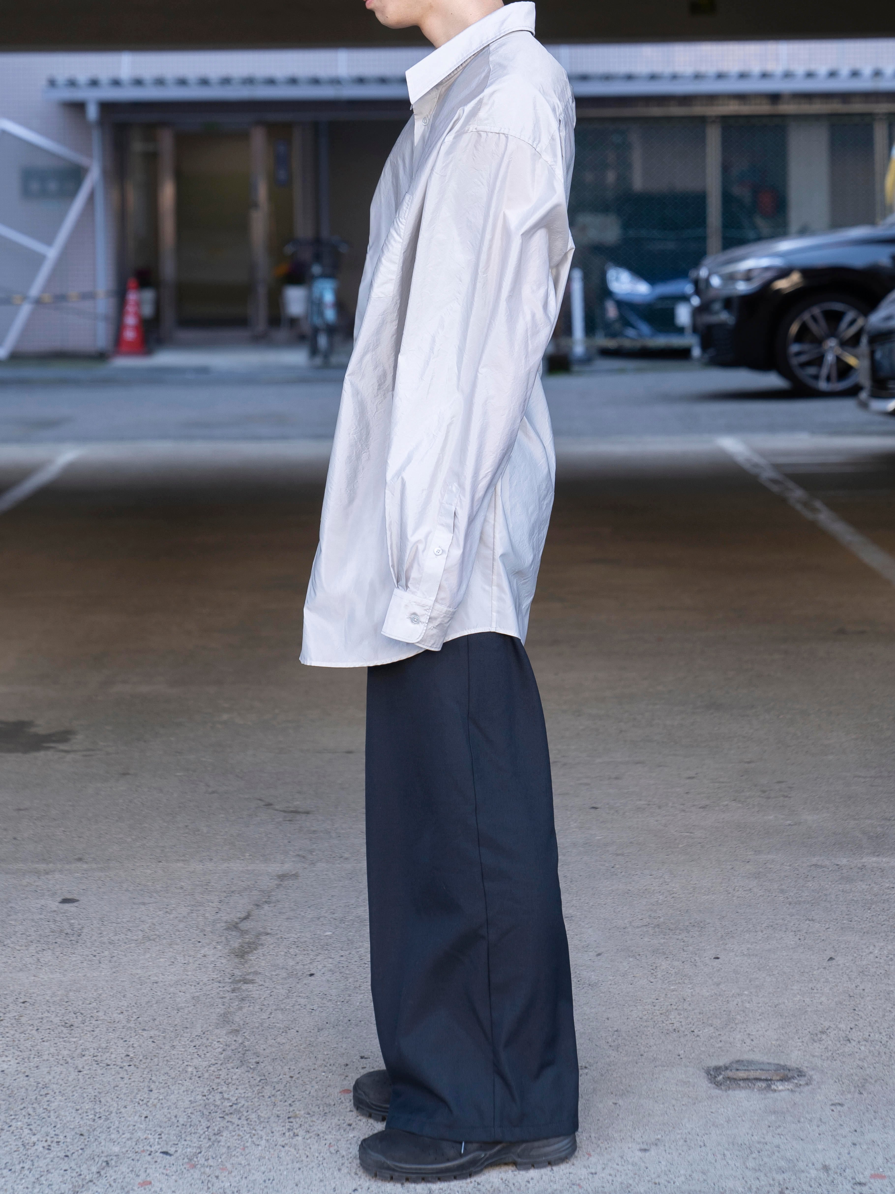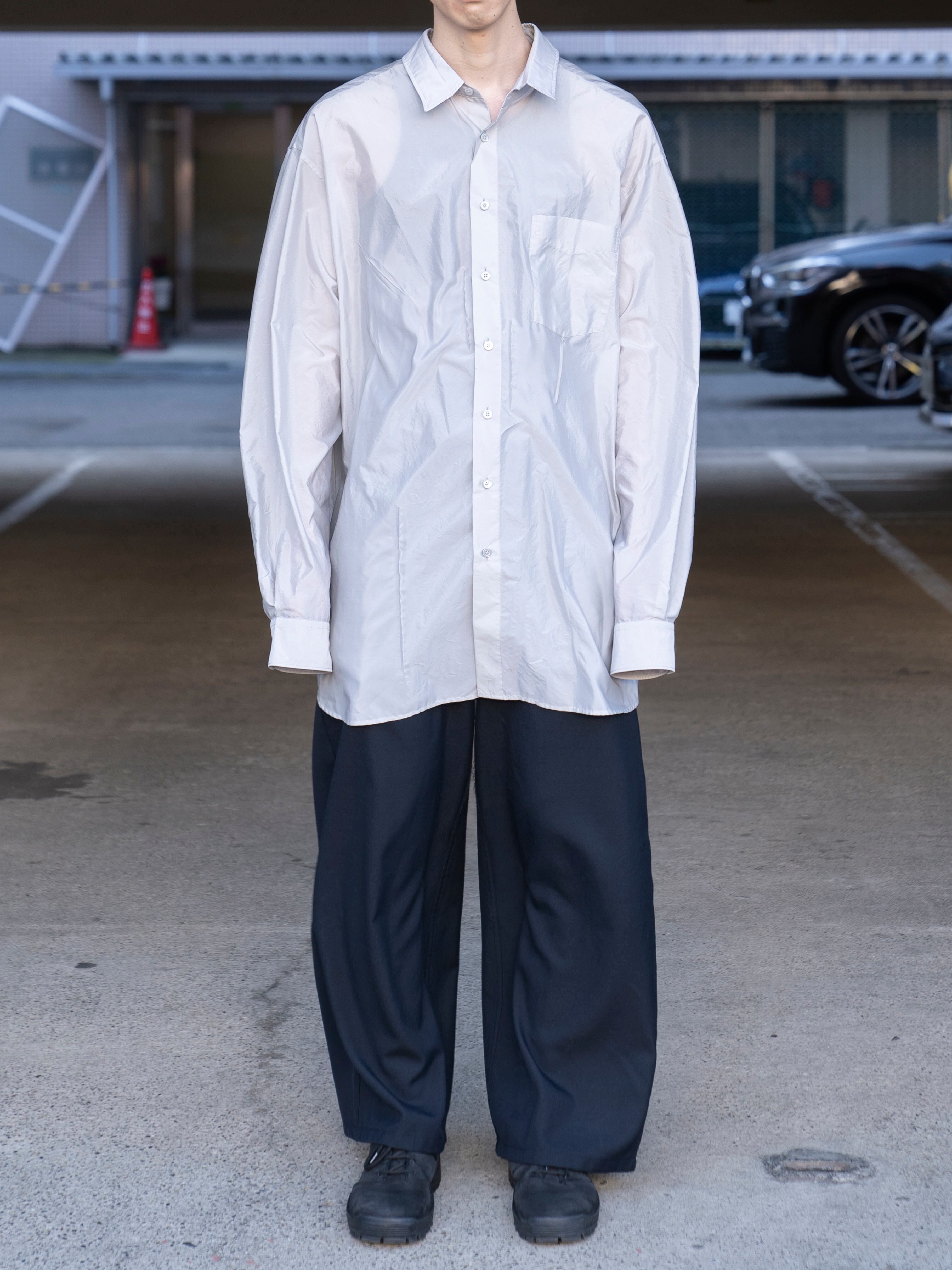 オーバーサイズのシルエットに、光と動きを捉える艶やかな生地を使用。「メモリー・オブ・ザ・クリース」テクニック(しわの記憶を表現する加工)によって、表面に現れるかすかな不規則性を生み、着用と動作の痕跡が洗練された“生きたエレガンス”を表現します。バックにはメゾン マルジェラのシグネチャーである4本の白いステッチが入り、ラベルの代わりとして存在感を放ちます。