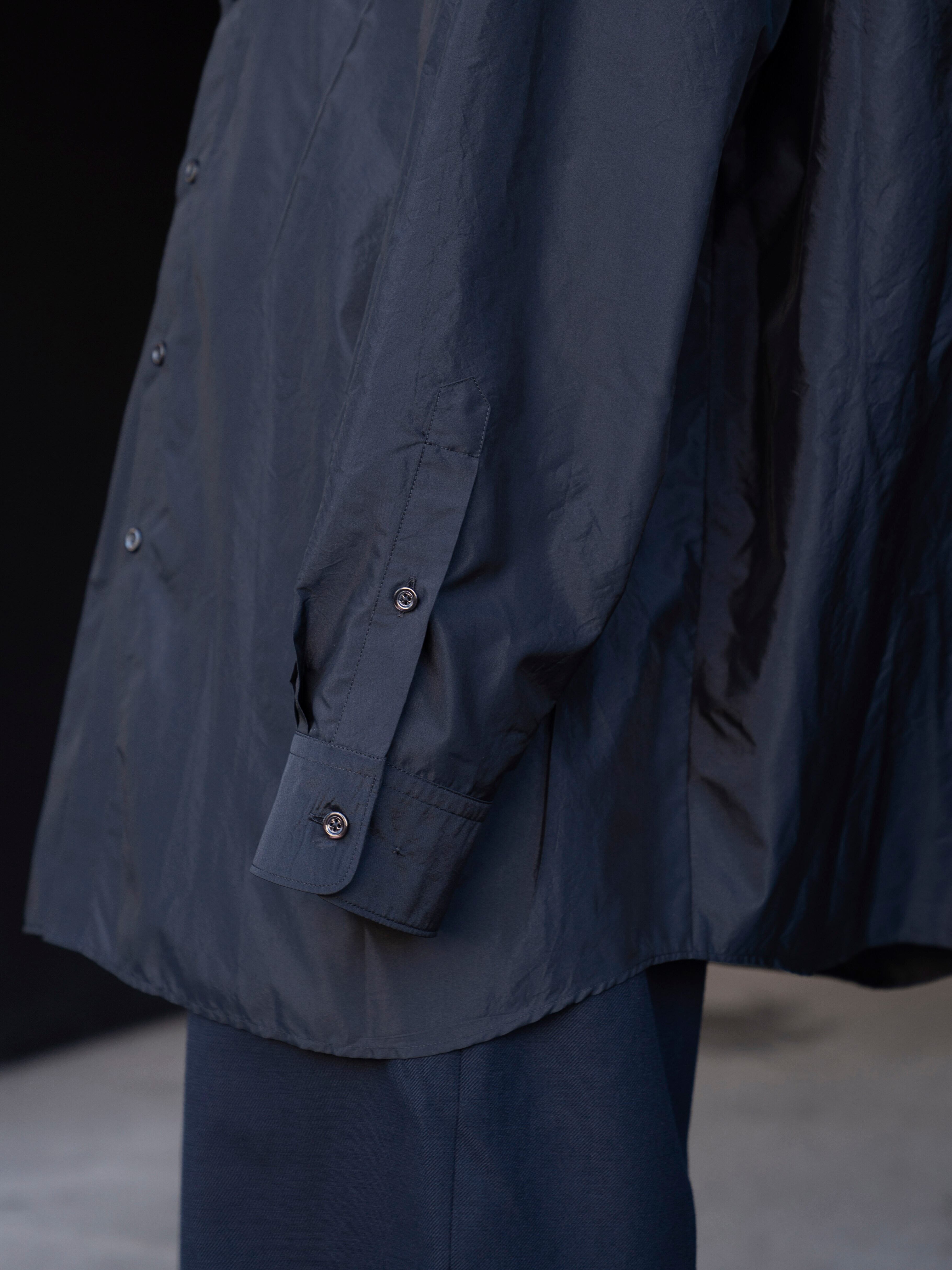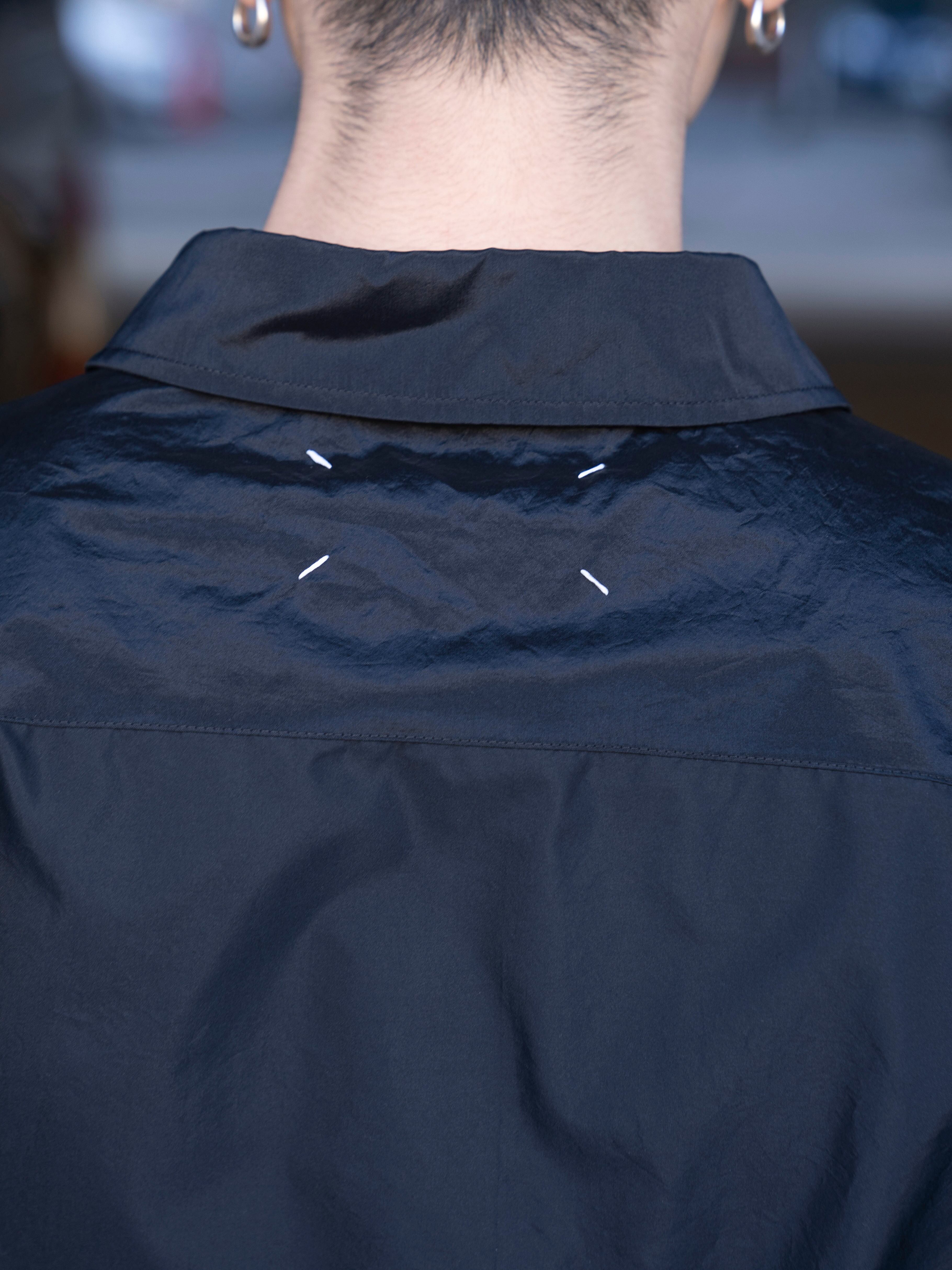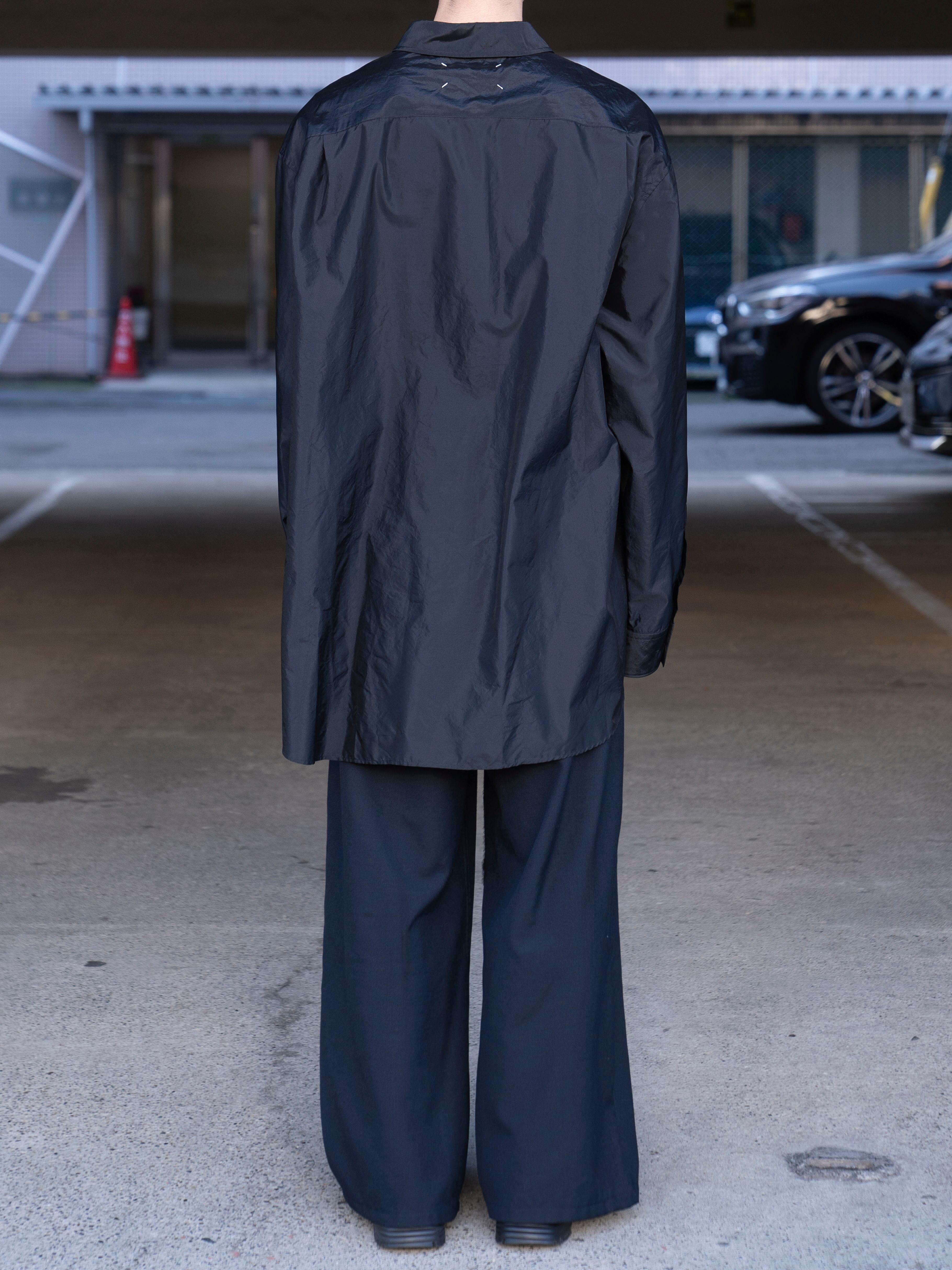 オーバーサイズのシルエットに、光と動きを捉える艶やかな生地を使用。「メモリー・オブ・ザ・クリース」テクニック(しわの記憶を表現する加工)によって、表面に現れるかすかな不規則性を生み、着用と動作の痕跡が洗練された“生きたエレガンス”を表現します。バックにはメゾン マルジェラのシグネチャーである4本の白いステッチが入り、ラベルの代わりとして存在感を放ちます。