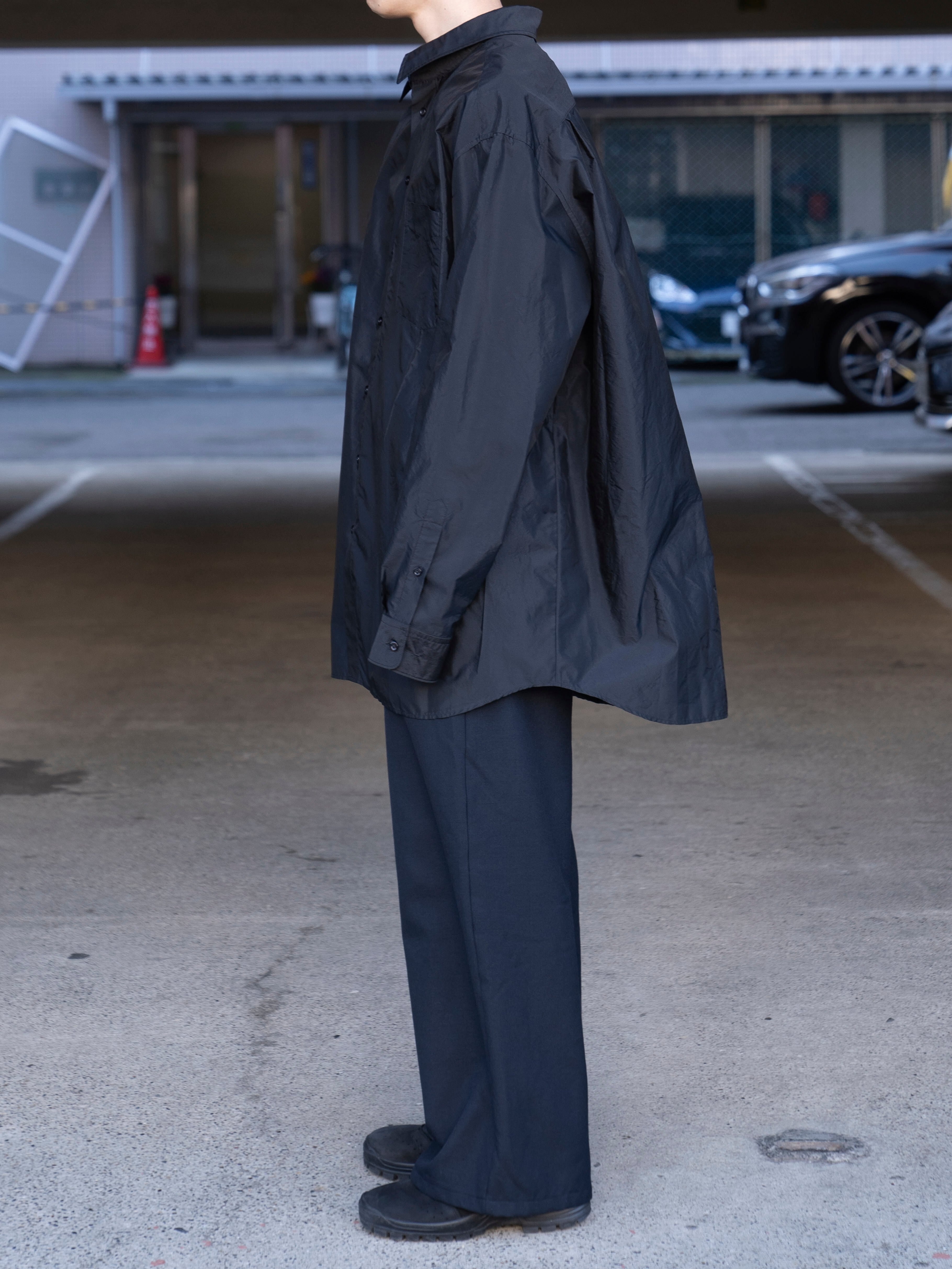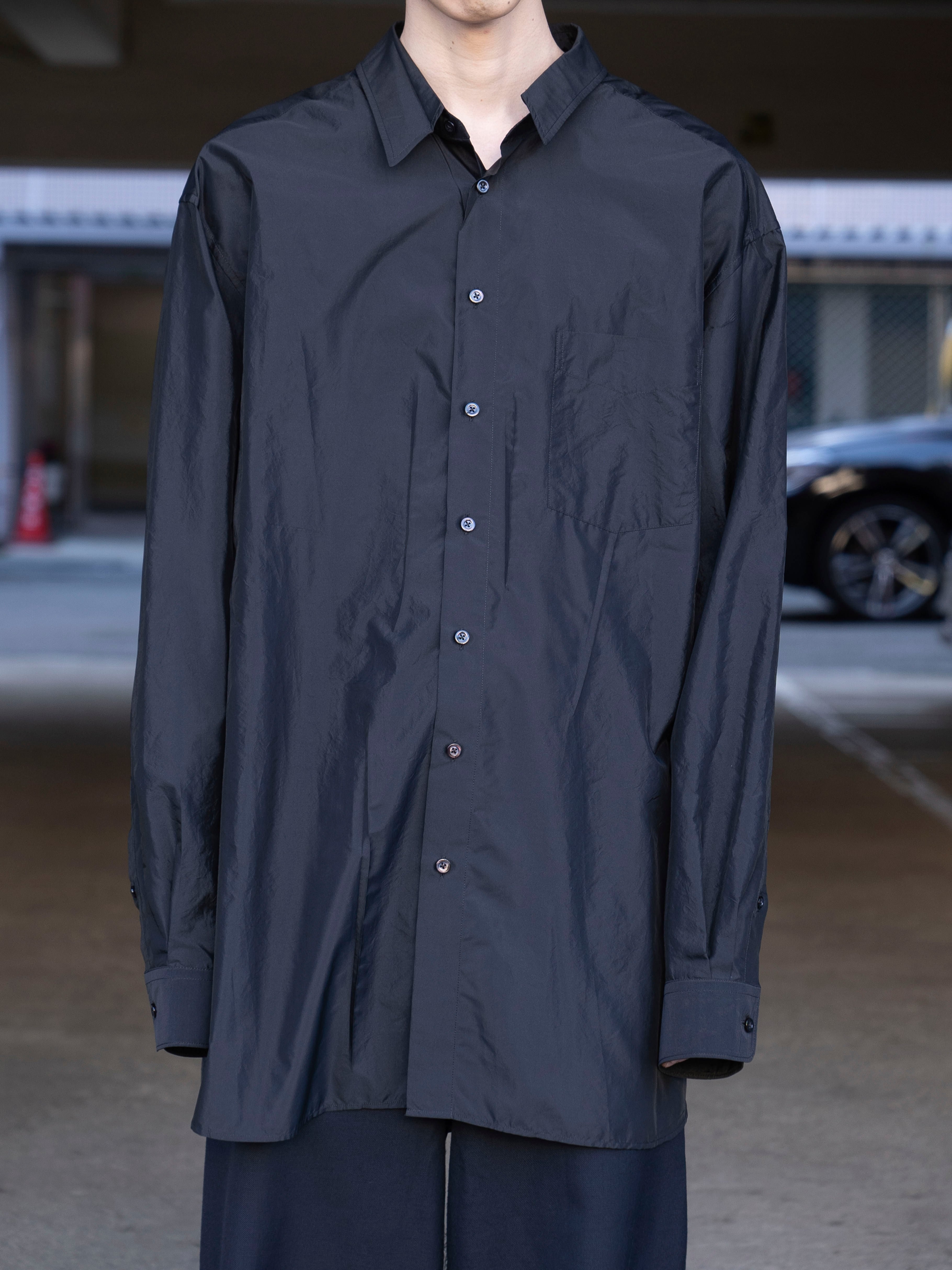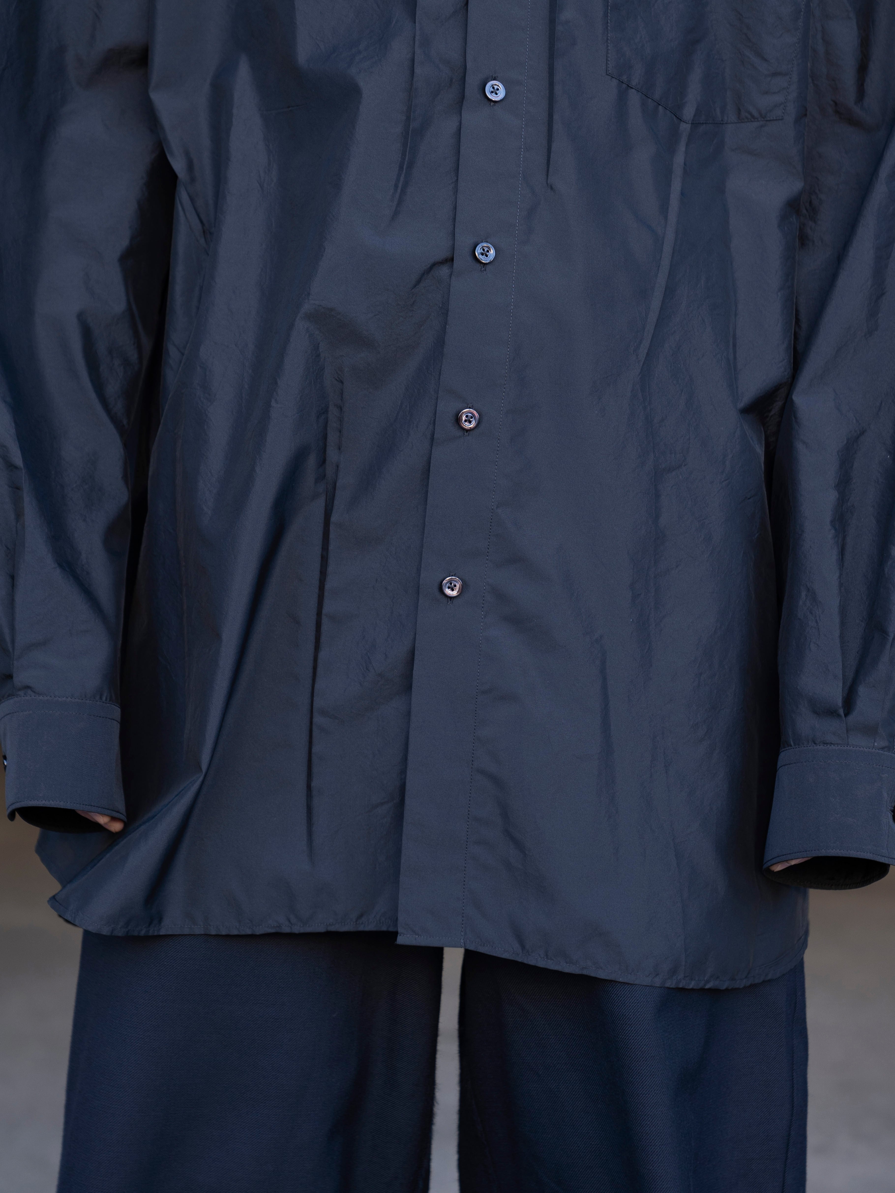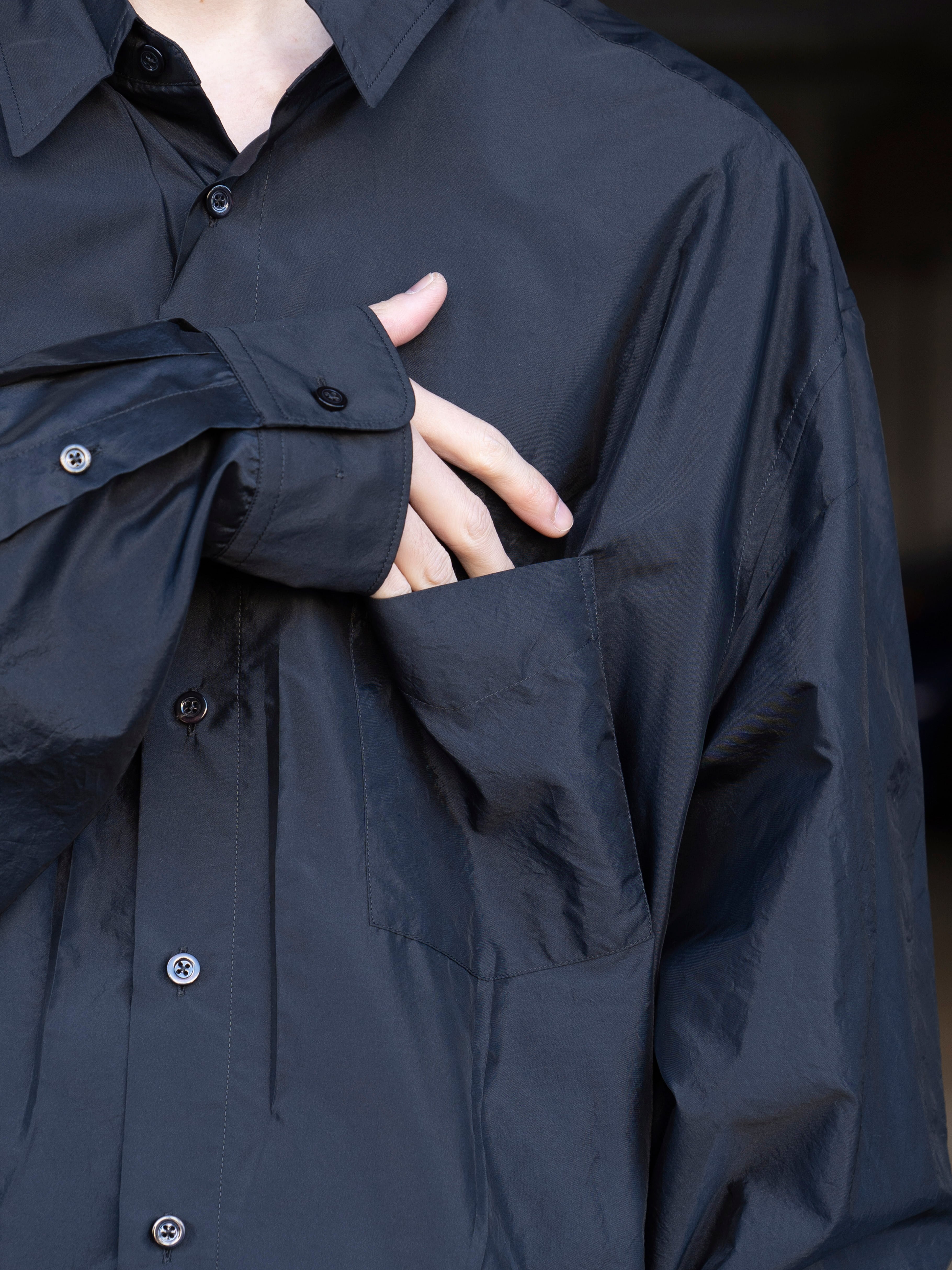 オーバーサイズのシルエットに、光と動きを捉える艶やかな生地を使用。「メモリー・オブ・ザ・クリース」テクニック(しわの記憶を表現する加工)によって、表面に現れるかすかな不規則性を生み、着用と動作の痕跡が洗練された“生きたエレガンス”を表現します。バックにはメゾン マルジェラのシグネチャーである4本の白いステッチが入り、ラベルの代わりとして存在感を放ちます。