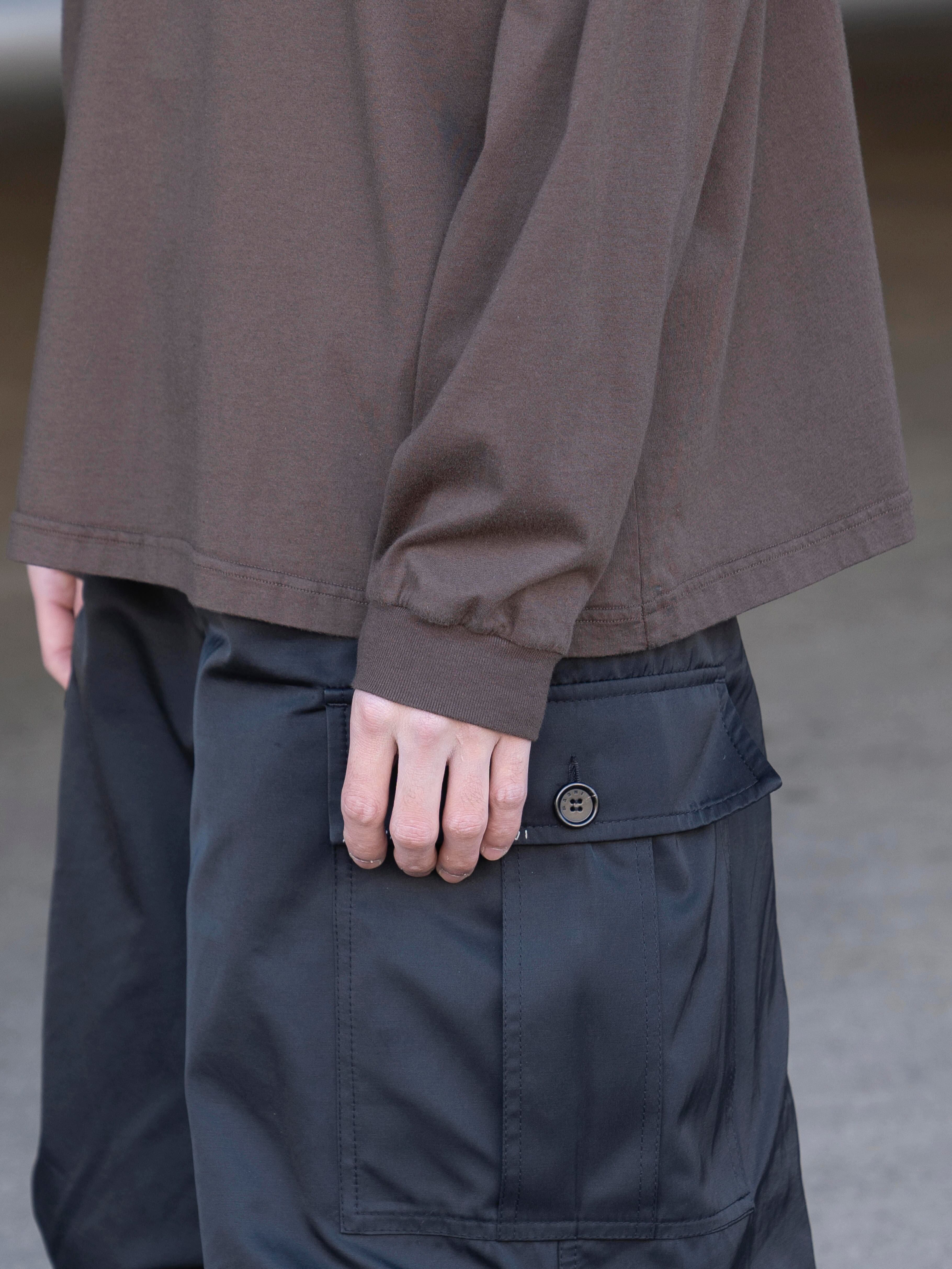 同糸の特徴は光沢感と綿花の油分から取れる天然のぬめり感やしなやかさです。それらを最大限に活かすため、微起毛加工を生地表現に施し製品染めで風合い良く仕上げました。洗い加工を施しているためご自宅の洗濯機で洗ってもほとんど縮むことなくお手入れがすることができます。