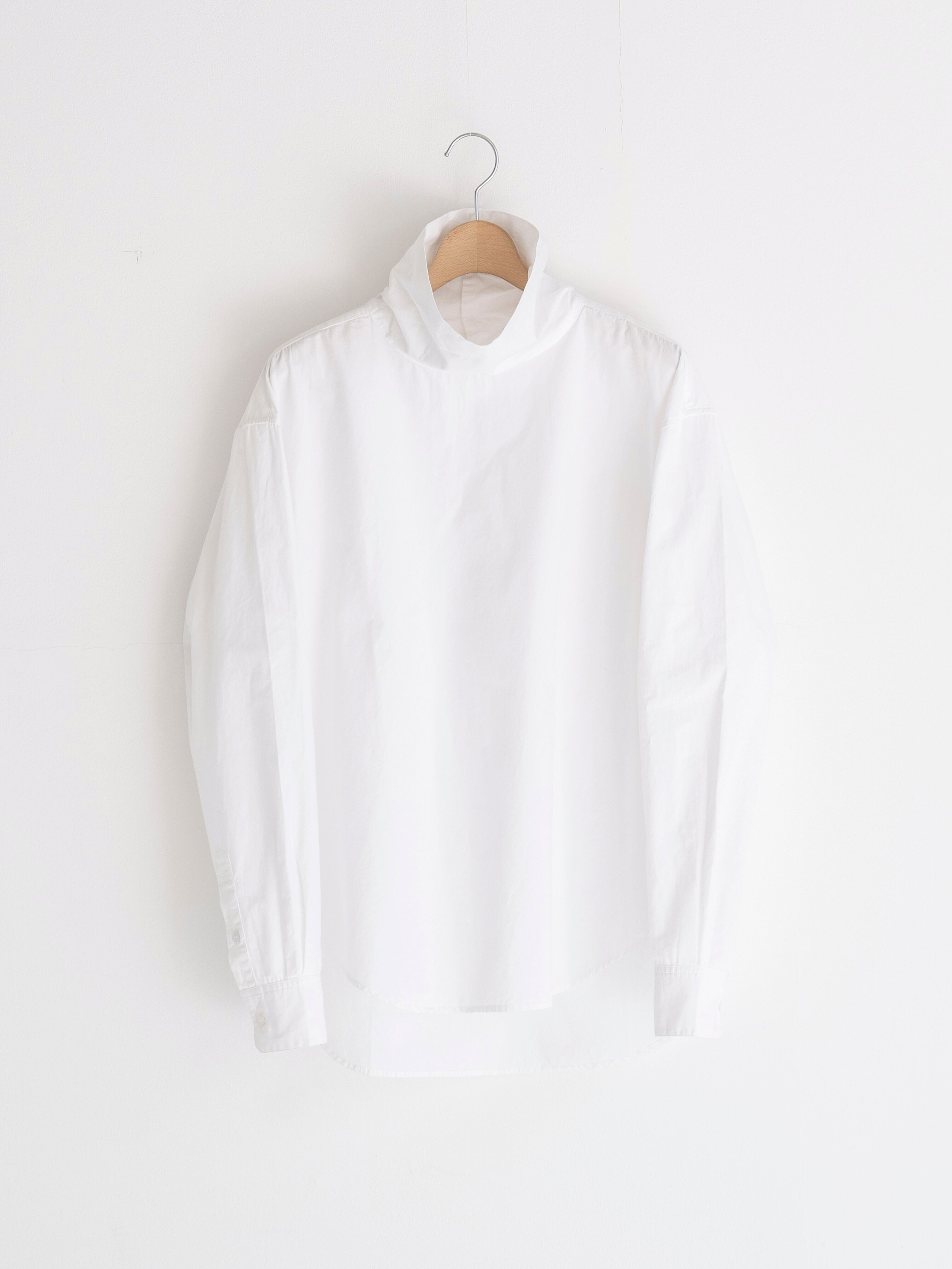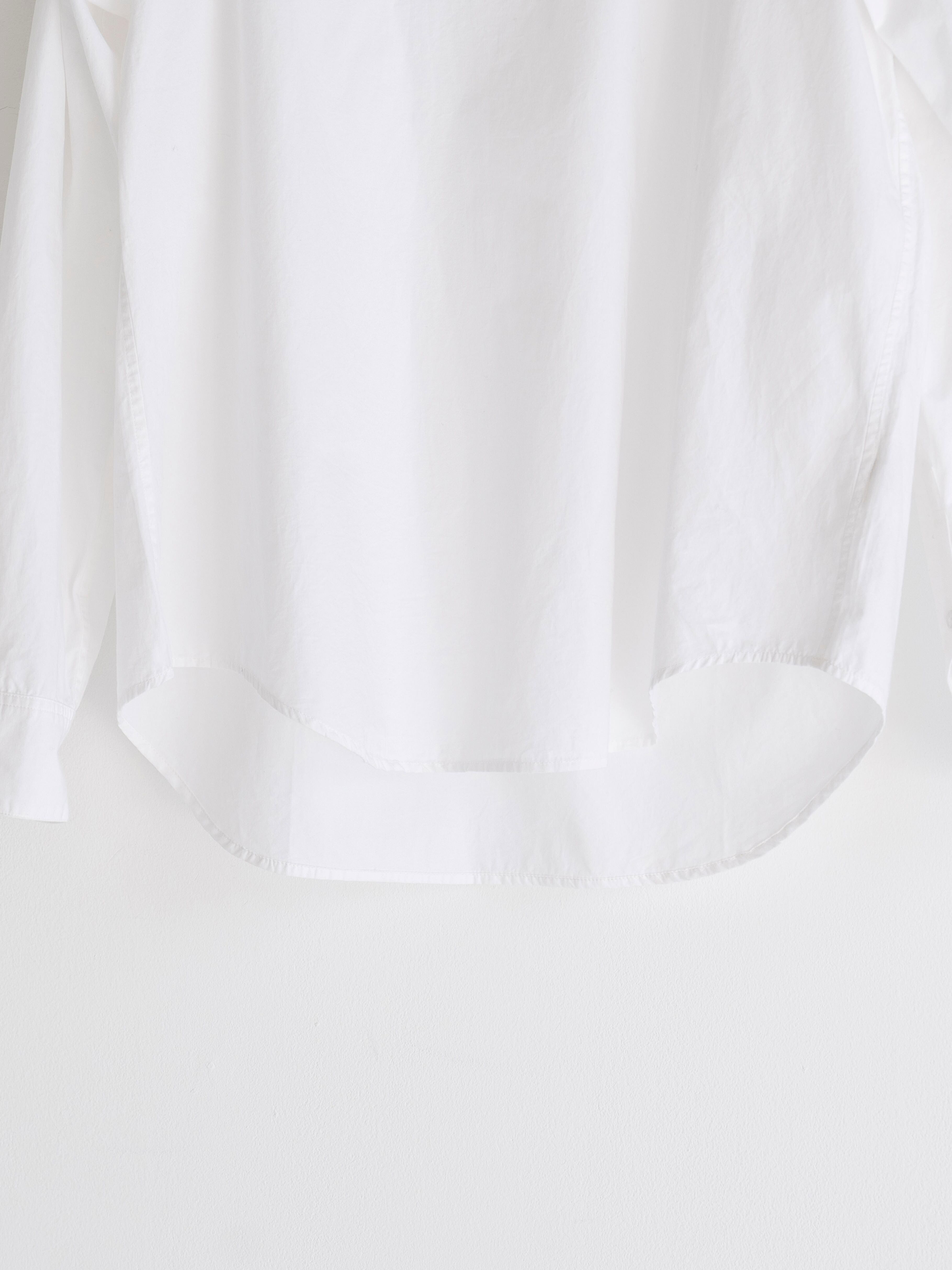 コットン100%のプルオーバー仕様になっており、バックのボタンで着脱可能となっております。リラックスフィットで身幅はやや広め、着丈はやや長めの設定です。シャツメインとしてお使い頂いても、カーディガンやライトアウターを羽織り、レイヤードとしてもお使い頂けるアイテムです。