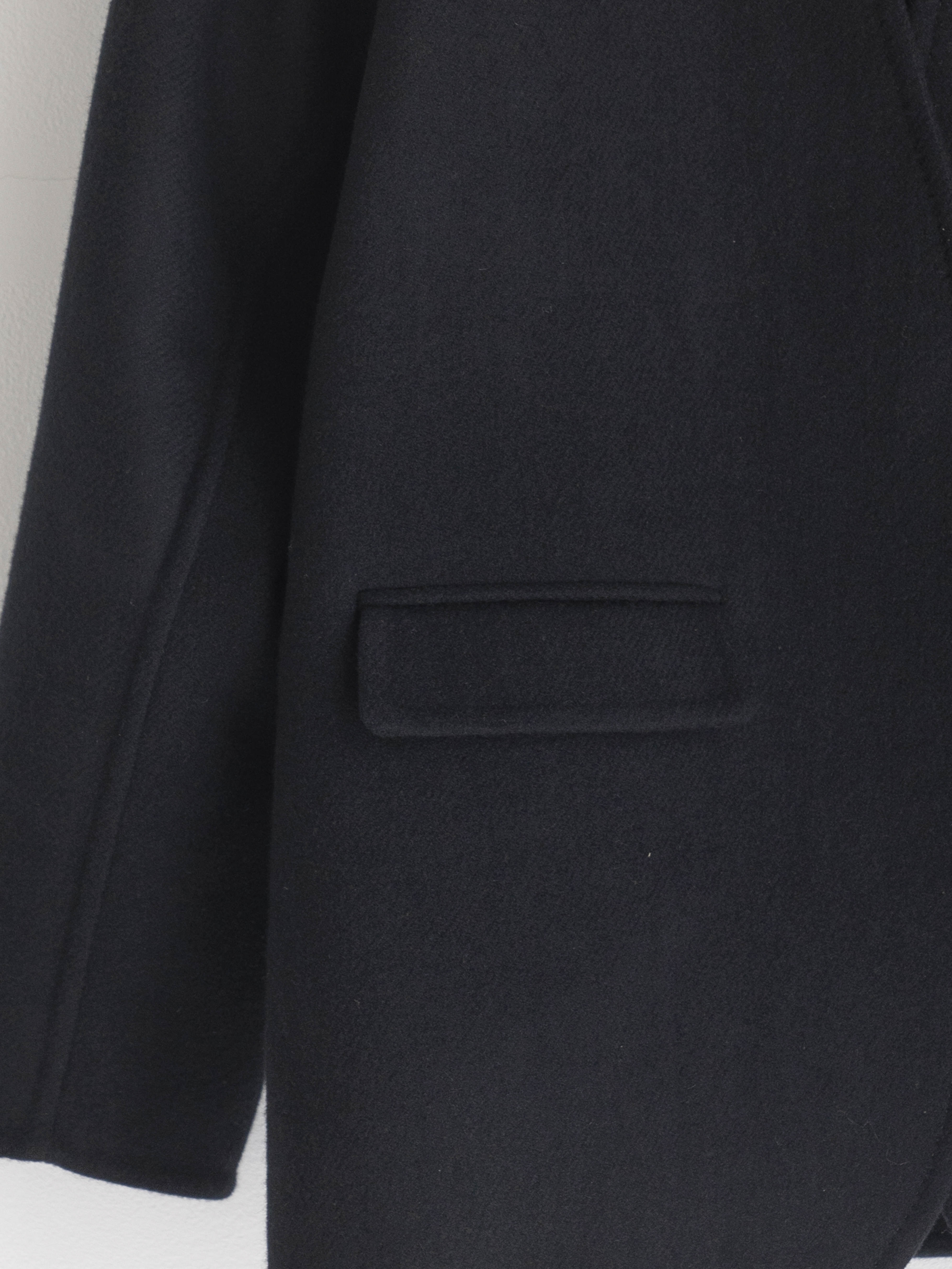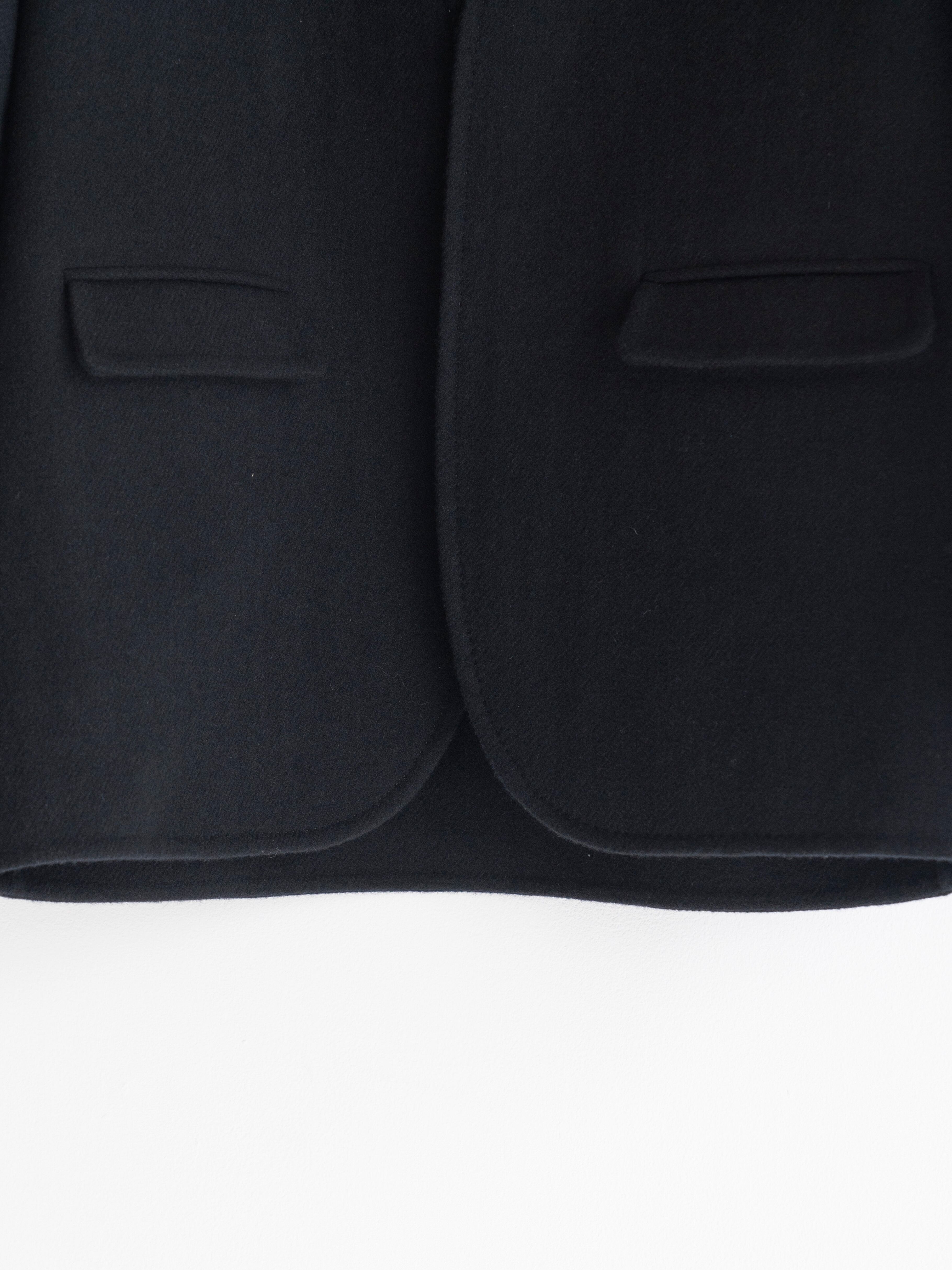 SUPER 120’ S の高級ウールを使用したリバーシブルウール素材。タテ 2/16 X ヨコ 2/16 で織り、綿の接結糸で繋げる 2/2 綾の二重織。 太番手の糸を二重織でおり、さらに縮絨仕上げをしていることで肉感のある素材に仕上げています。縮絨加工が原料の良さを引き立たせ、 肉厚ながらしなやかさを持つメルトンです。着用したときの軽さを実現するために本縫いではなくすべてハンドの工程で仕上げられるリバー縫製で製品にしています。