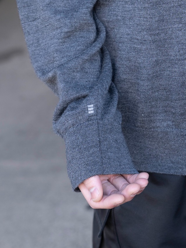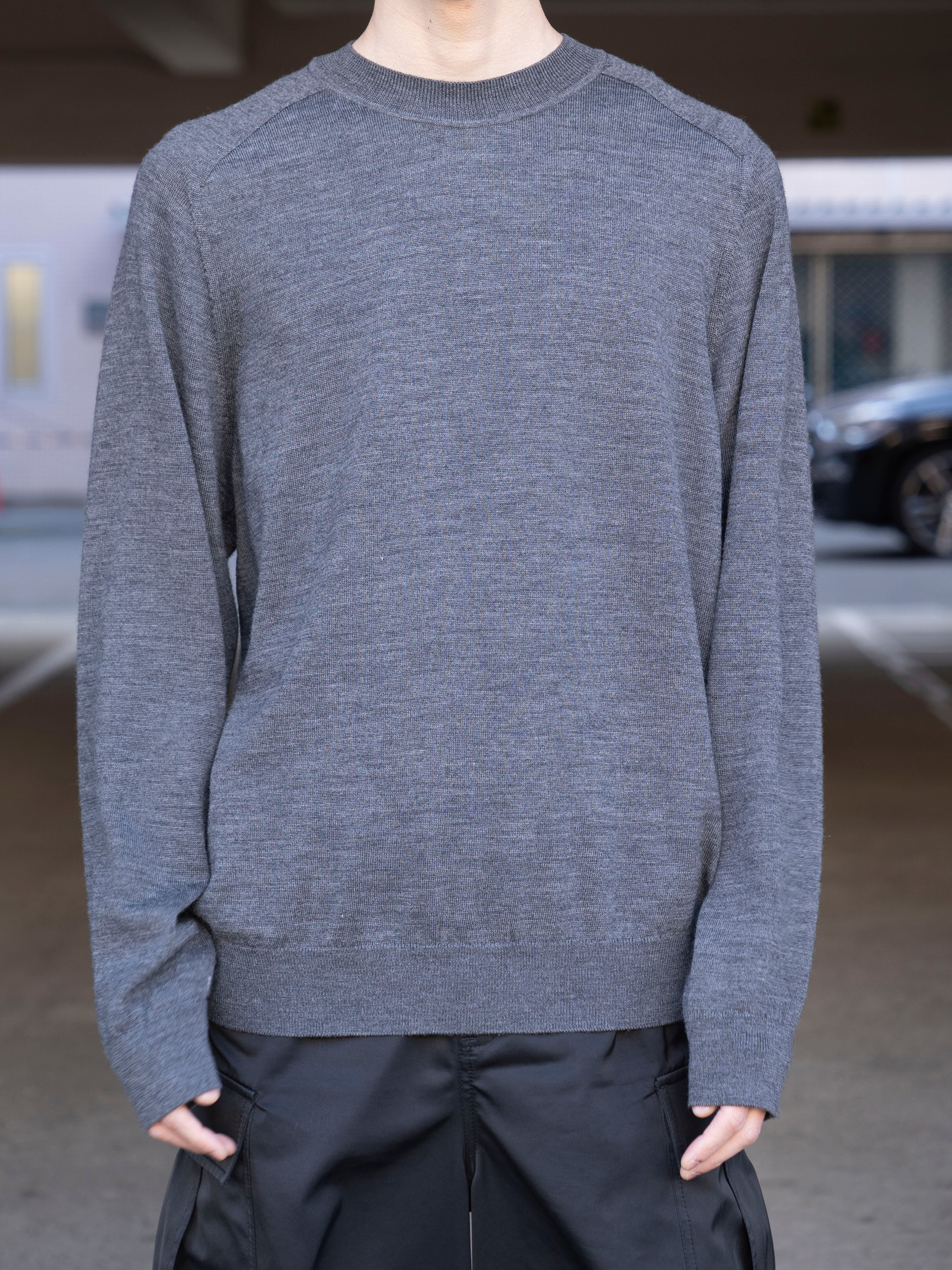 ミドルゲージのクルーネックプルオーバー。 サドルスリーブによるタイムレスなデザインで編み上げたクルーネックは、特に首のつまり具合とサドルショルダーの幅にこだわった1枚。 トップスは首回り付近に一番目がいくアイテムであるが、適度なリブ幅と開き過ぎないクルーネックは、胸板が厚くても薄くても首元を上品に見せてくれ、そこにつながるサドルショルダーの幅も邪魔しない程度にその首元の品の良さにつながるよう何度も作り直して設計されたサイズ感。