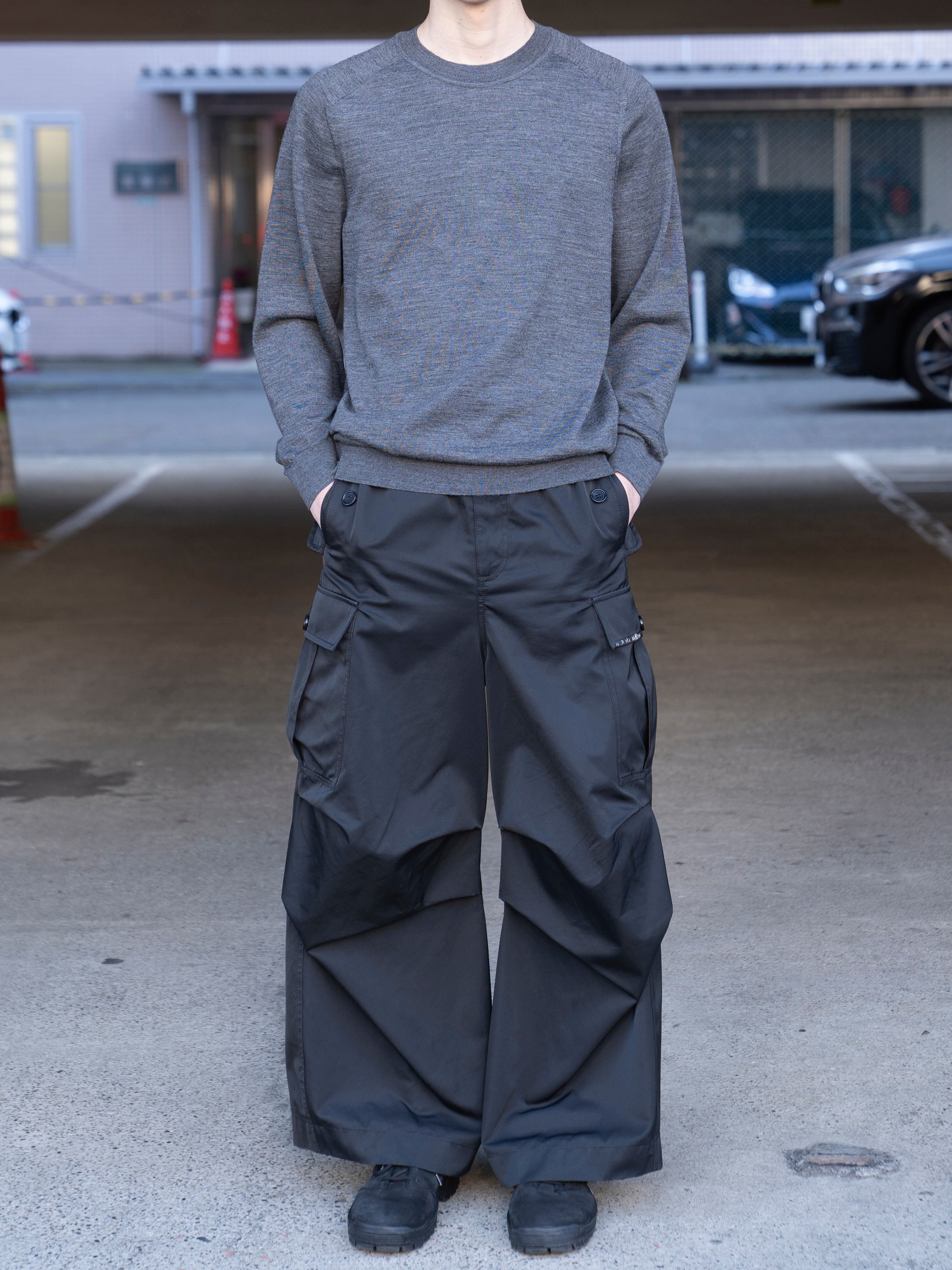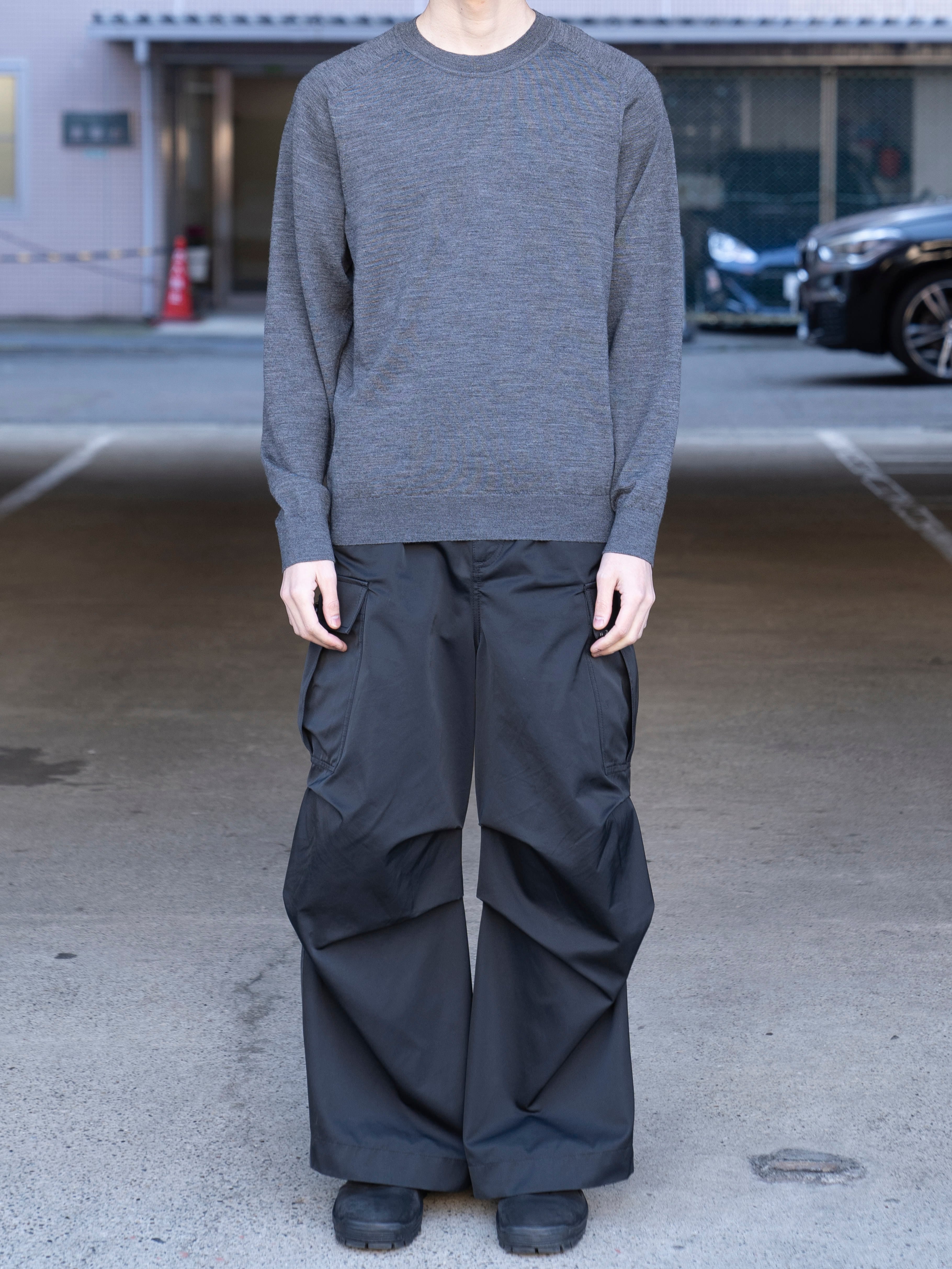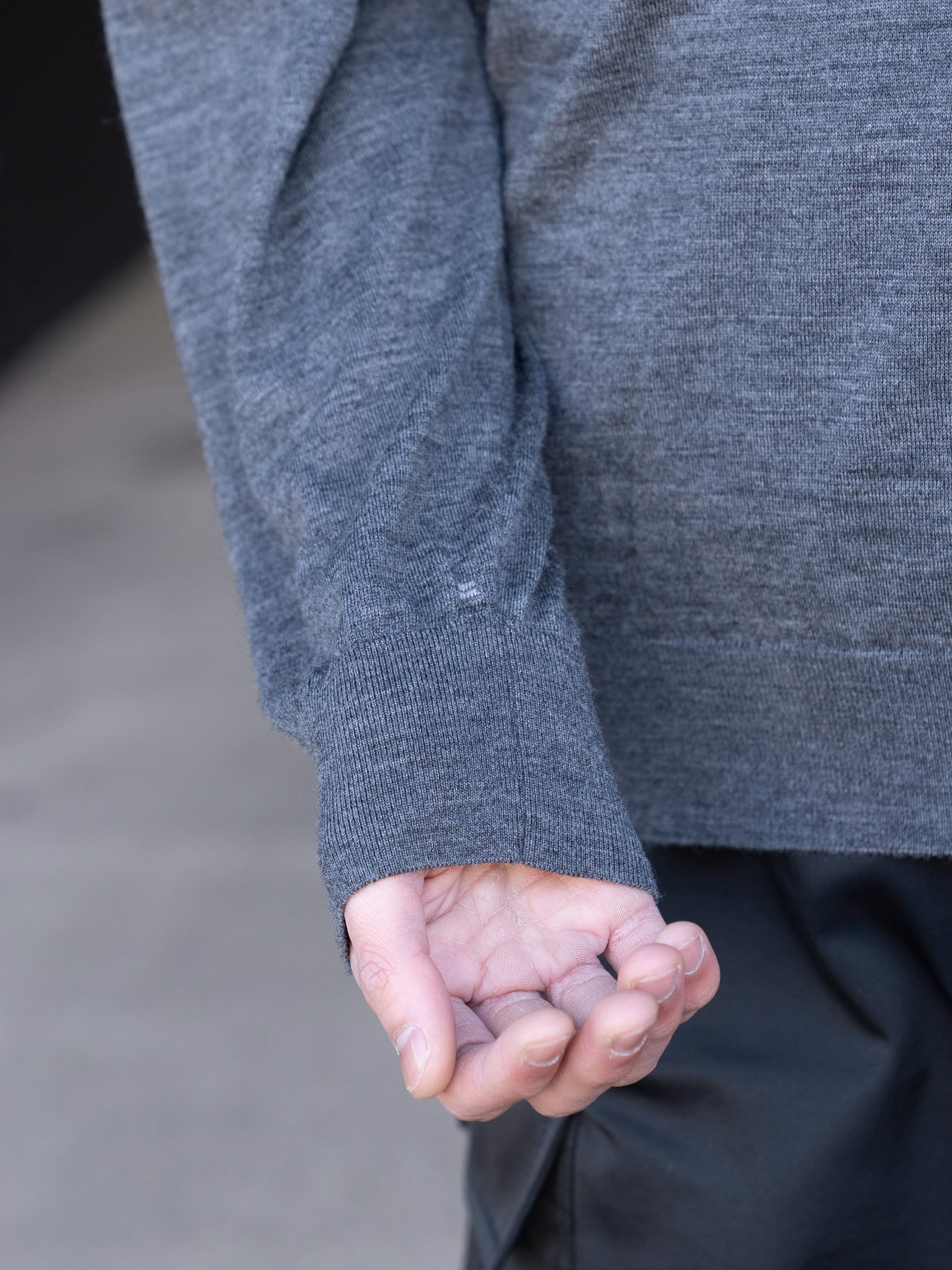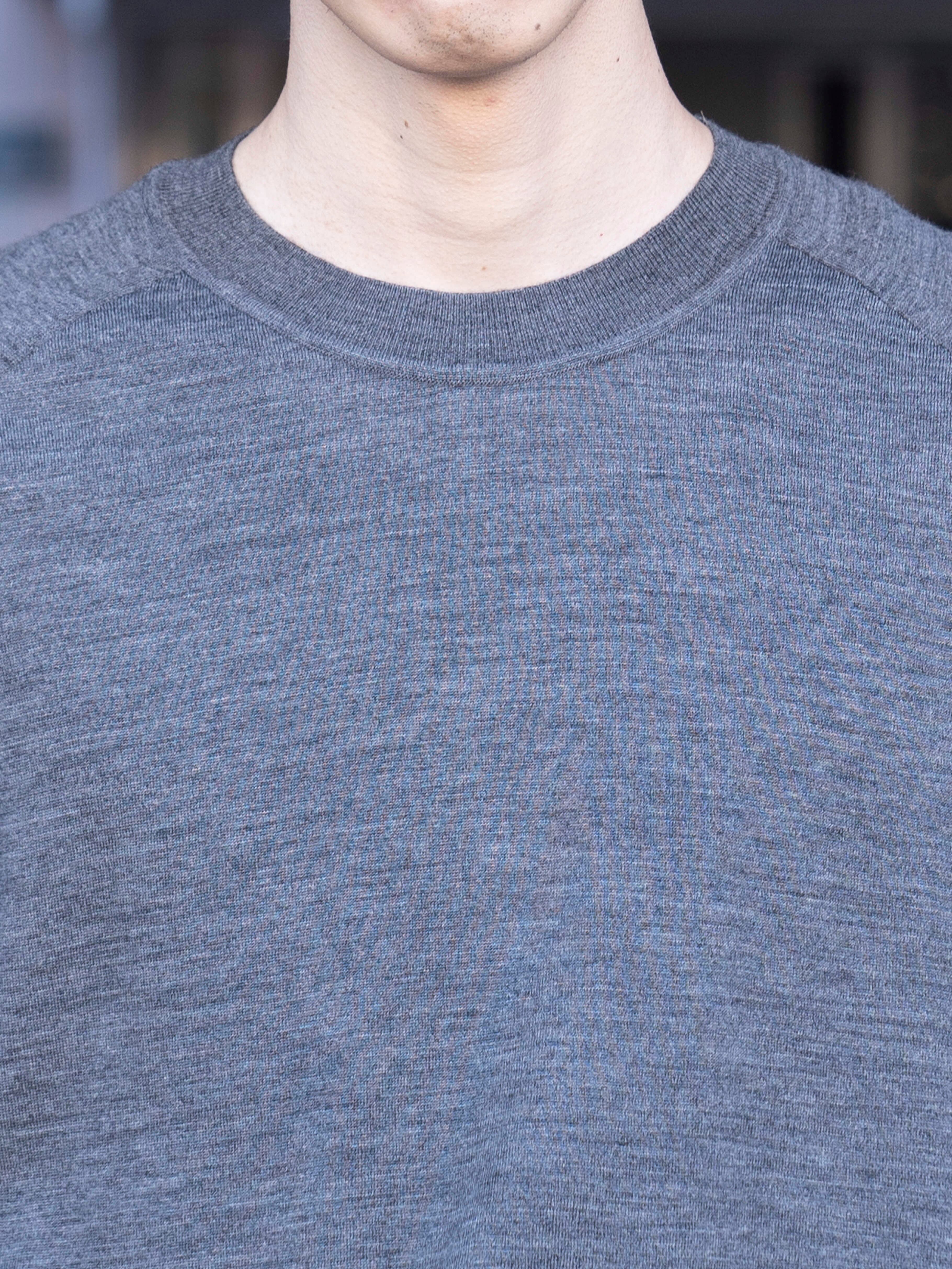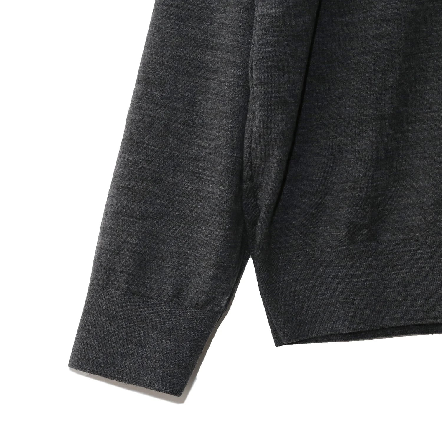 ハイゲージのクルーネックプルオーバー。 サドルスリーブによるタイムレスなデザインで編み上げたクルーネックは、特に首のつまり具合とサドルショルダーの幅にこだわった1枚。 トップスは首回り付近に一番目がいくアイテムであるが、適度なリブ幅と開き過ぎないクルーネックは、胸板が厚くても薄くても首元を上品に見せてくれ、そこにつながるサドルショルダーの幅も邪魔しない程度にその首元の品の良さにつながるよう何度も作り直して設計されたサイズ感。