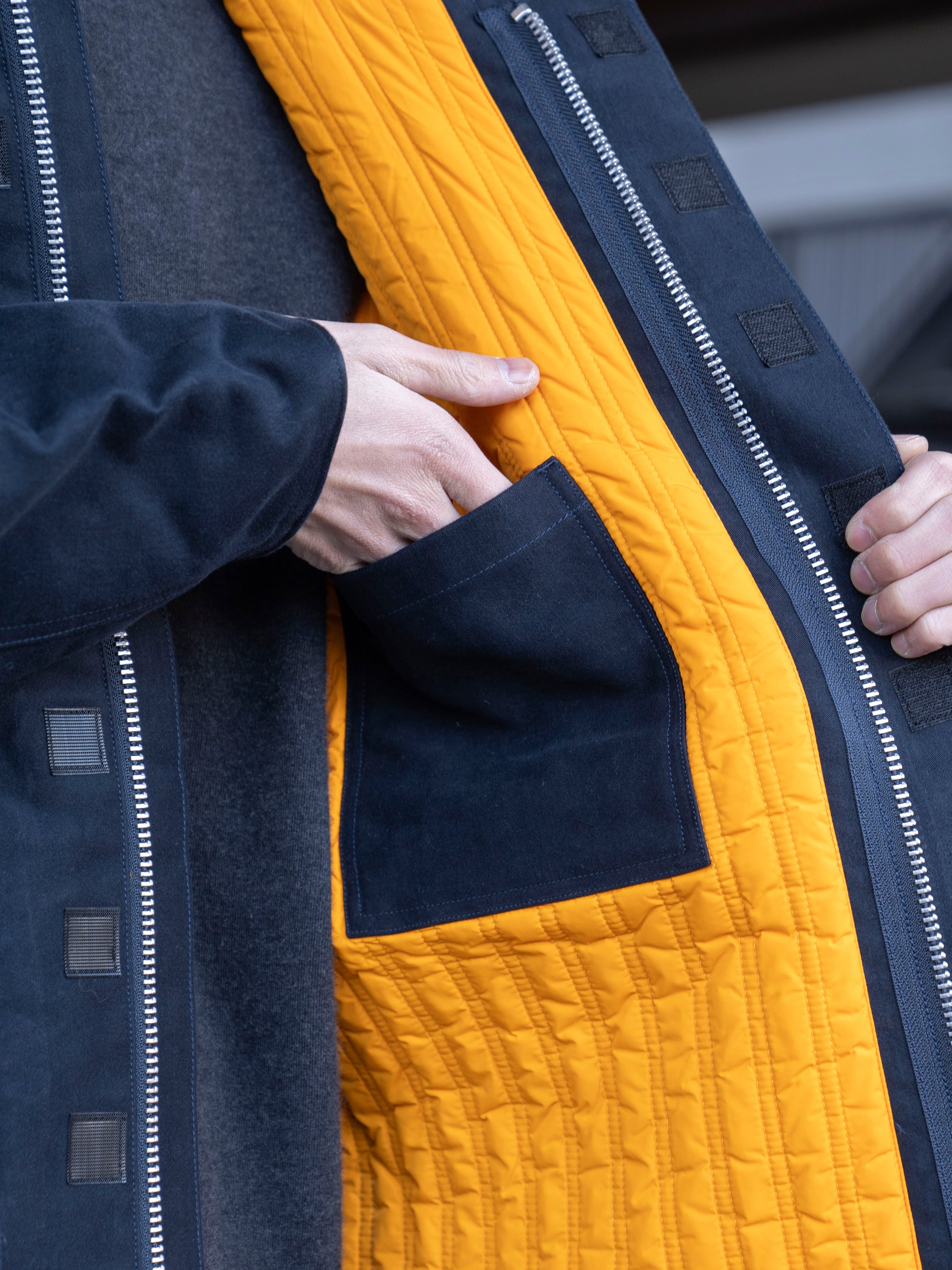 背面にアクションプリーツを備え動きやすく、前面にハンドポケット2つ、胸当てポケット2つを備えております。ダブルジップ、マジックテープパッチ留め。袖口内側にはリブを備え、風の侵入を防ぐ仕様になっております。