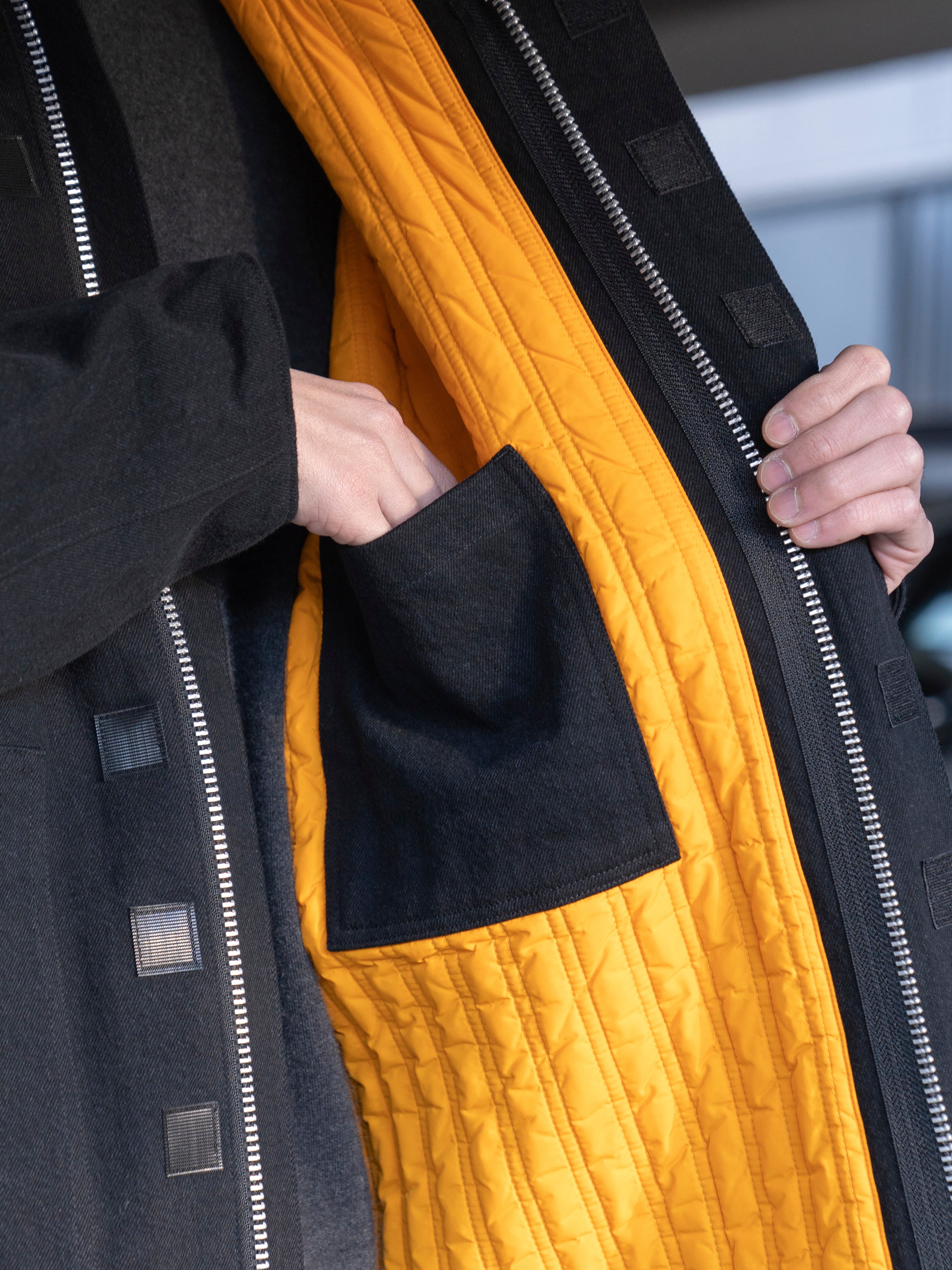 裏地は、撥水加工済のリサイクルナイロンを採用。詰め物は、人工ダウンを採用しております。
