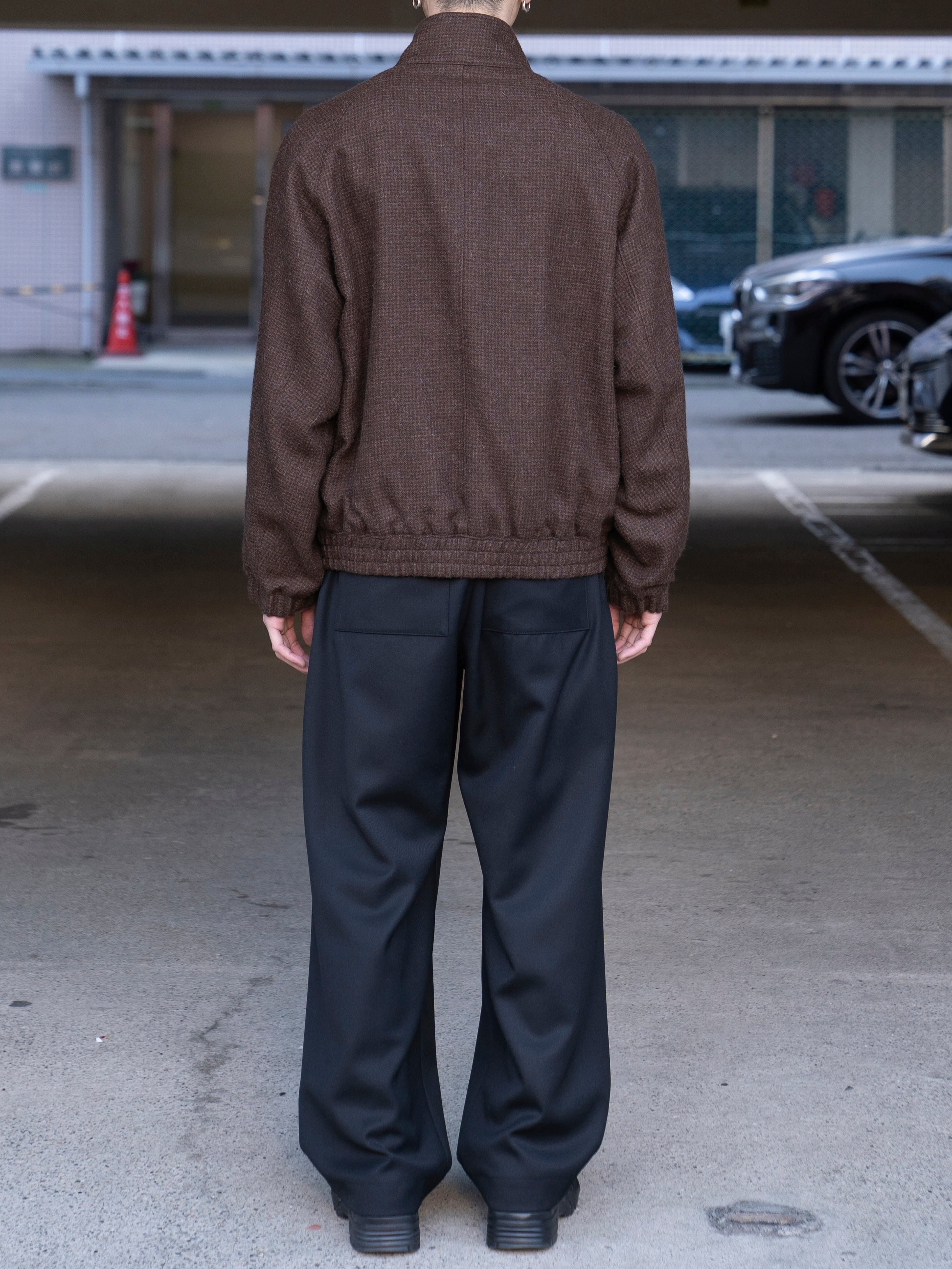 身幅に対して、着丈がやや短めの、スッキリとした佇まいが特徴のハリントンジャケット。ドッグイヤーカラーを採用し、裾と袖口はリブではなく、共生地でギャザーを寄せています。総裏仕立てを採用し、裏地には高密度のナイロンタフタを使用し、軽い着心地と迫力あるシルエットを実現しています。