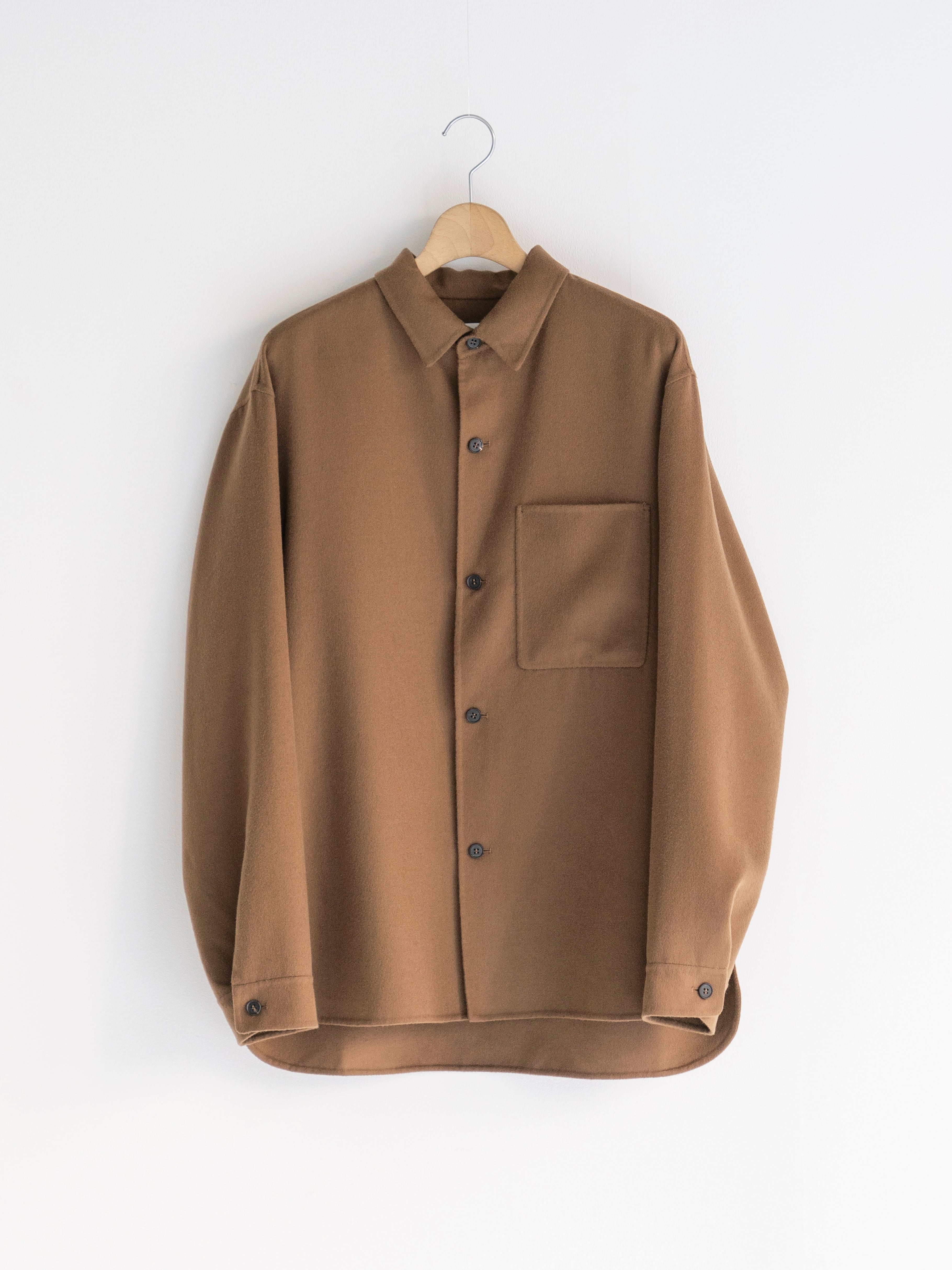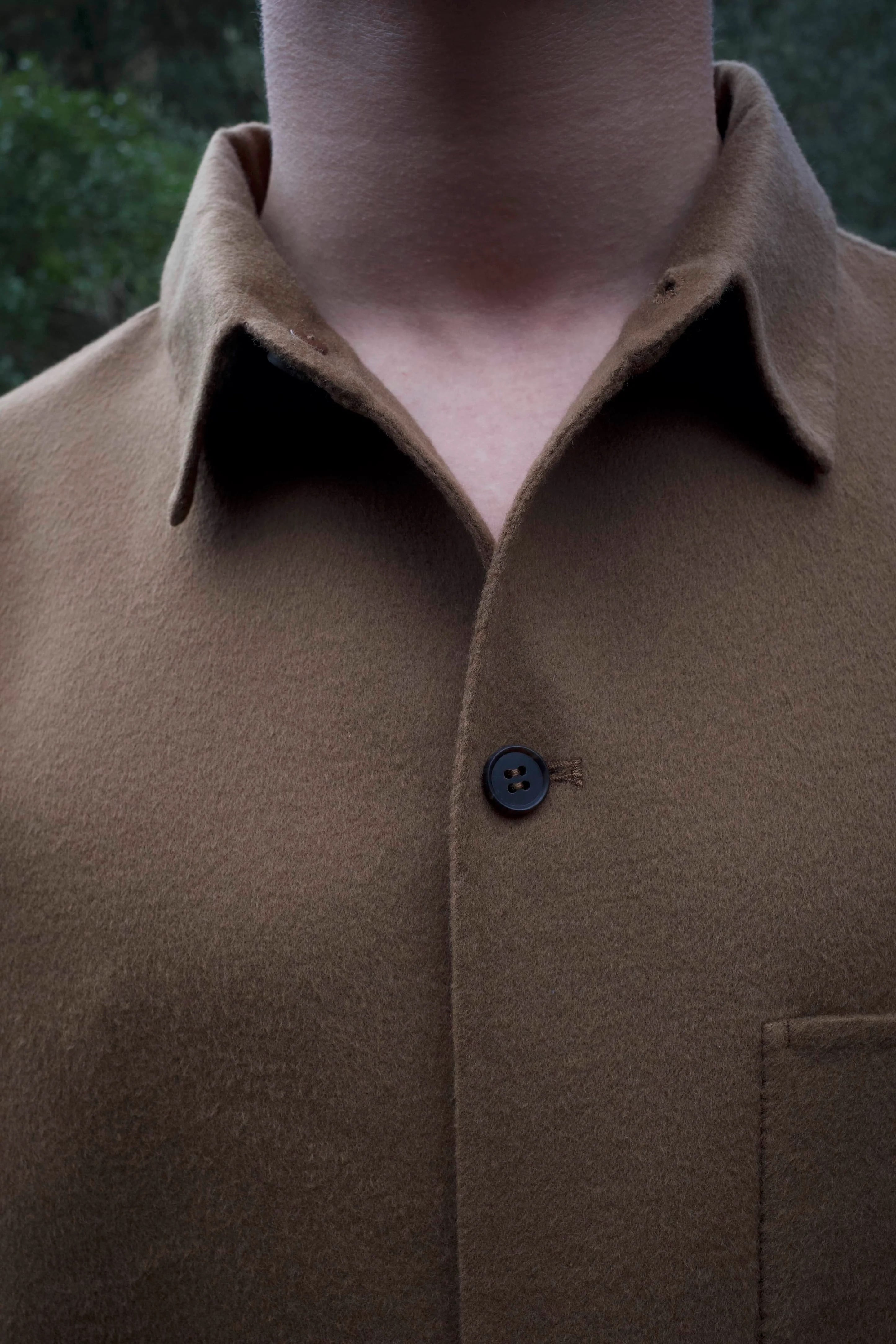 とても軽くしなやかで柔らかい最高級の15.5micronのメリノウールを使ったダブルフェイス オーバーシャツ。軽く艶があり、秋口から着用できます。 わずかに丸みを持たせたポケット。ホーンボタン。リラックスフィット。