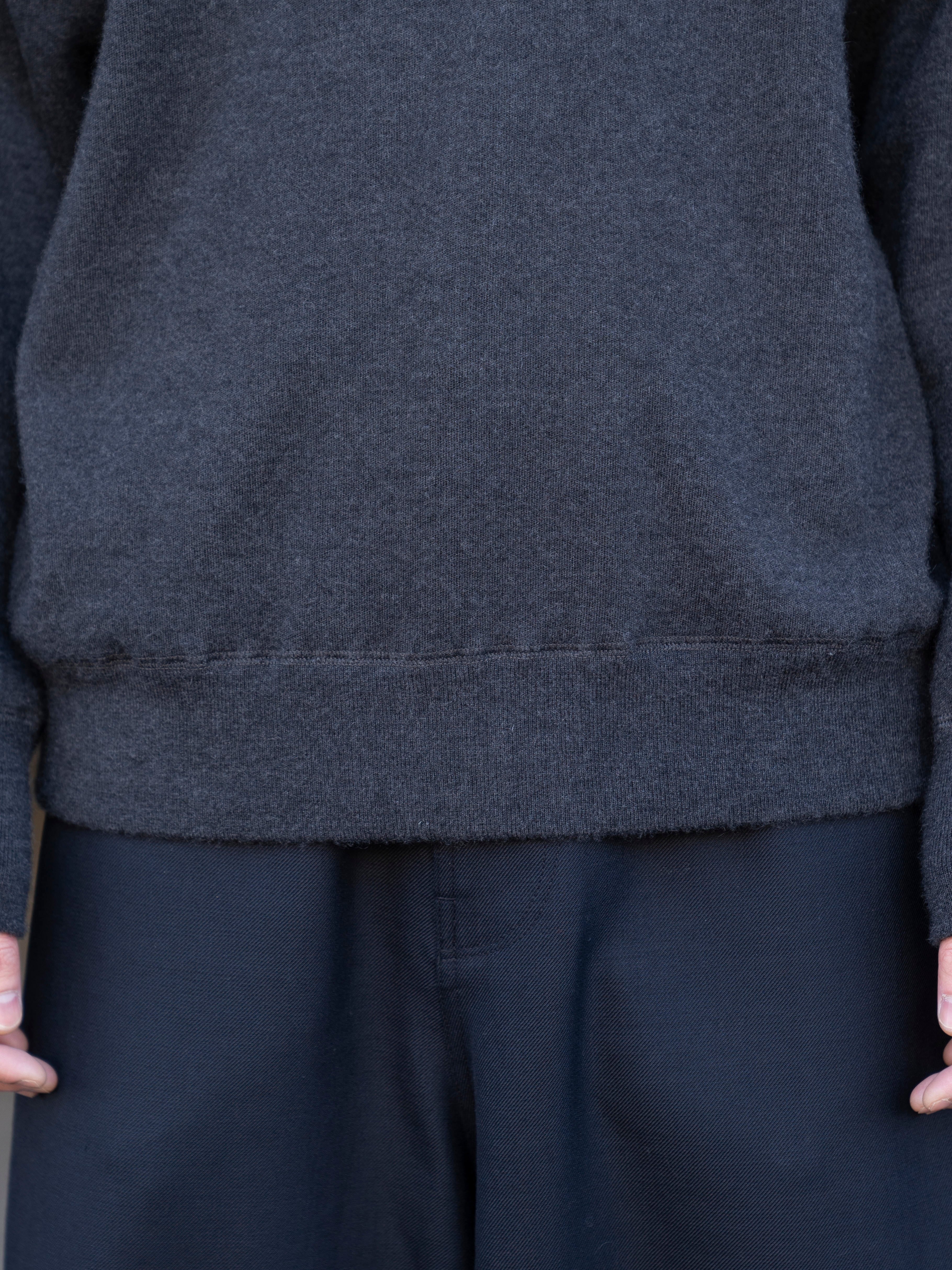100%カシミヤによる、梳毛糸(=長く細い強度のある糸)のみを選定したオリジナルハイゲージニットスウェット。ロンT以上スウェット未満を目指し、様々な環境下でも一枚で完結するオールラウンドなアイテムです。程良く肉感を持ちながら重さを感じさせず、常に身体を常温に保つ機能性は、レイヤーの一枚にとても重宝します。カシミヤ本来の性質により経年変化による劣化も少ないため、長く愛用し続けられる一品。着るほどにカシミヤに風合いが生まれ、柔らかく身体に馴染んでいきます。ヴィンテージスウェットをベースにしたデザインは、アスレティックラグランスリーブ、サイドリブ仕様に加え前後差のない襟ぐりなどこだわりのデザインが特徴。