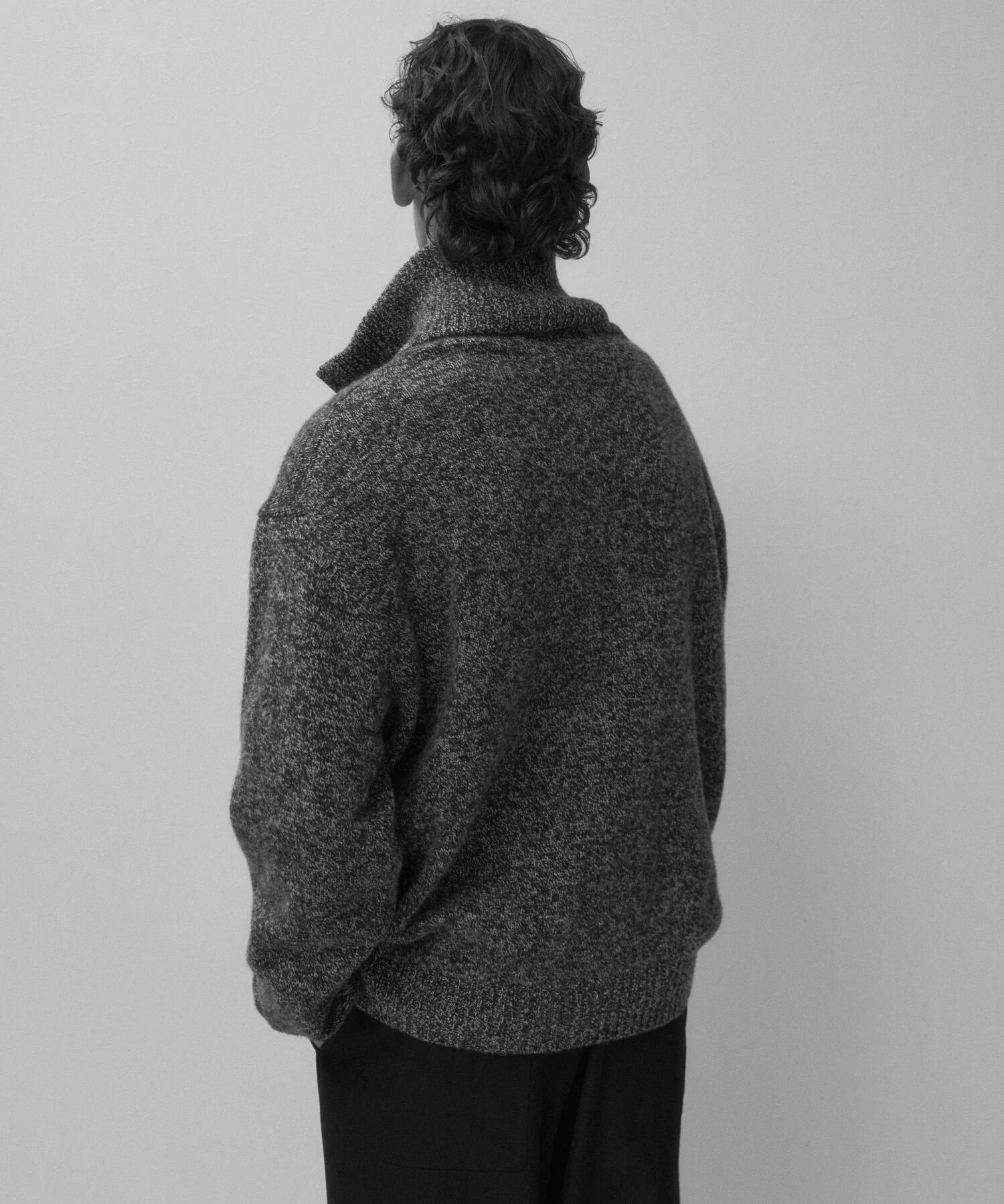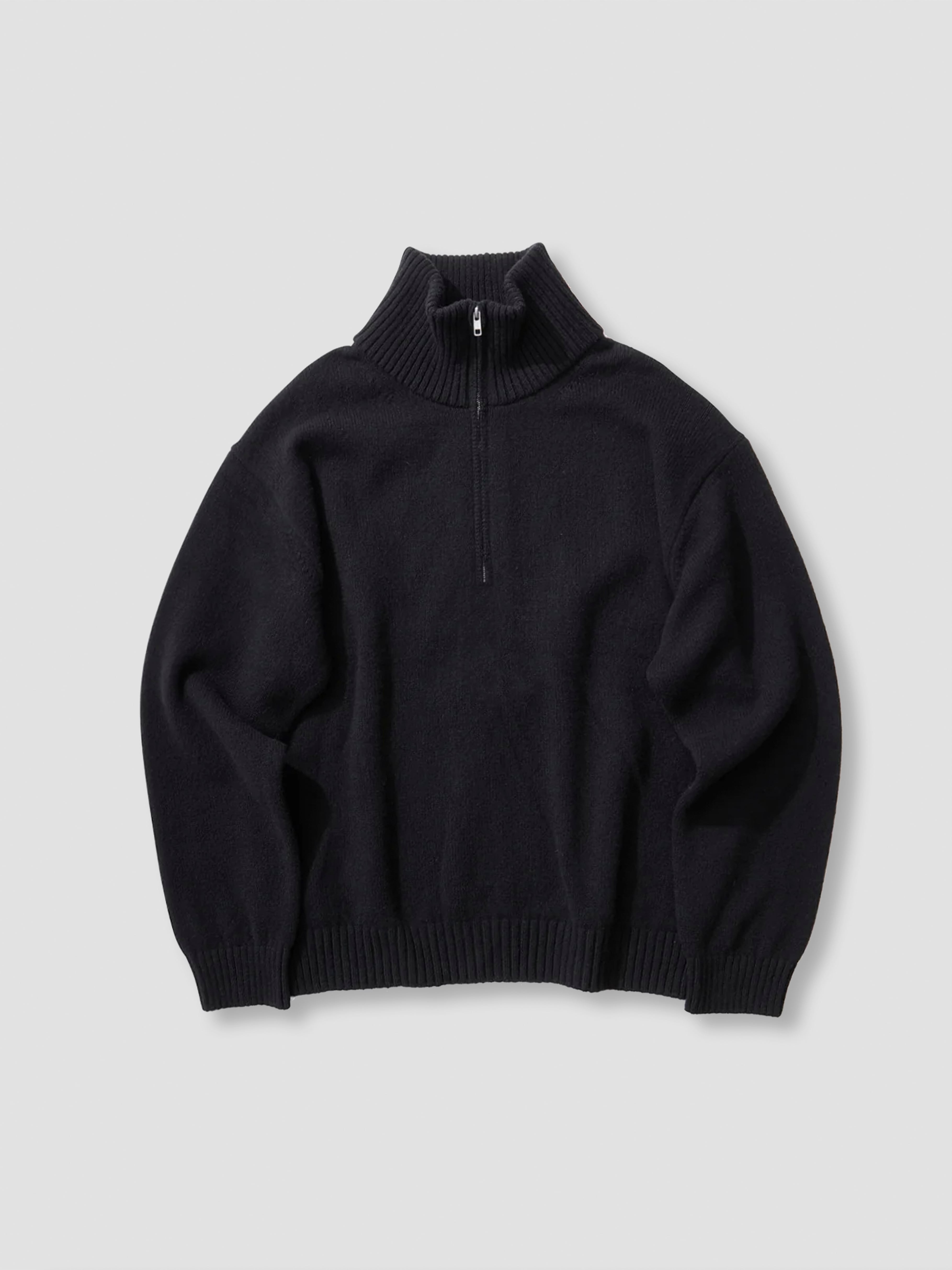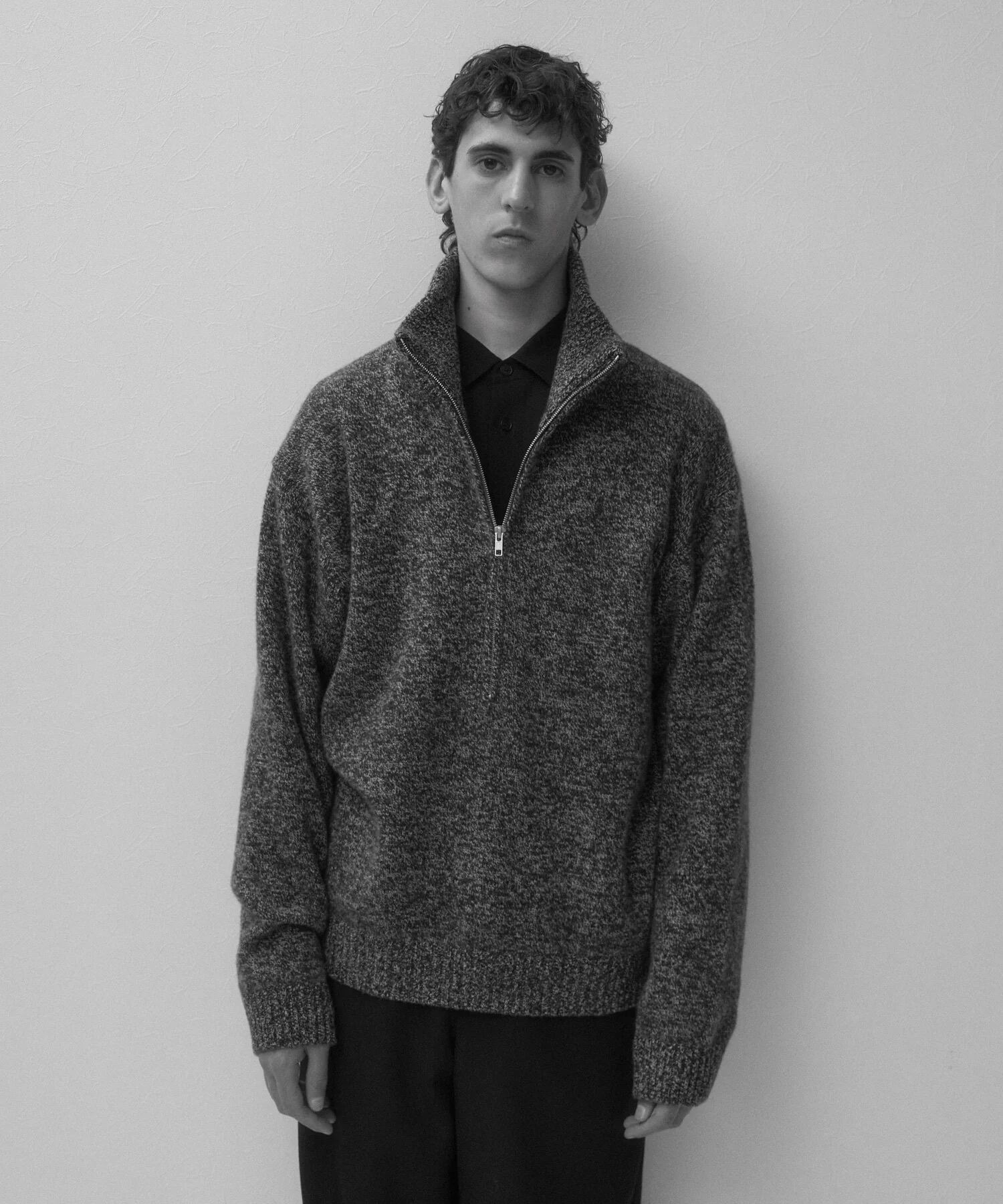 程良いリラックス感が特徴のハーフジップセーター。天竺7ゲージを採用し、適正度目で膨らみある着心地に仕上げました。衿は、リブダブル付けを採用しており、ボリュームある見た目です。裾のリブが締まりすぎておらず、カットソーのようなシルエットを採用しています。