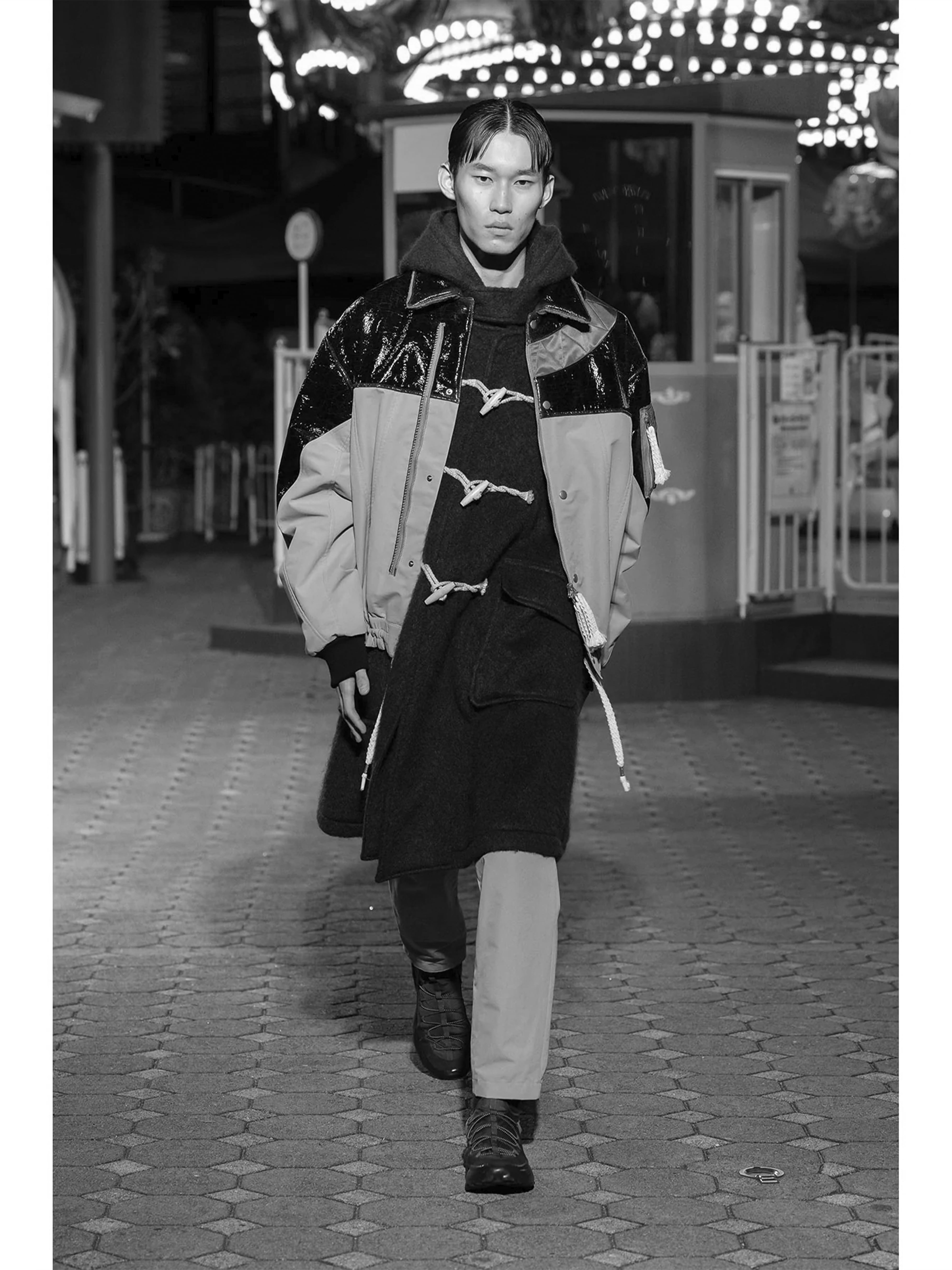 切り替え線やポケット位置などを緻密に計算して配置することで、まるでツイストしたように見せているダッフルコート。