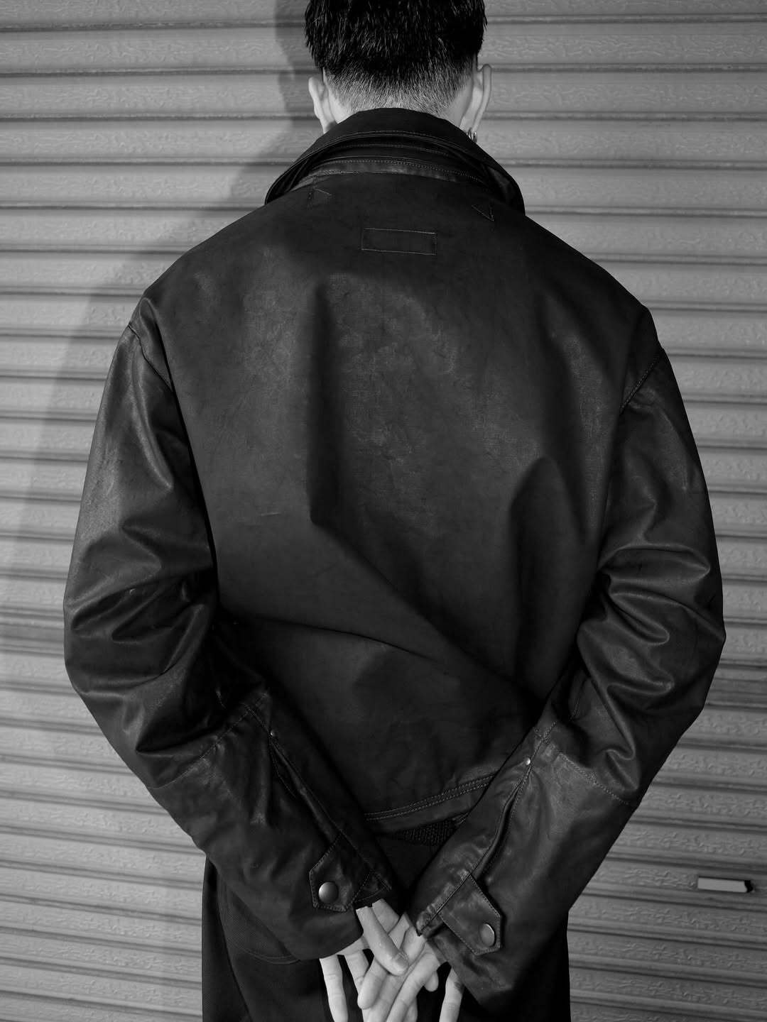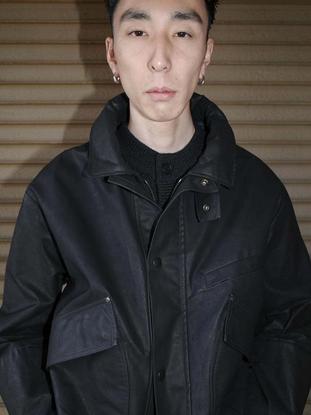 このショートレインジャケットは、フラップ付きポケット、テクニカルファブリック、袖口の内側、収納可能なフード、フロント右下部に付属しているメタルリング、チンストラップ、裾内側に調節可能なドローコードなどの機能的なディテールが特徴です。撥水性のある樹脂加工されたコットン生地で作られております。時間と動きとともに生地に緑青が生じ、ヴィンテージの外観が与えられます。