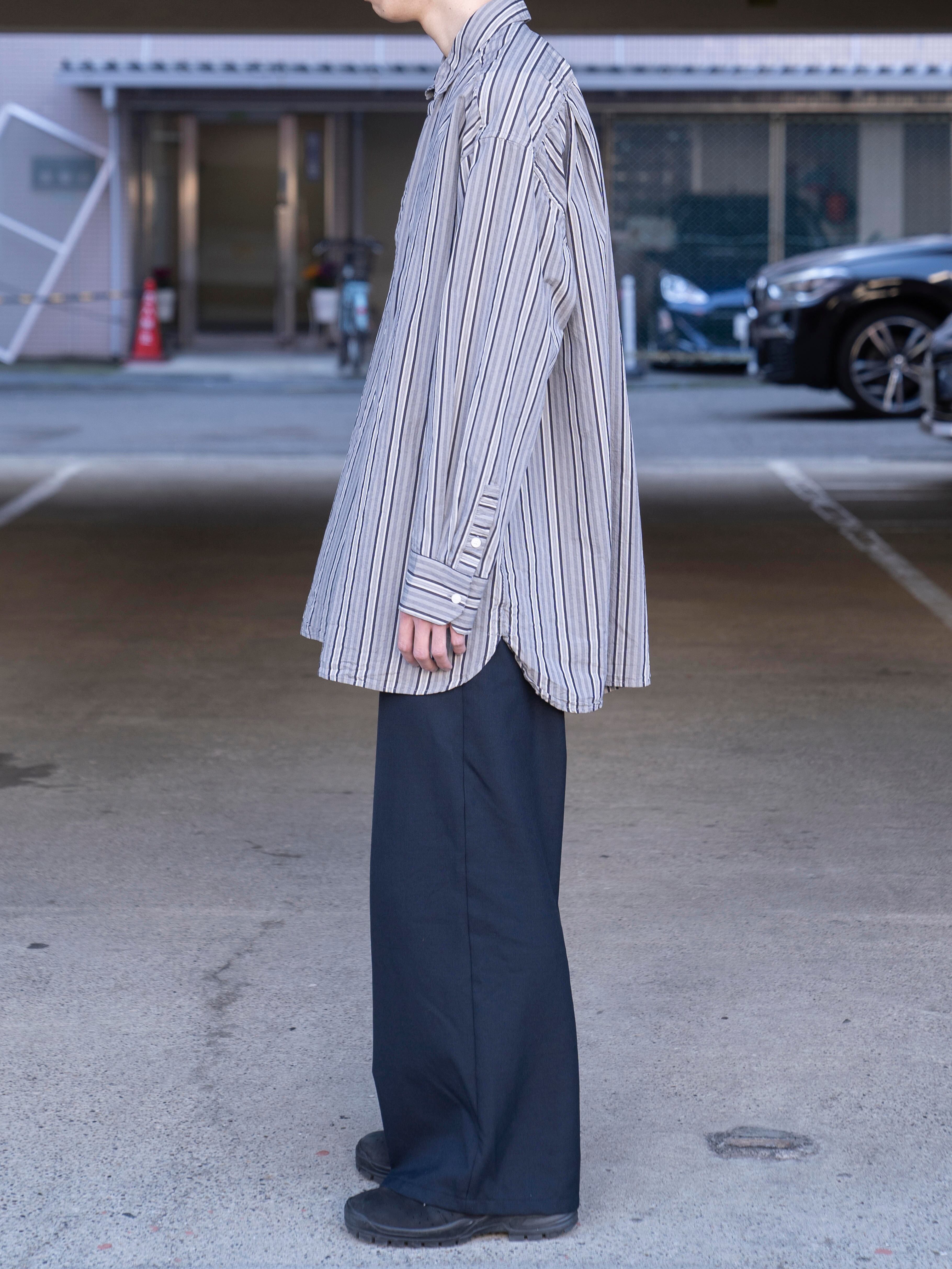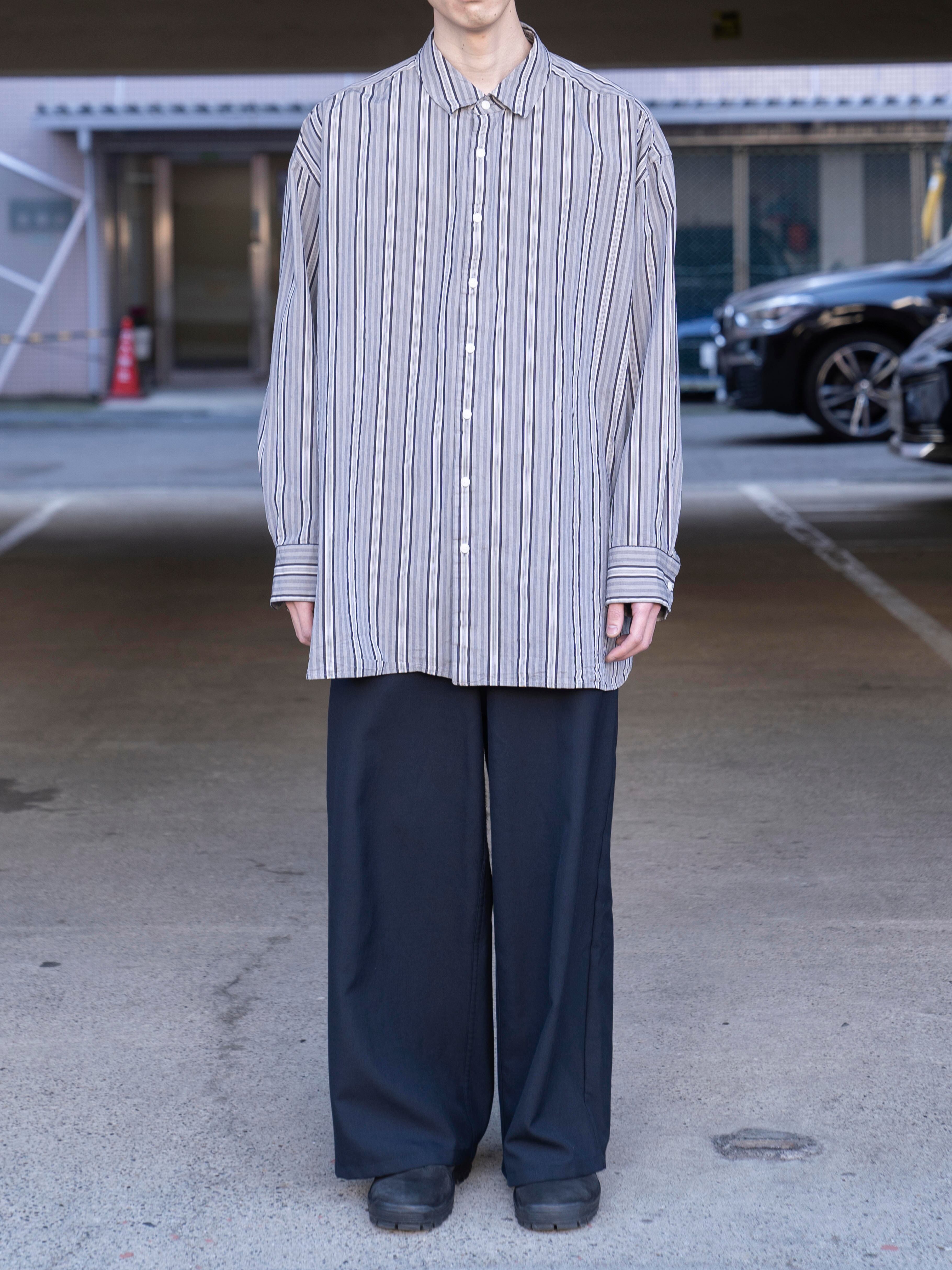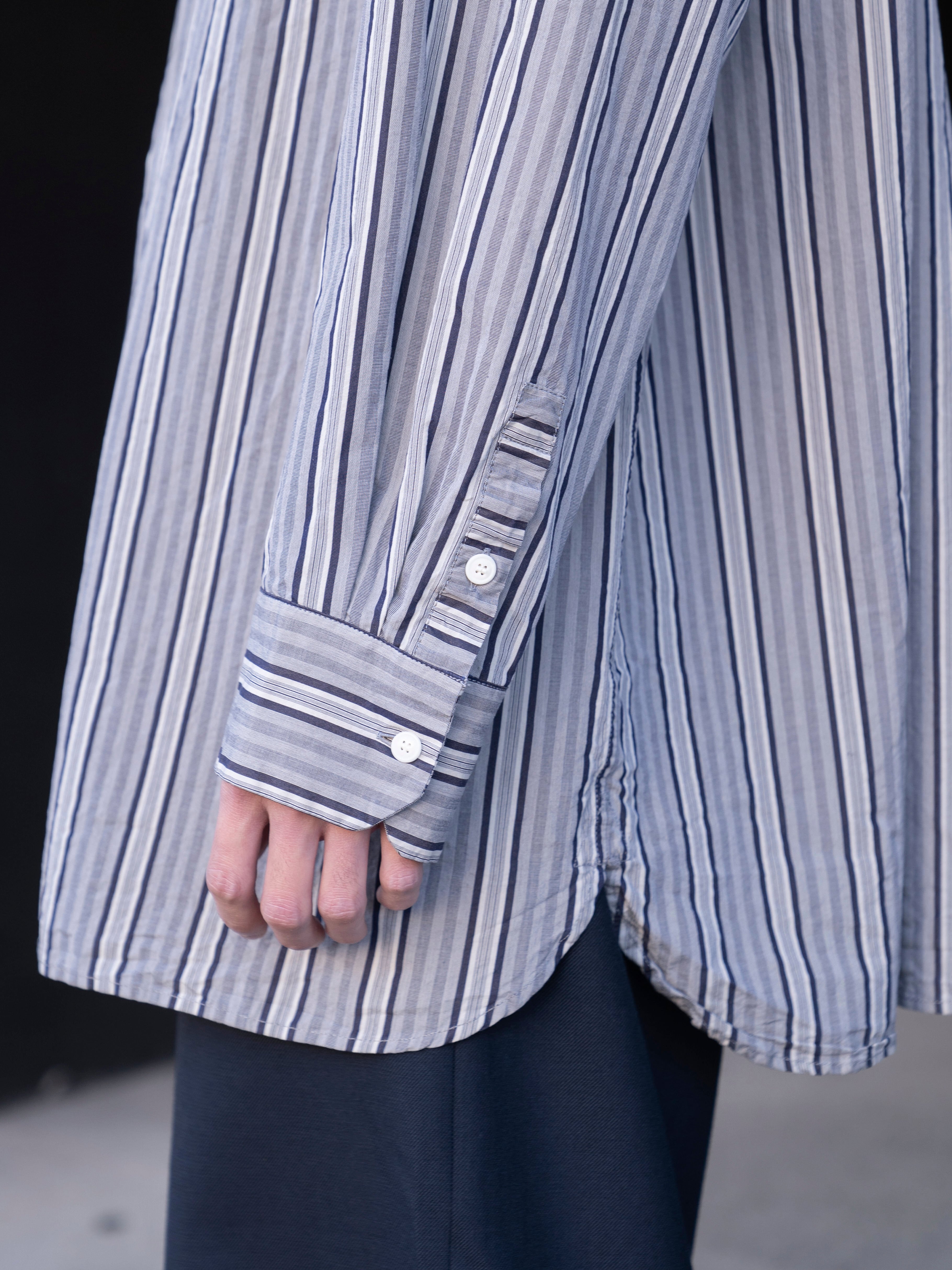 生地は、ブランドのシグネチャーファブリック。ペーパーコットンのストライプ生地は、独特なパリッとしたドライな手触りを備えたレギュラーウェイトのコットンです。柔らかさを増すためにウォッシュ加工が施されており、自然にしわが寄った風合いがあります。通気性に優れ、動きやすさを保ちながら形状を維持します。