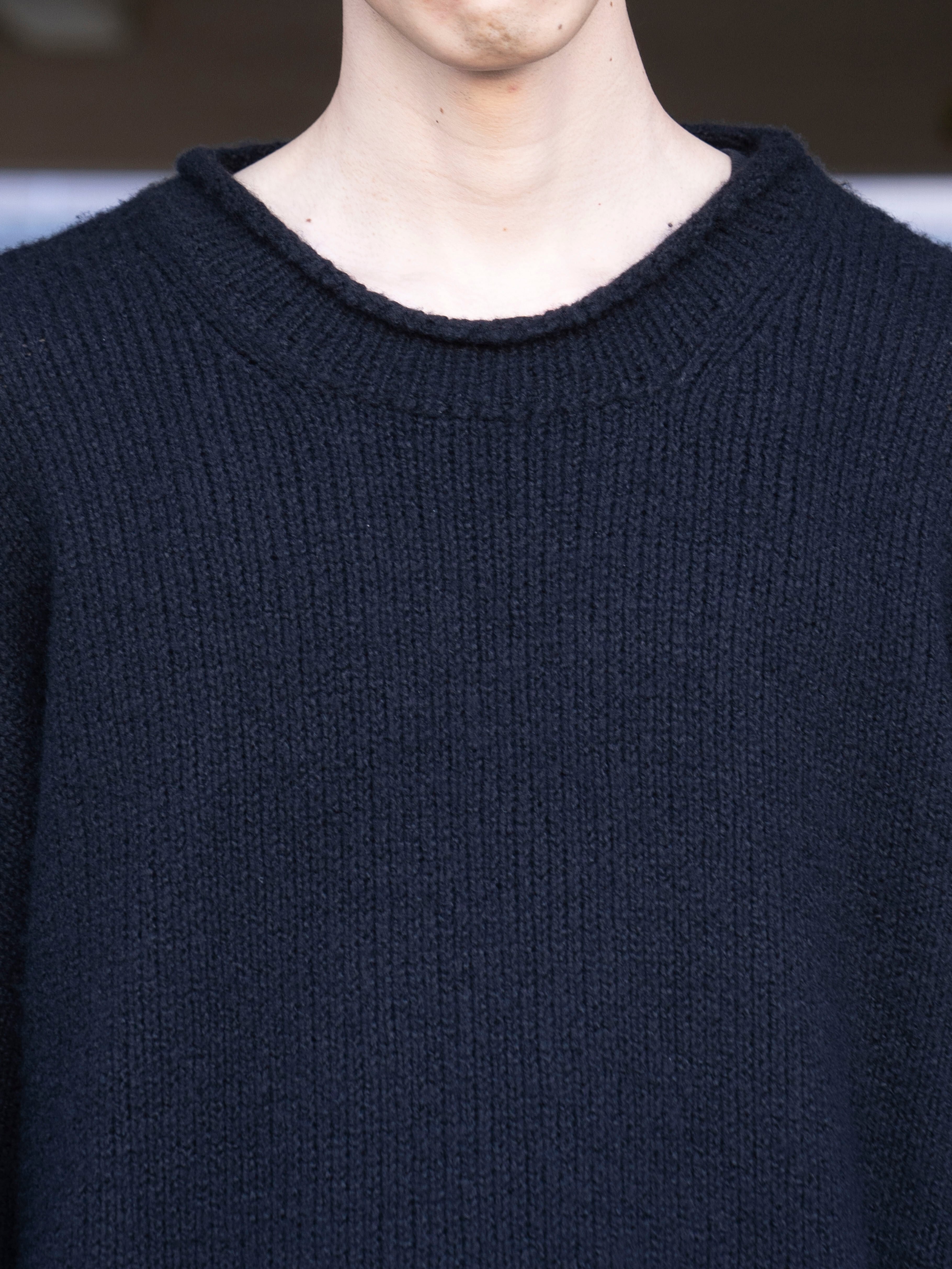 クラシックなラウンドネックでデザインされ、襟、袖口、裾はロールエッジで仕上げられています。柔らかさを増すために洗浄された糸は、柔らかくふんわりとした肌触りです。