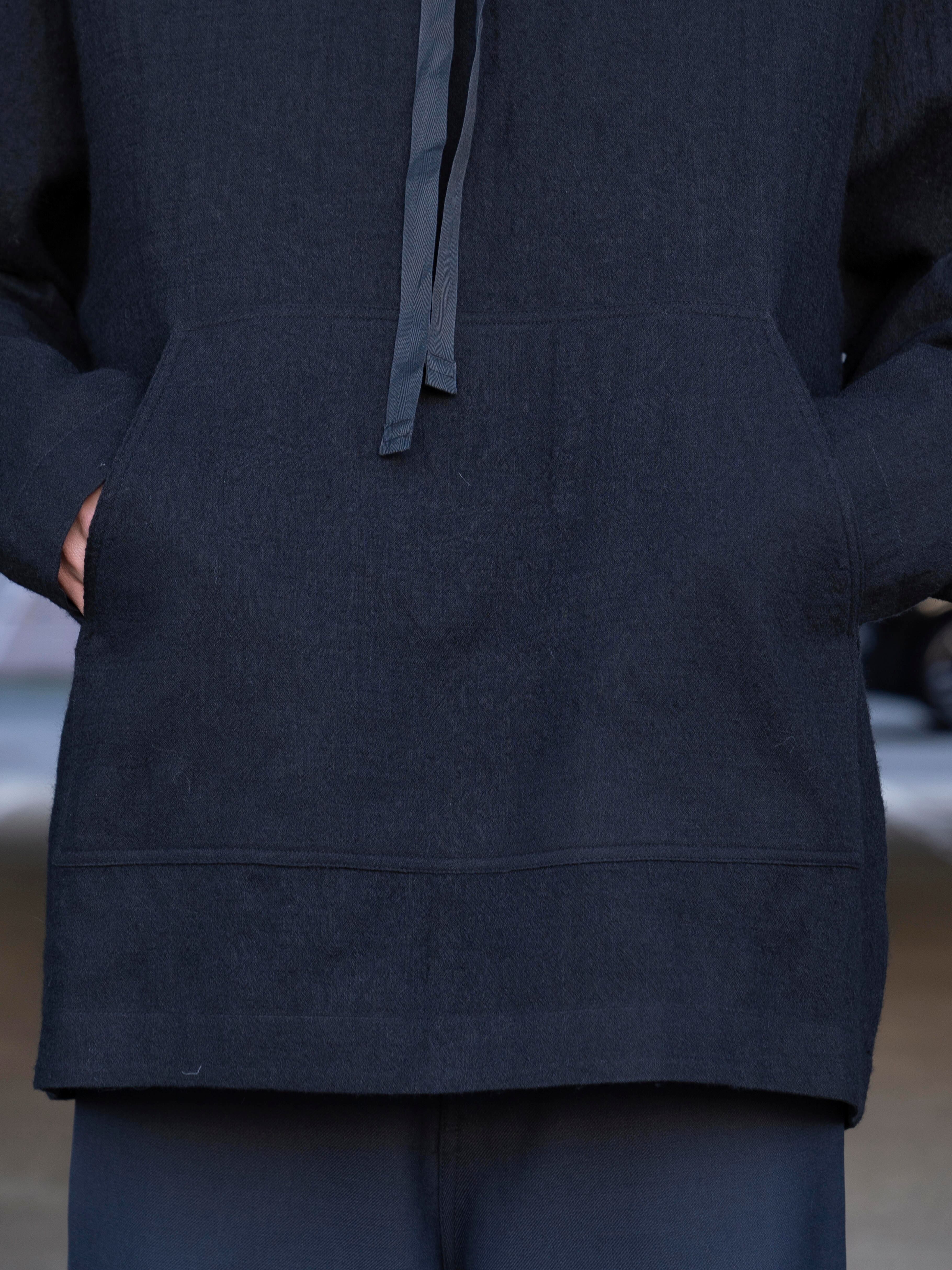 柔らかいバージンウールで作られたオーバーサイズのフード付きプルオーバー。