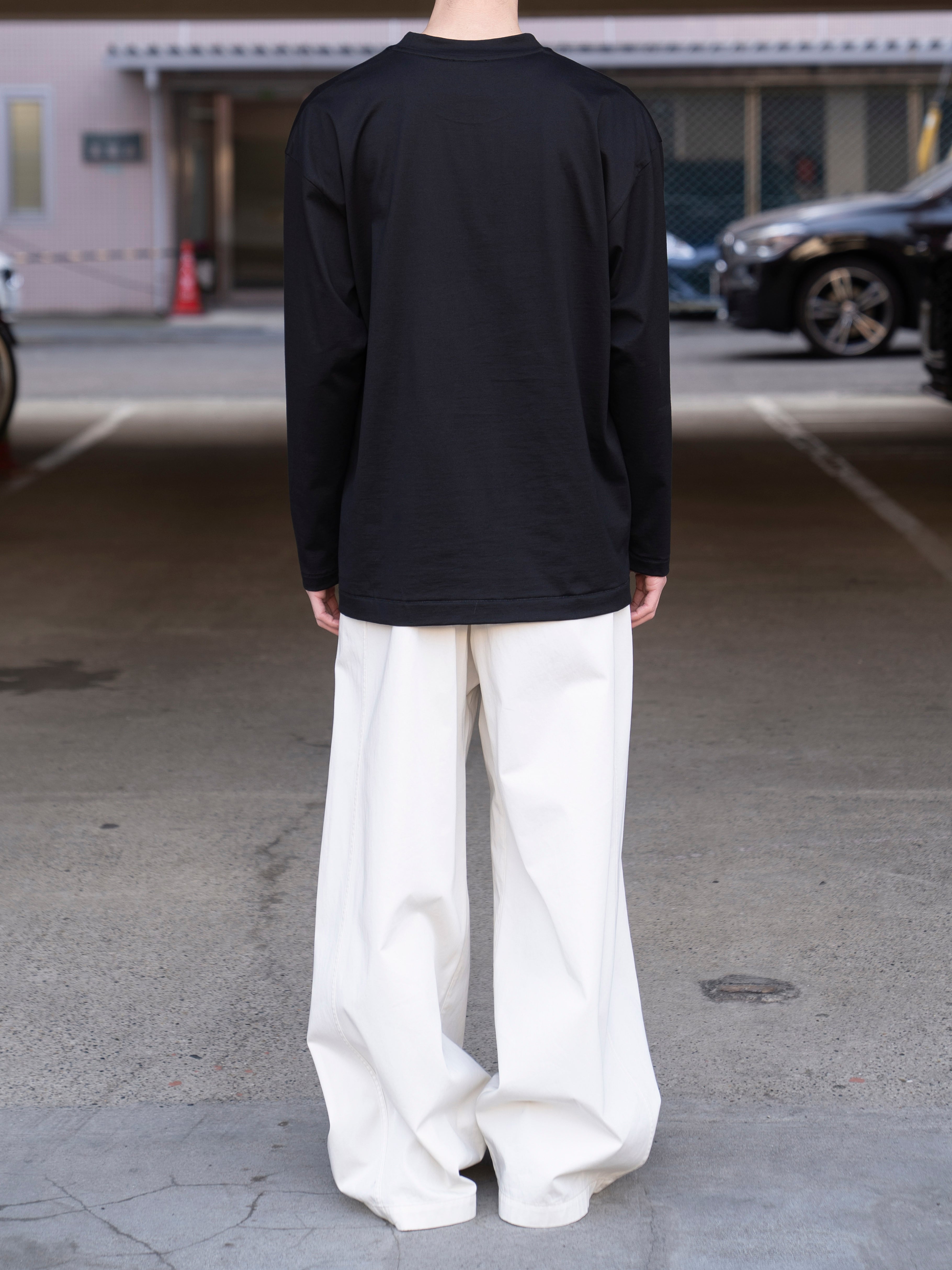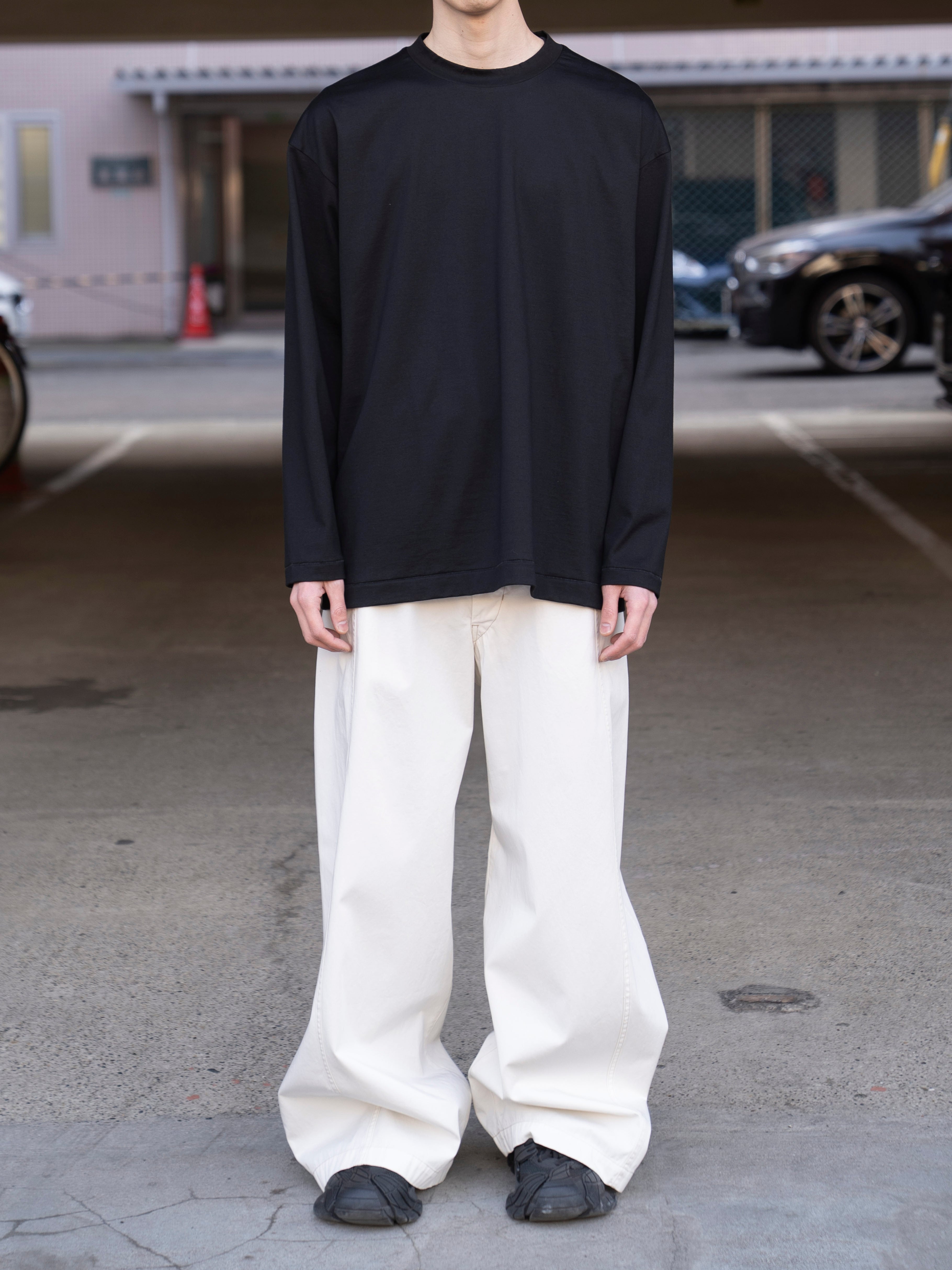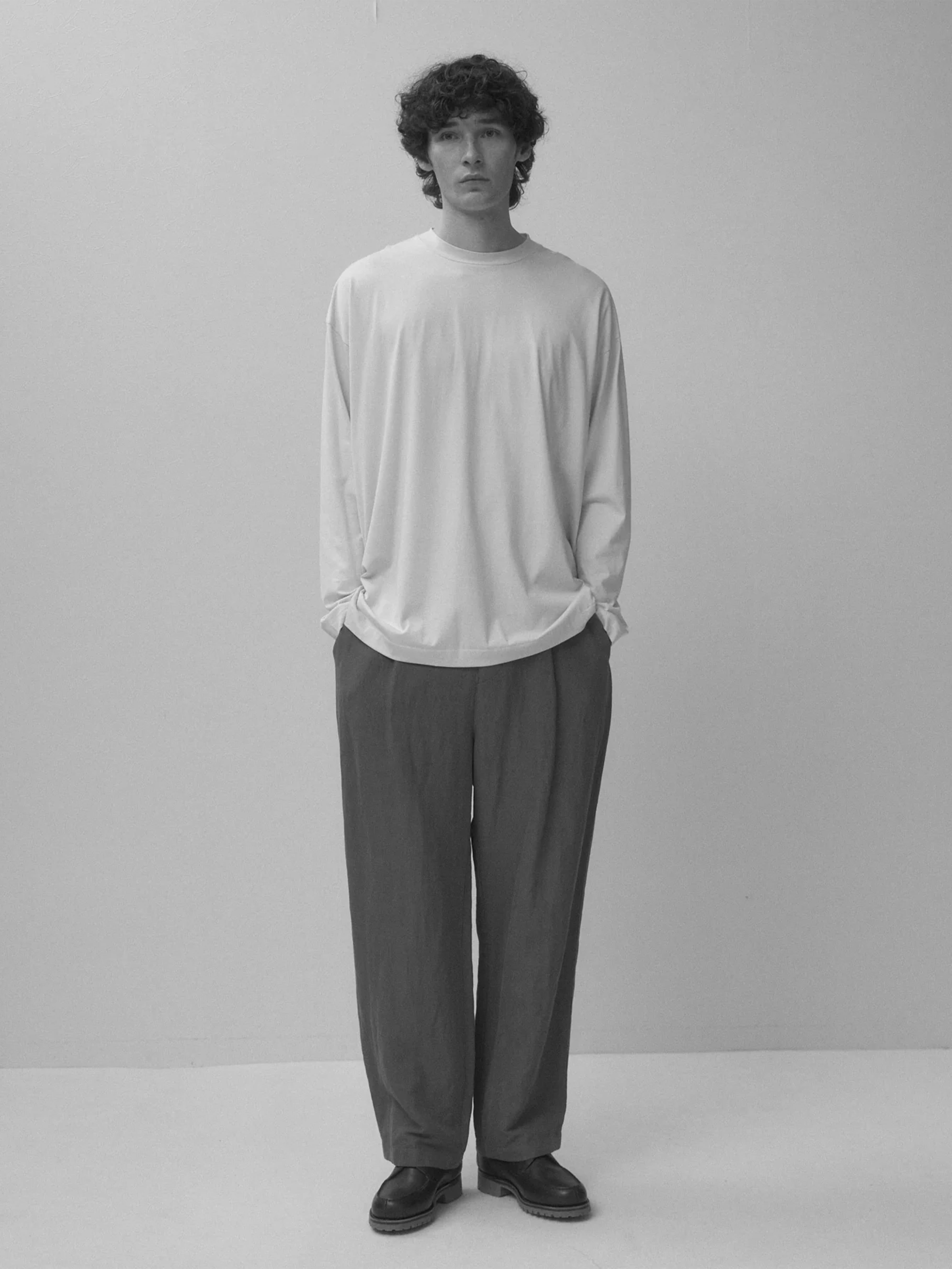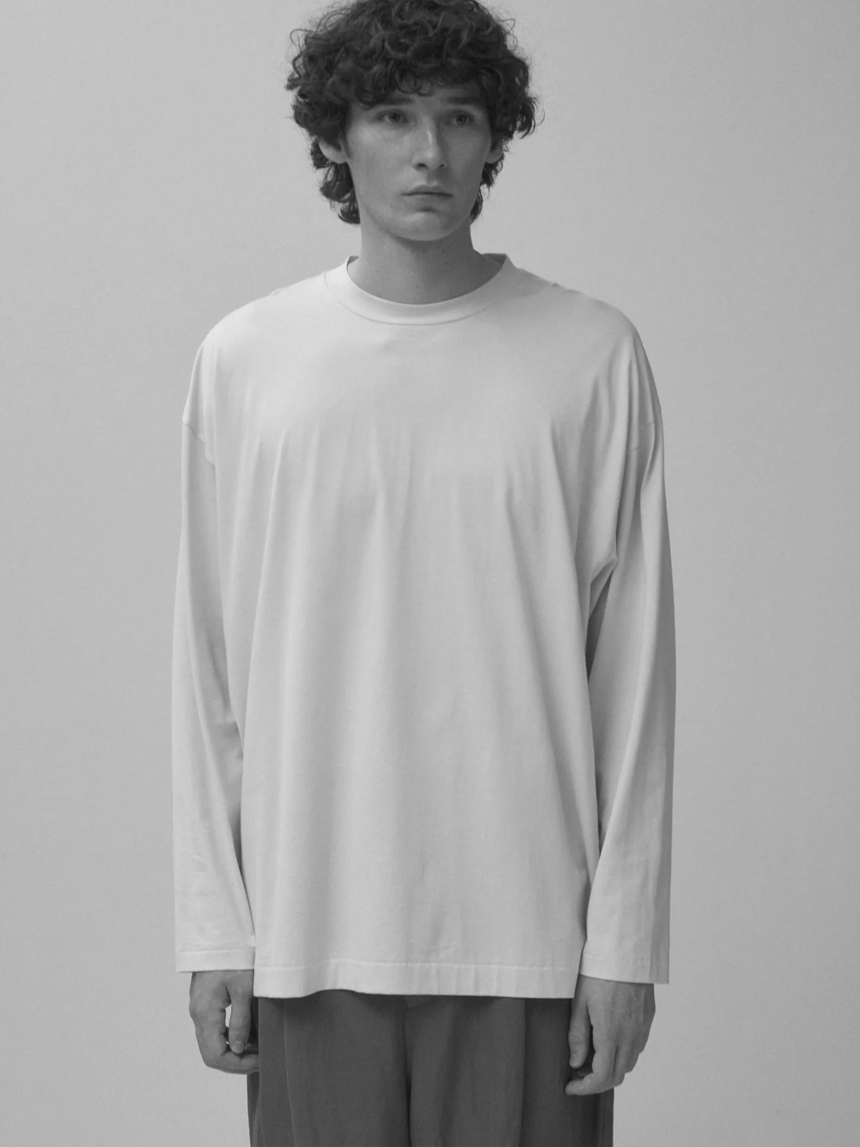 オーバーサイズが特徴のATON定番ロングスリーブTシャツ。ゆとりのあるシルエット、横幅に対し縦の比率が少し長く、モードな印象です。男性向けですが、素材に落ち感があり、女性がオーバーサイズで着用できる1着です。