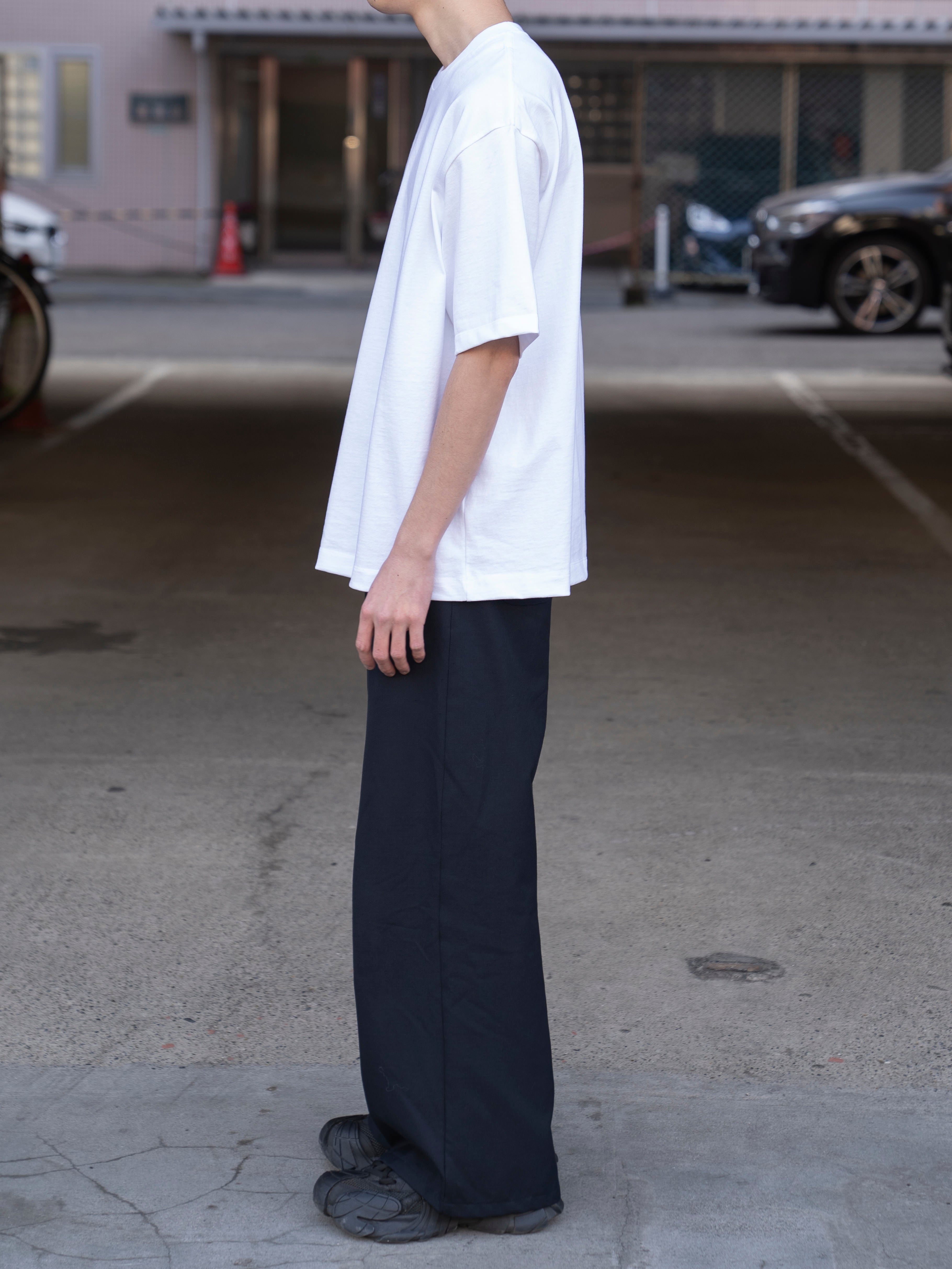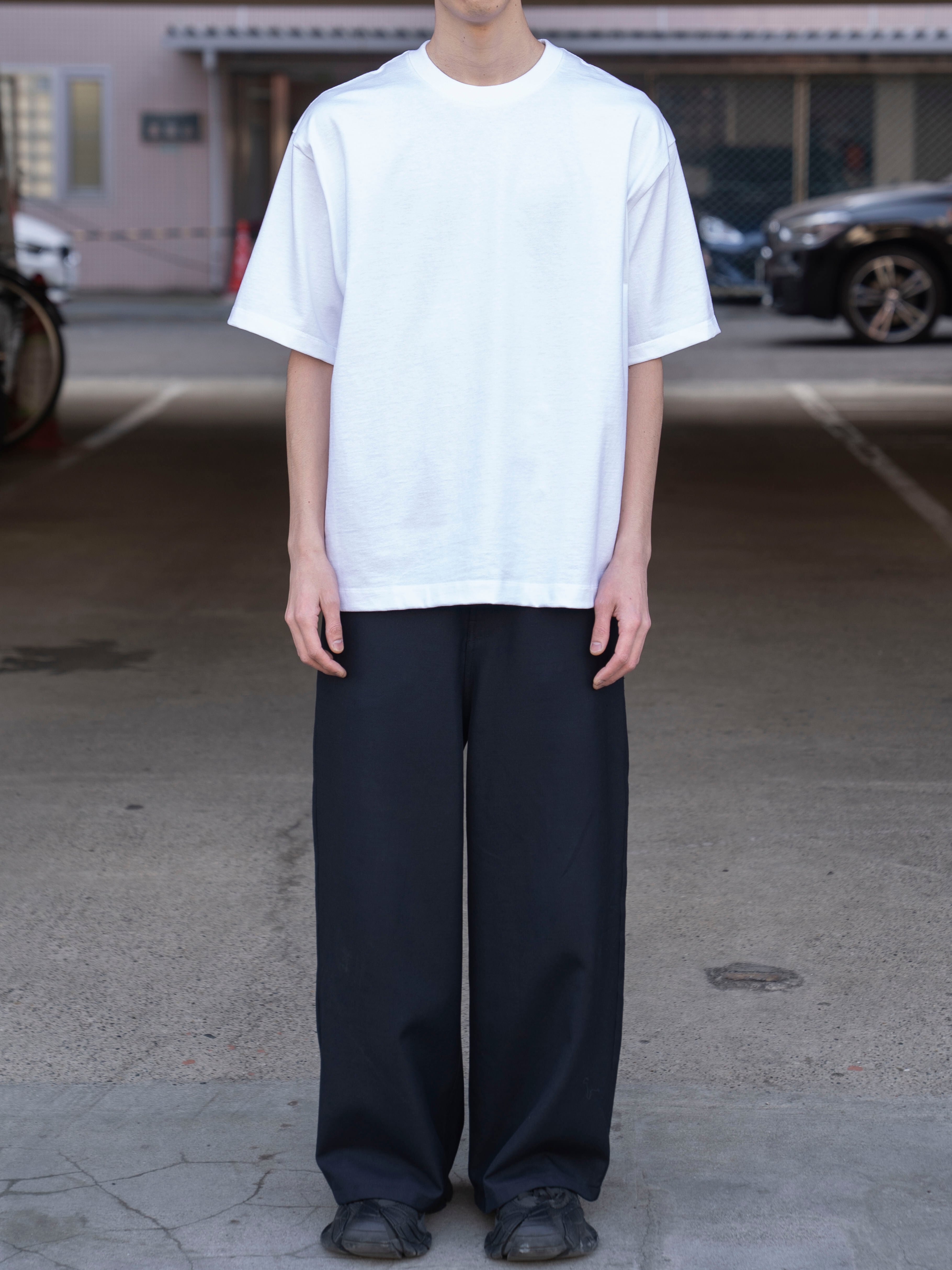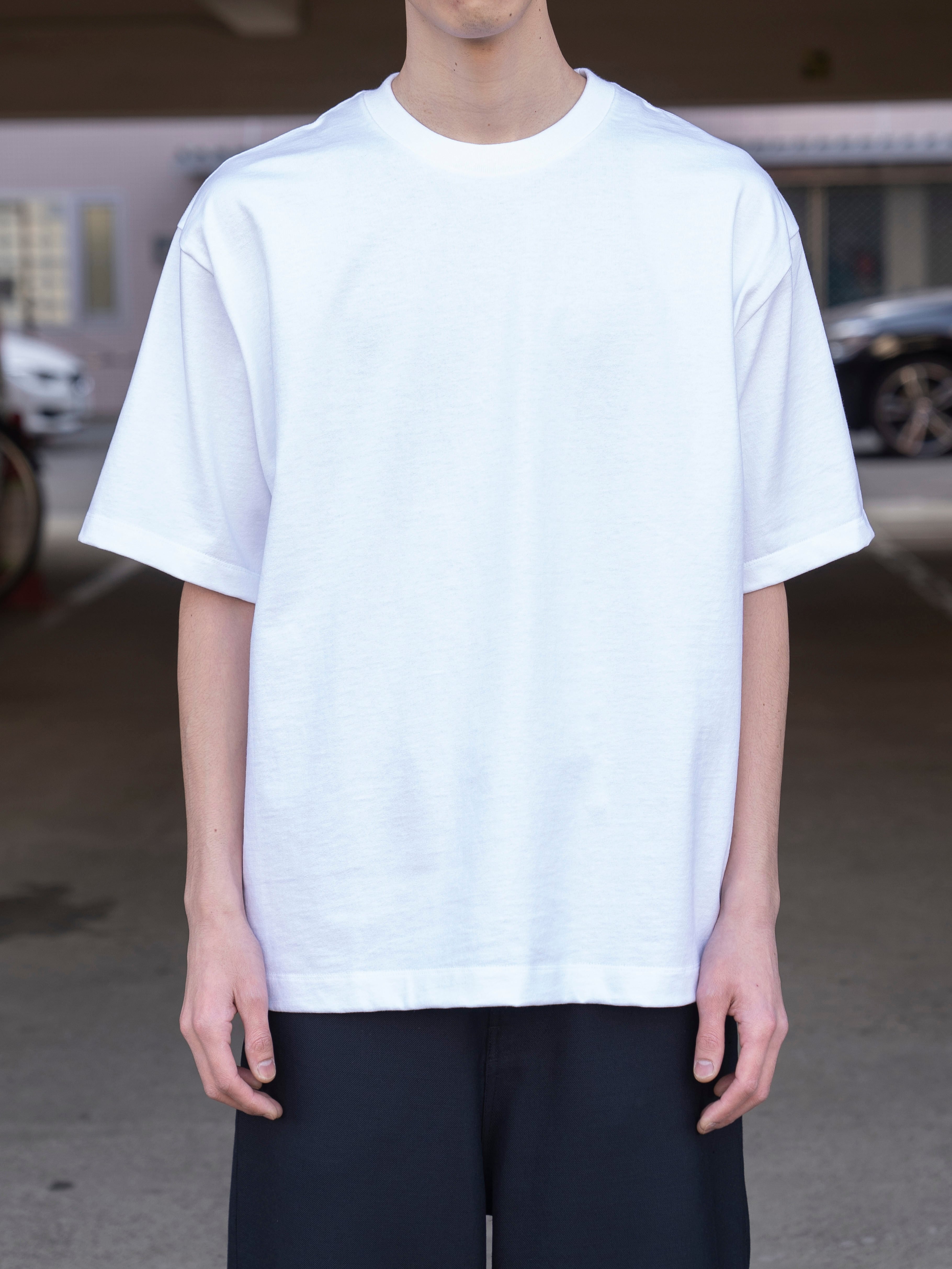ややオーバーサイズなボックスシルエットが特徴のTシャツ。首元はフライスでしっかりとつまっており、きれいすぎず、カジュアルすぎず、どんなシーンでも活躍してくれます。