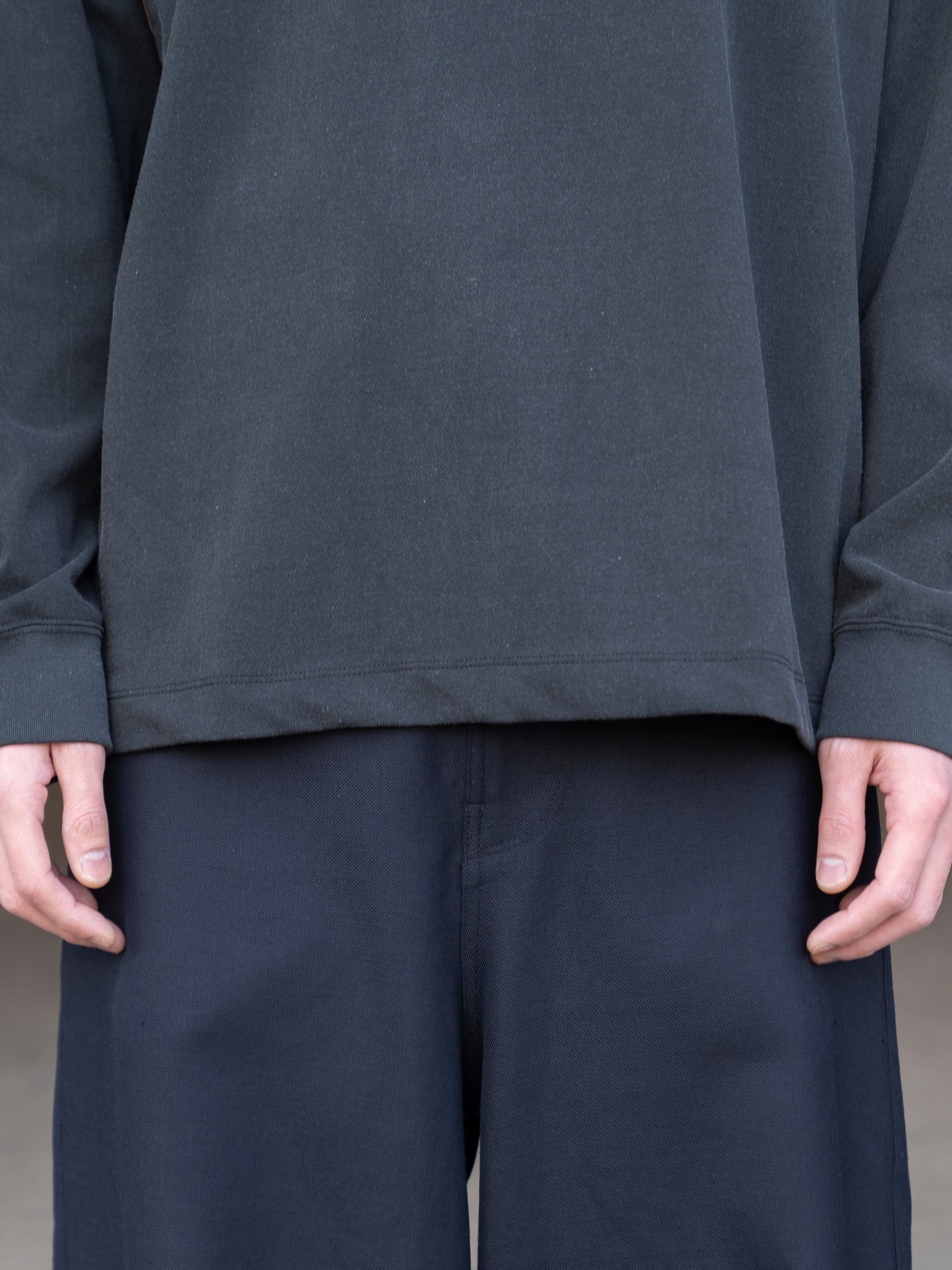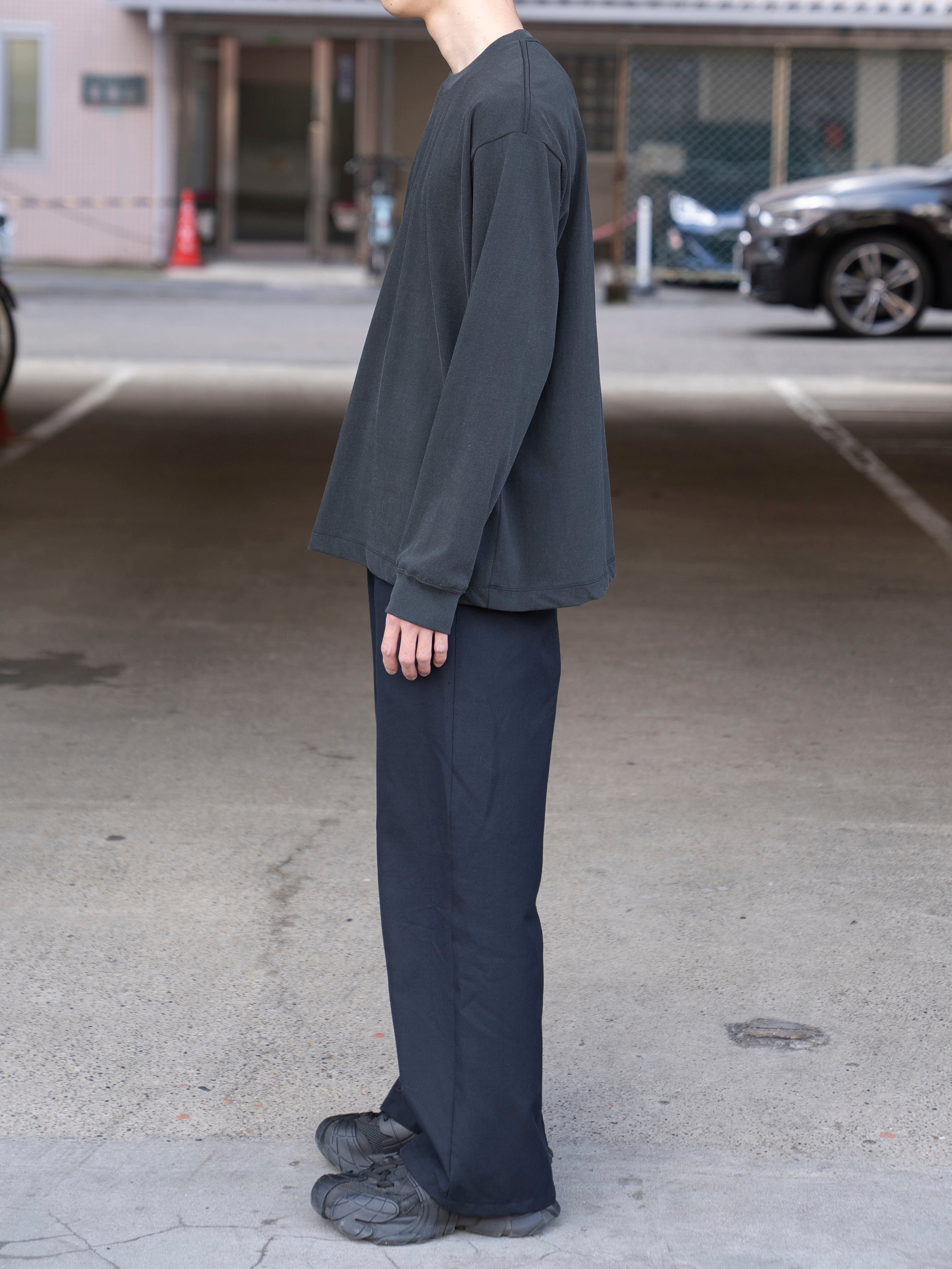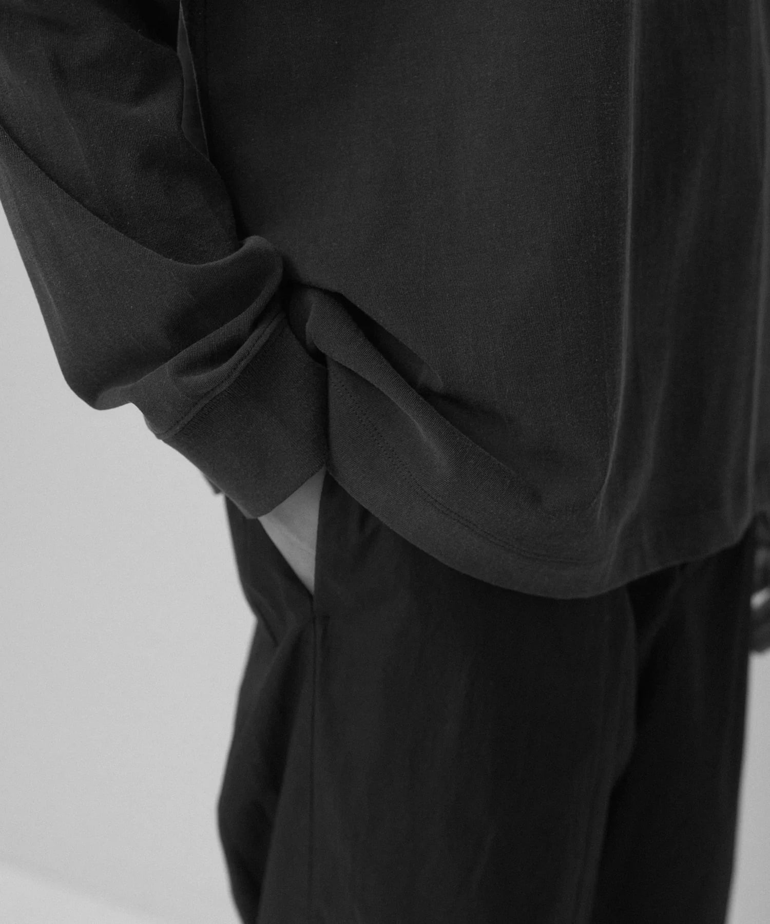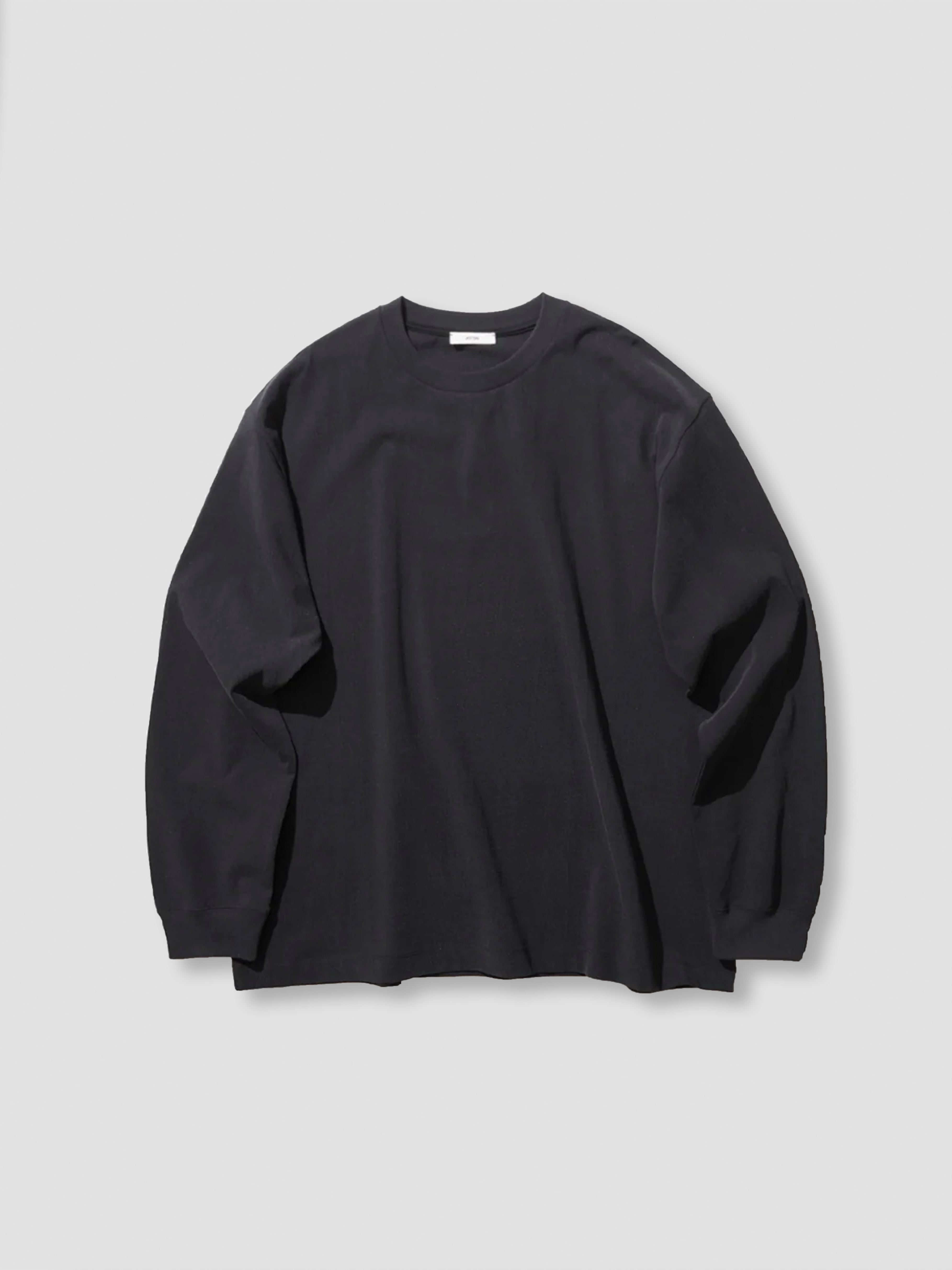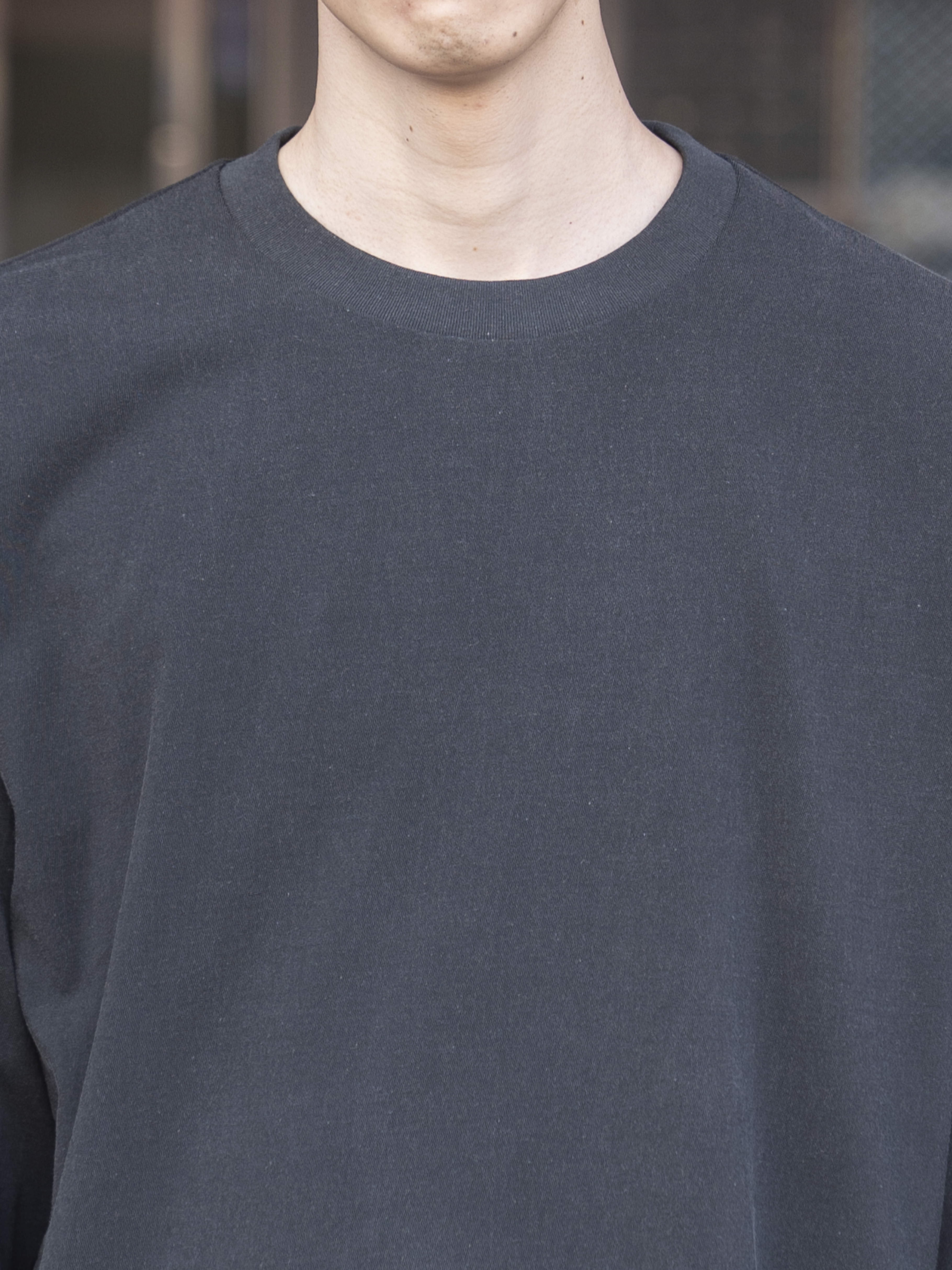 ややオーバーサイズなボックスシルエットが特徴の長袖Tシャツ。肉厚な素材なので、透けも気になりません。首元はフライスでしっかりと詰まっており、すっきりとした印象です。