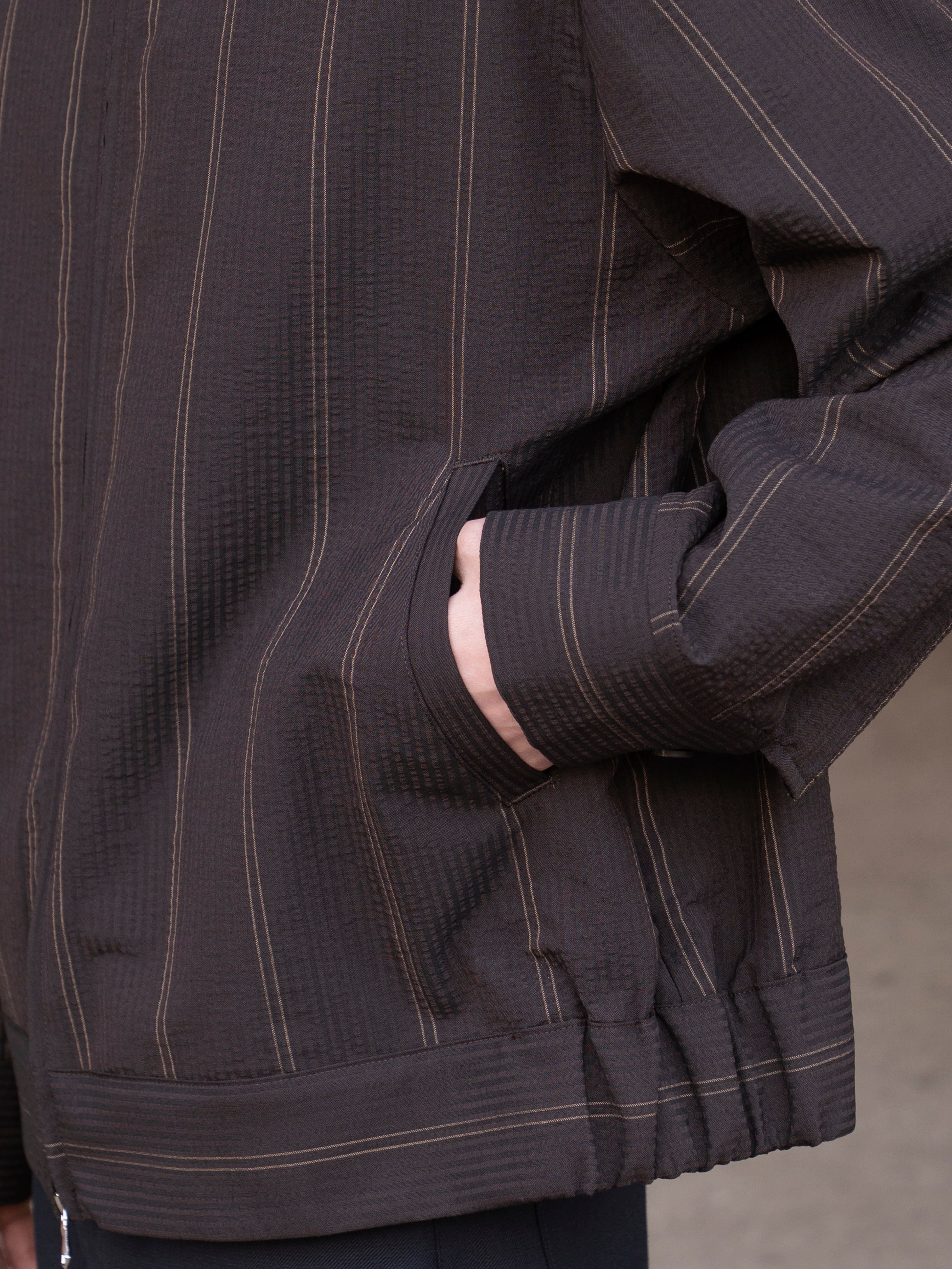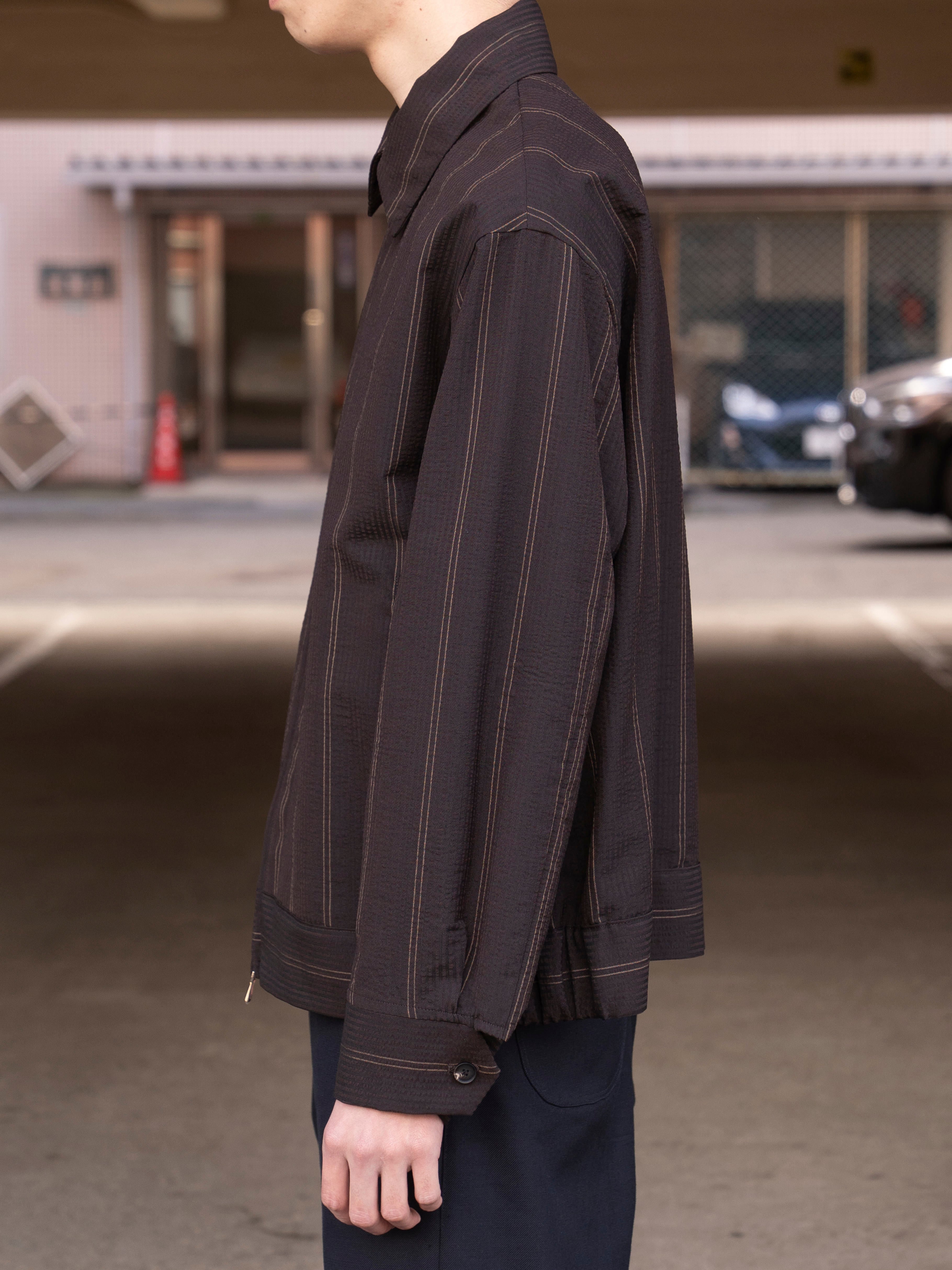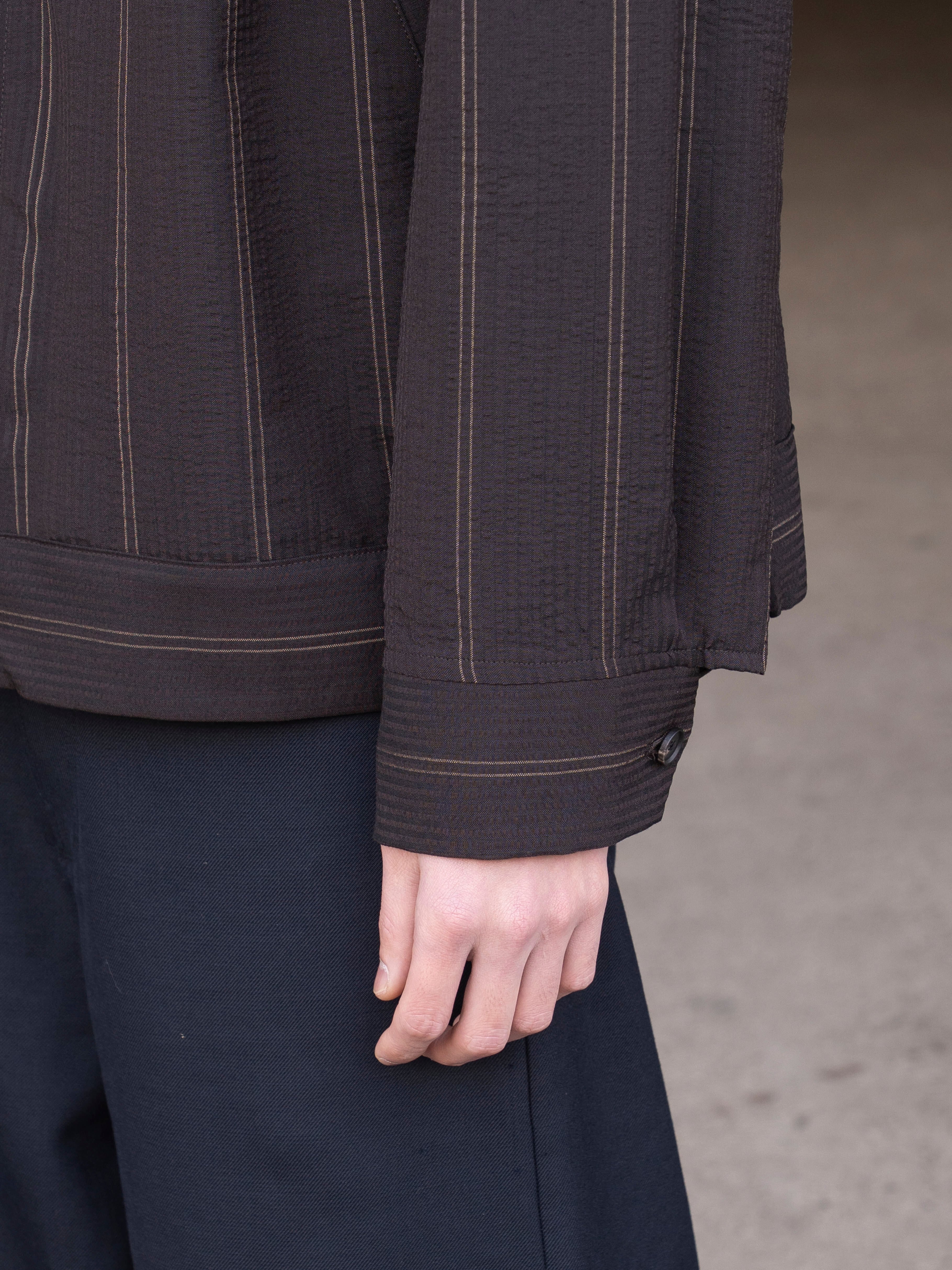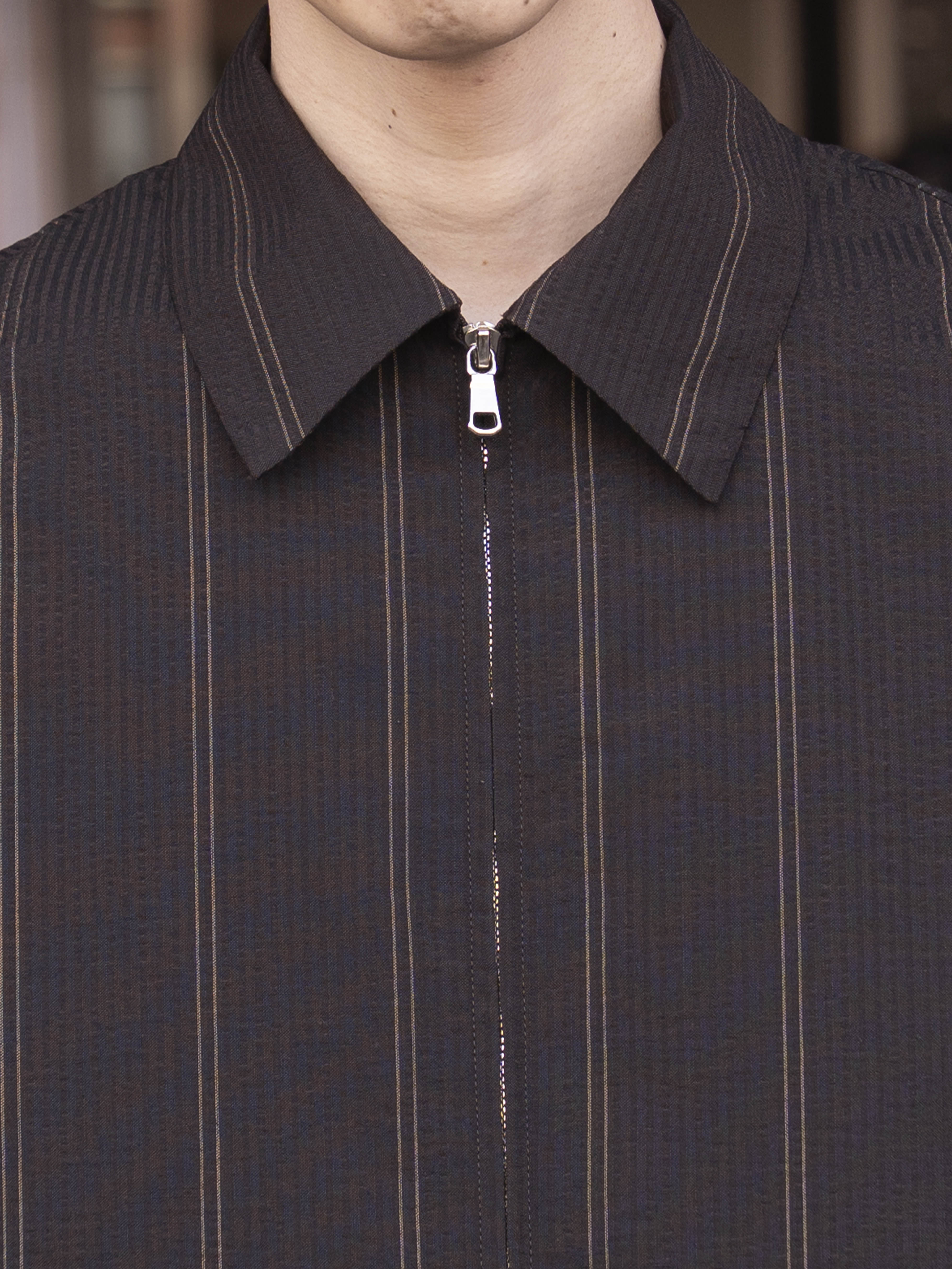 綿糸で作られることが多いサッカーを地タテヨコともに梳毛ウールを使用しています。通常サッカー地は2種類の異なるテンションの経糸を交互に配置してシボと畝を表現しますが、この生地はストライプの複雑な表情を表現するために6本交互に異なるテンションの意図を配置しています。一見単色の濃色に見えるストライプは黒と深いブラウンで構成されています。畝により細いストライプが揺らいで見えます。整理加工でこの畝と揺らぎが損なわれないように自然な仕上げをしています。