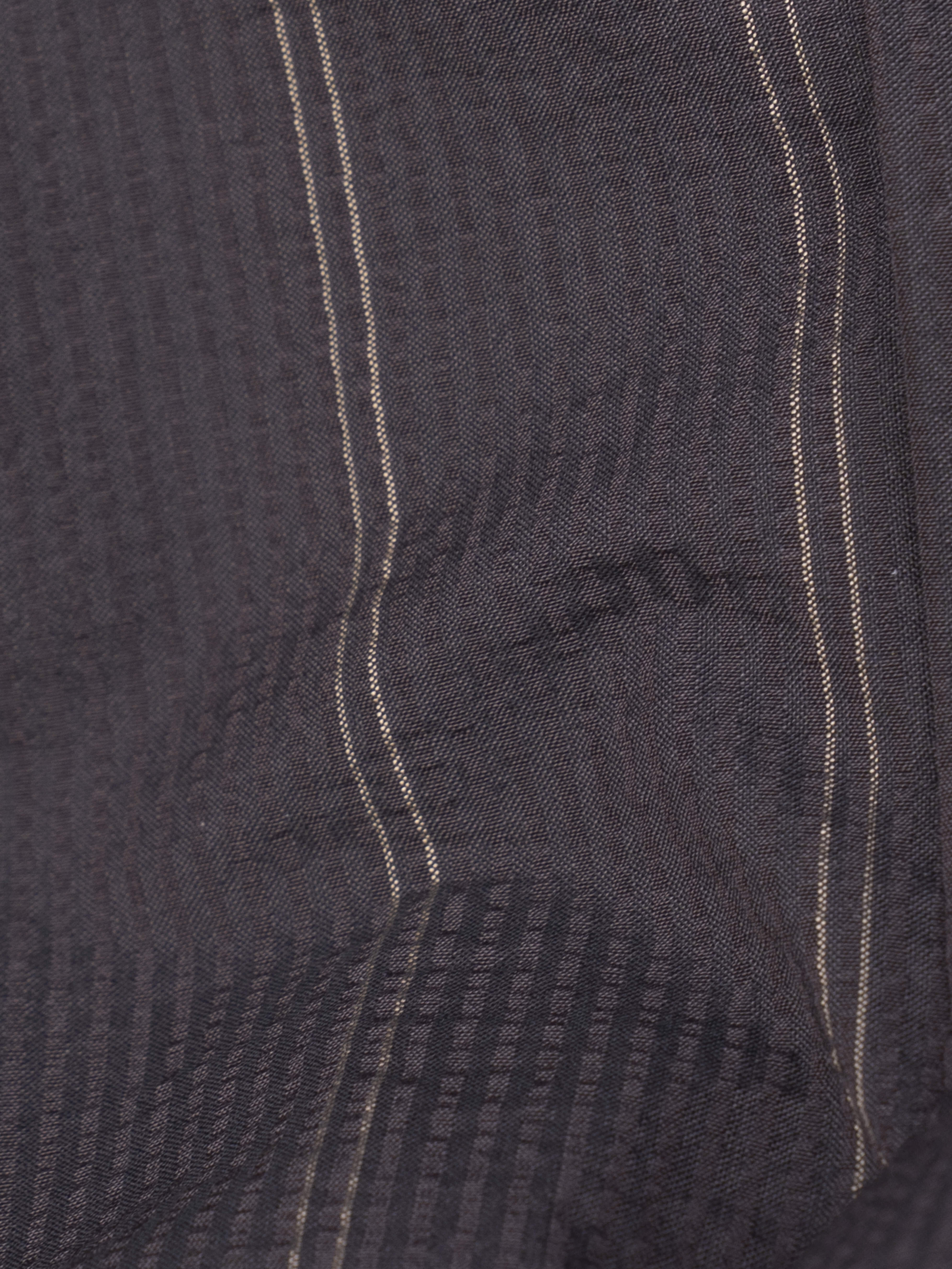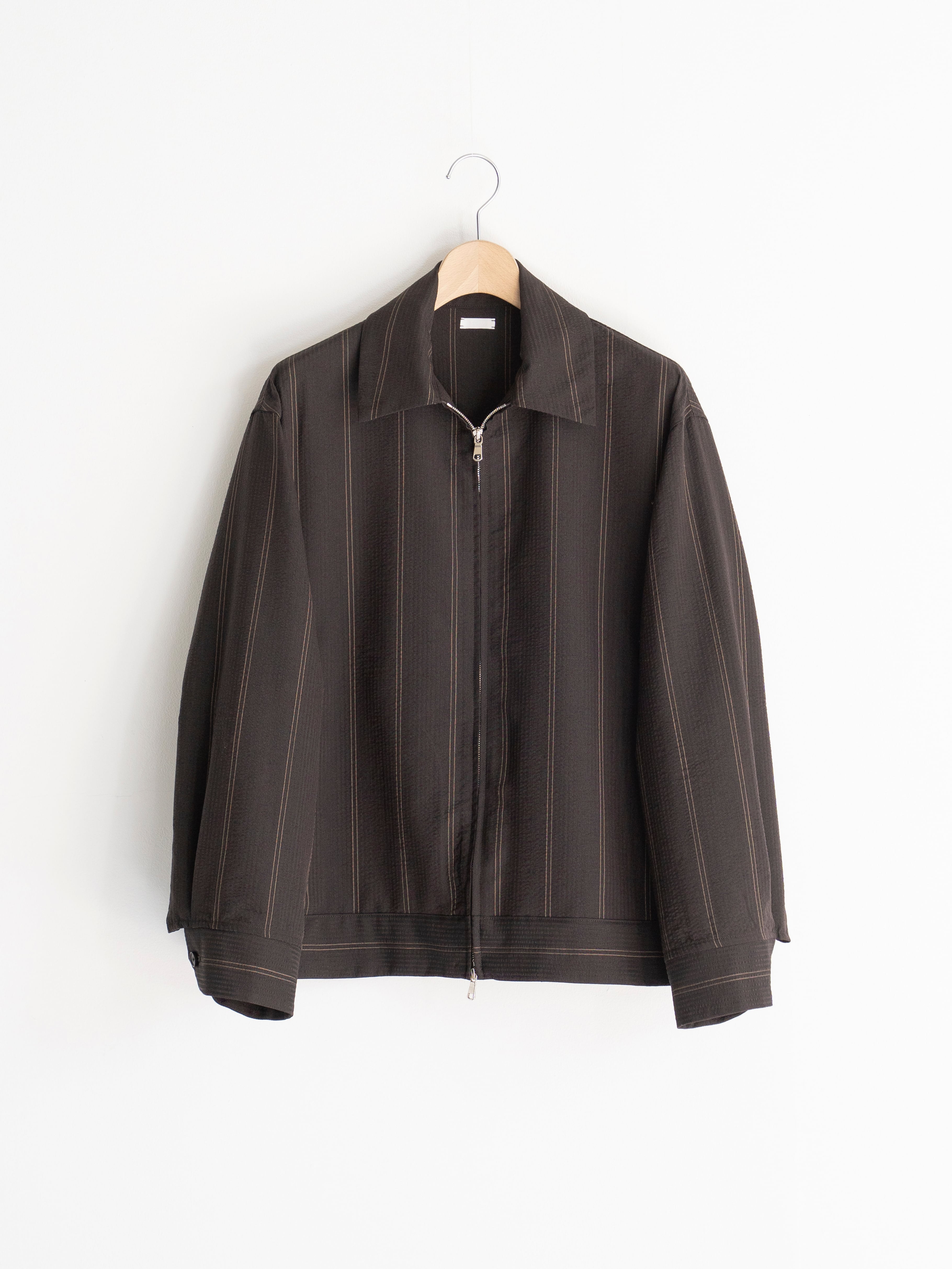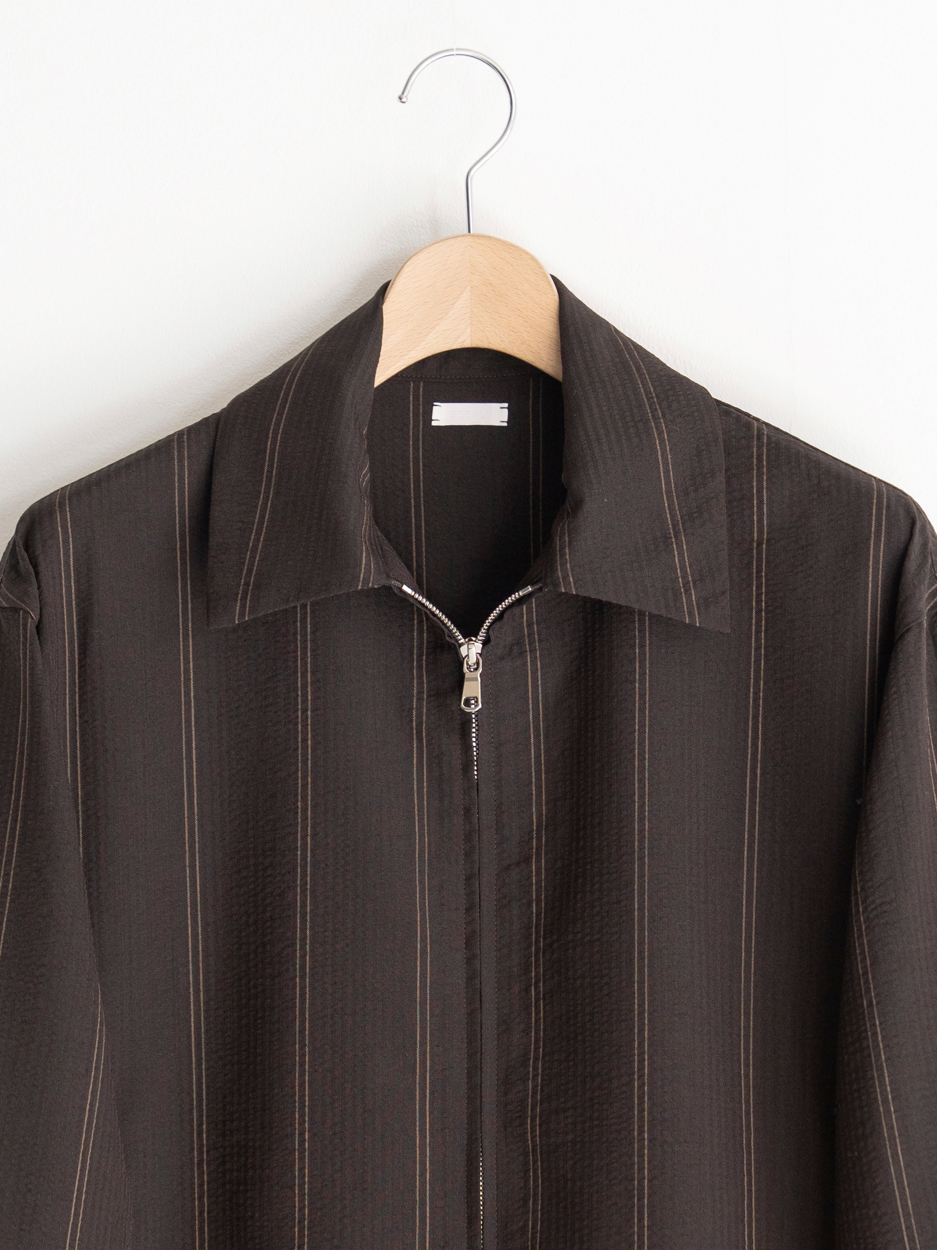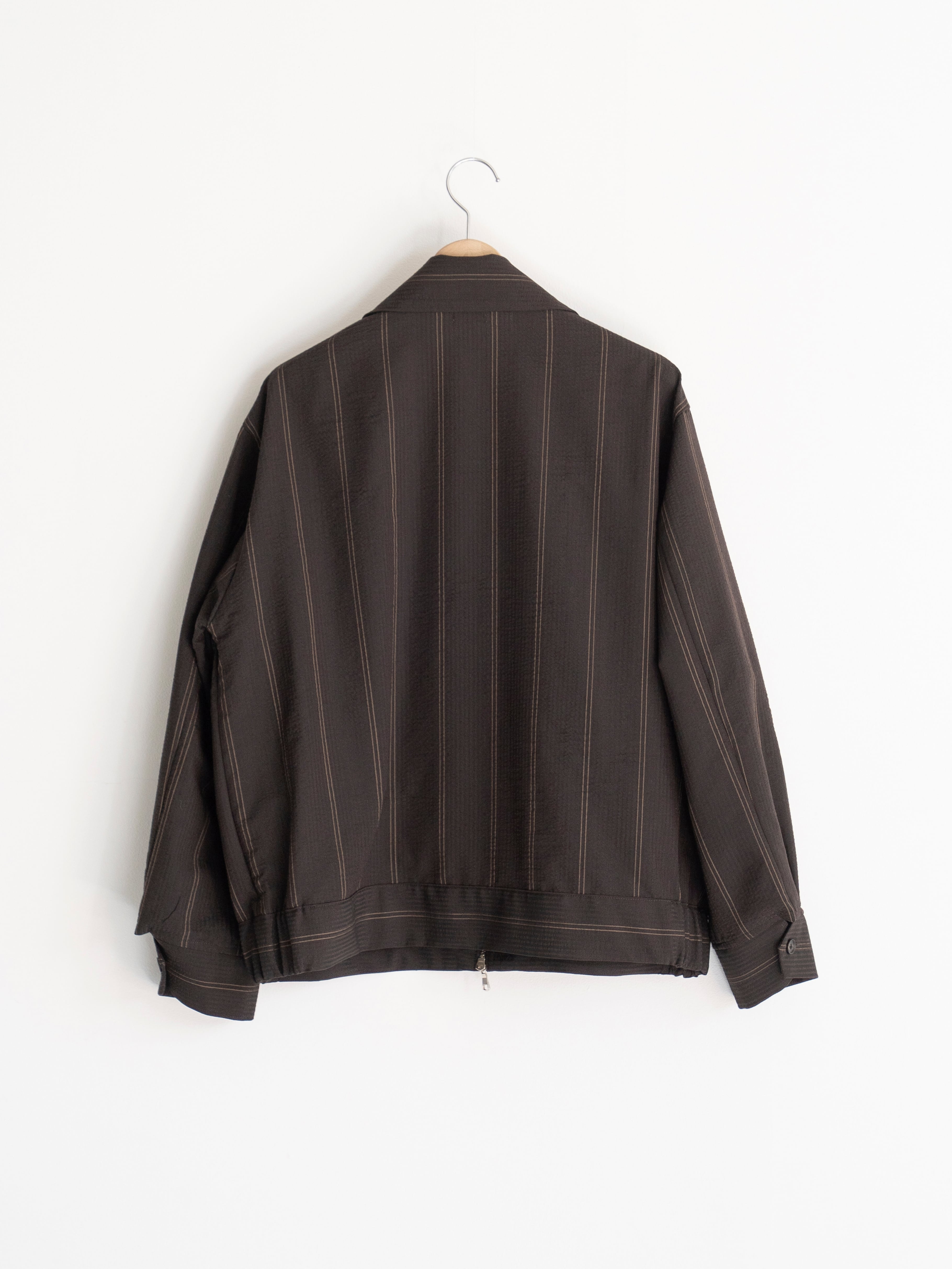 綿糸で作られることが多いサッカーを地タテヨコともに梳毛ウールを使用しています。通常サッカー地は2種類の異なるテンションの経糸を交互に配置してシボと畝を表現しますが、この生地はストライプの複雑な表情を表現するために6本交互に異なるテンションの意図を配置しています。一見単色の濃色に見えるストライプは黒と深いブラウンで構成されています。畝により細いストライプが揺らいで見えます。整理加工でこの畝と揺らぎが損なわれないように自然な仕上げをしています。