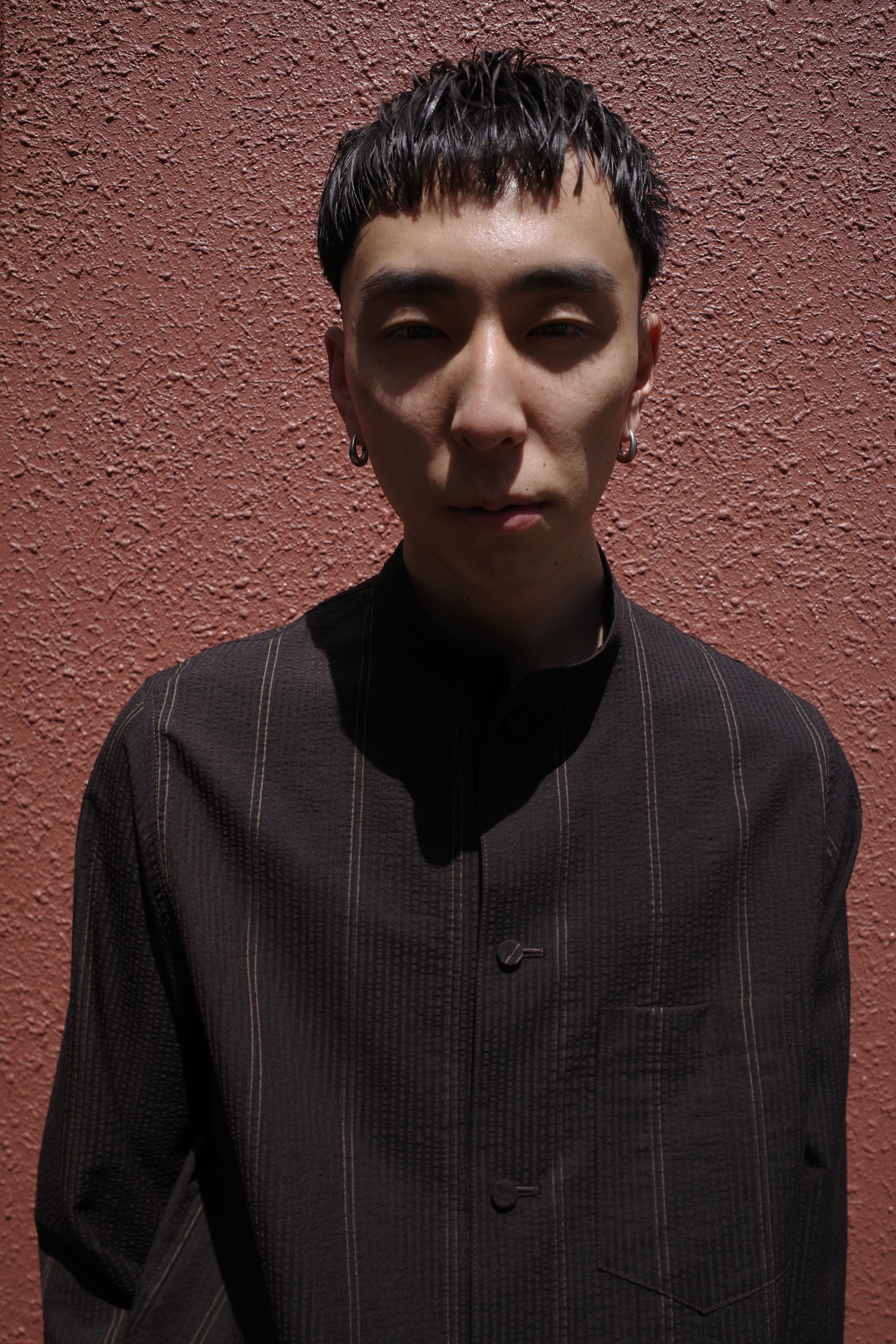 一般的に綿糸で作られることが多い"サッカー生地"をタテヨコともに梳毛ウールを使用しています。一見単色の濃色に見えるストライプは黒と深いブラウンで構成されています。整理加工の段階で自然な風合いを残すことで、特徴的な畝や揺らぎを損なわずに仕上げています。