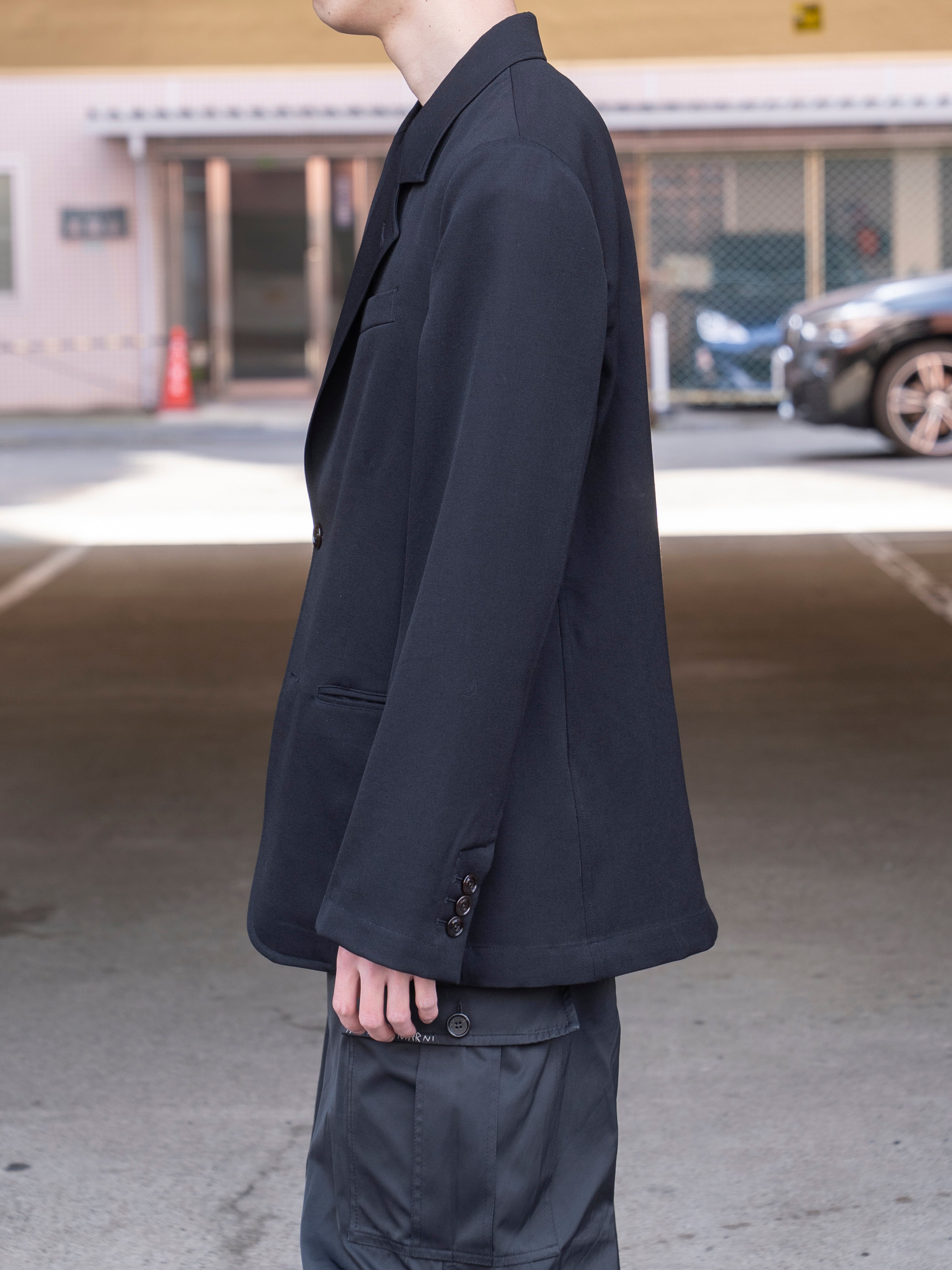 粗めのブラックギャバジンを使用した、アンコンストラクテッドセレモニーブレザー。イタリア製のバージンウールギャバジンを使用しています。ギャバジンの密に織られたツイル構造は、耐久性、防風性、そして滑らかでしっかりとした手触りを実現します。斜め織りが丈夫でありながら洗練された印象を与え、構造とドレープのバランスが絶妙です。アンコンストラクテッドセレモニーブレザーは、裏地なし、アンコンストラクテッド仕様で、ダブルブレストのフロントにコロゾボタン、ピークドラペル、フラップ付きウェルトポケット2つ、縫い目とポケットの縁には洗練されたトップステッチが施されています。ゆったりとしたレギュラーフィットで、ボックスステッチのバックラベルで仕上げられています。