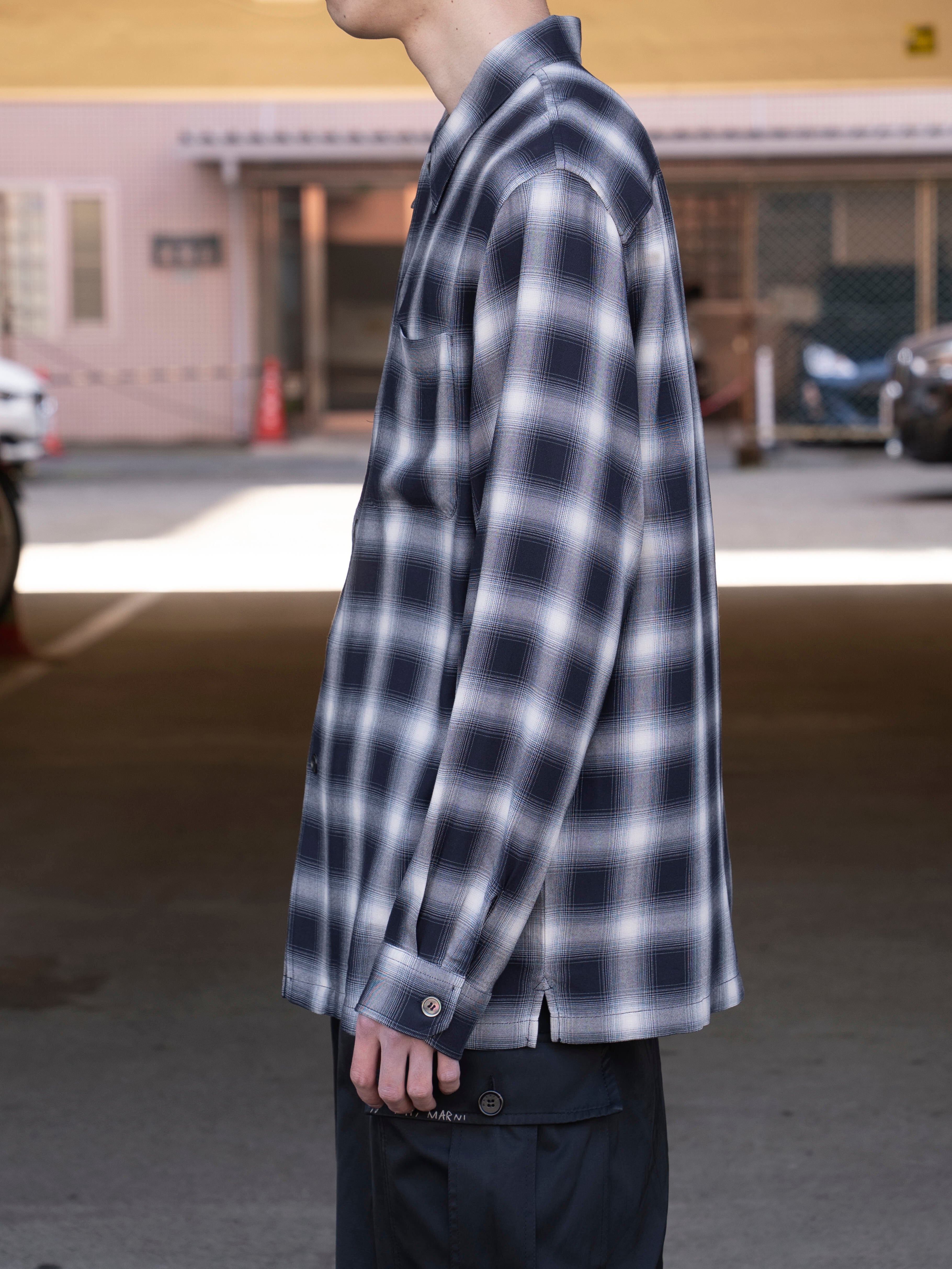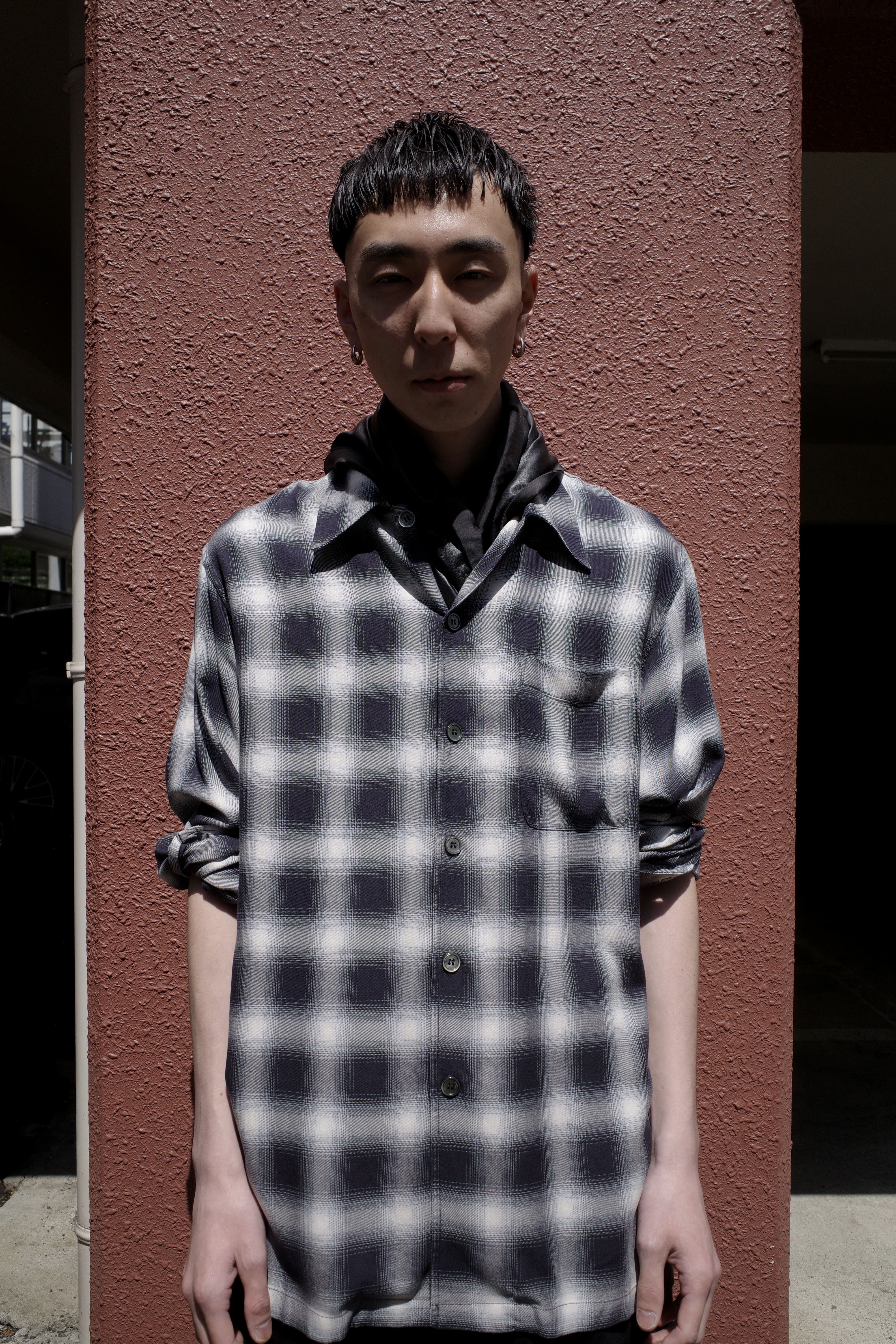 当社の定番シャツ、リノ・カウボーイ・ビスコース。チェック柄の日本製ビスコース生地を使用したこのシャツは、ゆったりとした着心地で、ストレートヘム、幅広の裏地が付いたすっきりとした前立て、真珠貝ボタン、そしてさりげないギャザーを寄せたバックヨークが特徴です。