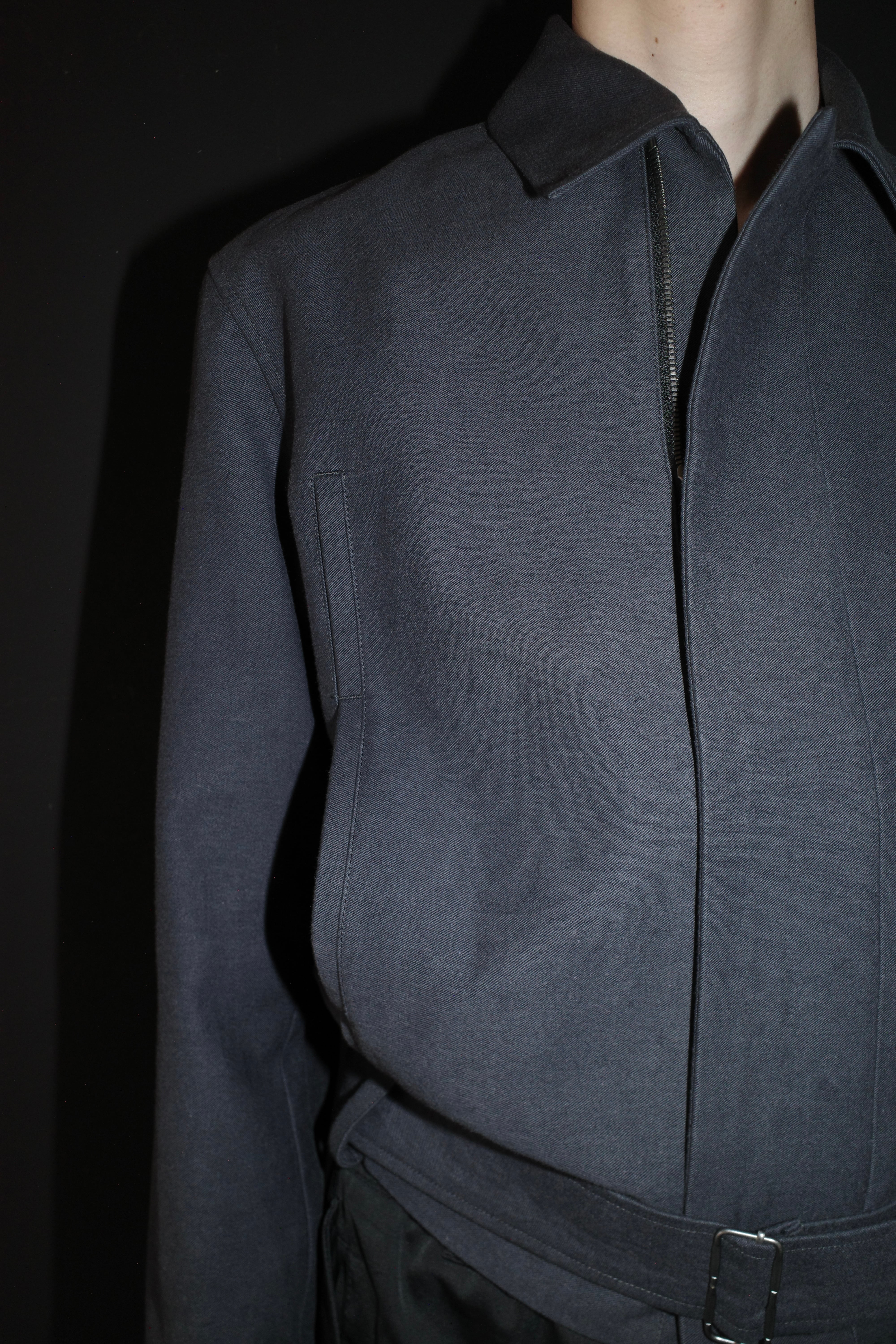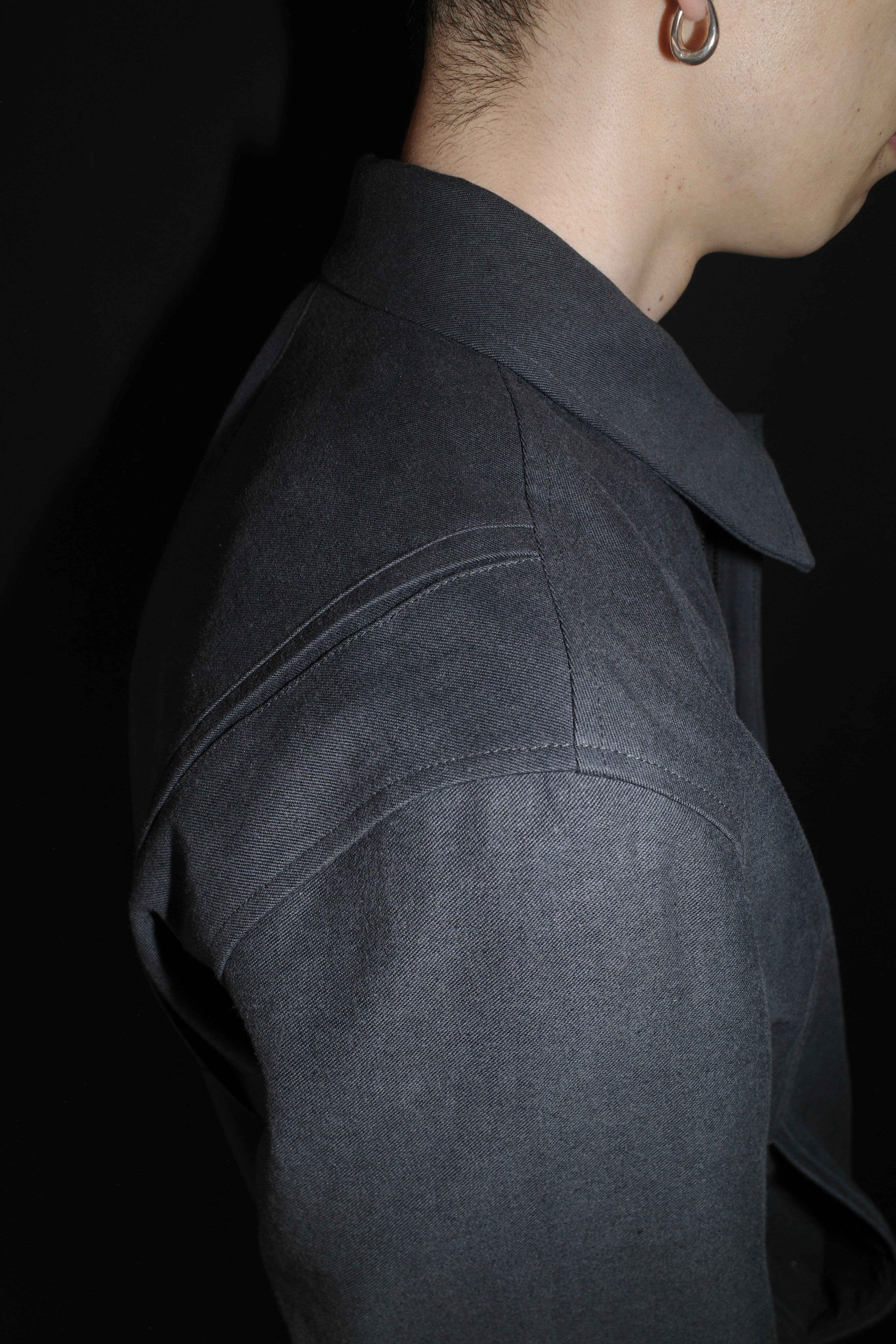 建築的なアプローチを得意とするブランドらしく、肩から袖にかけての独創的な切り替えが、着用時に美しいフォルムを描きます。短めの着丈に設定されており、ワイドパンツやレイヤードスタイルとの相性が非常に良く、現代的なバランスを演出いたします。