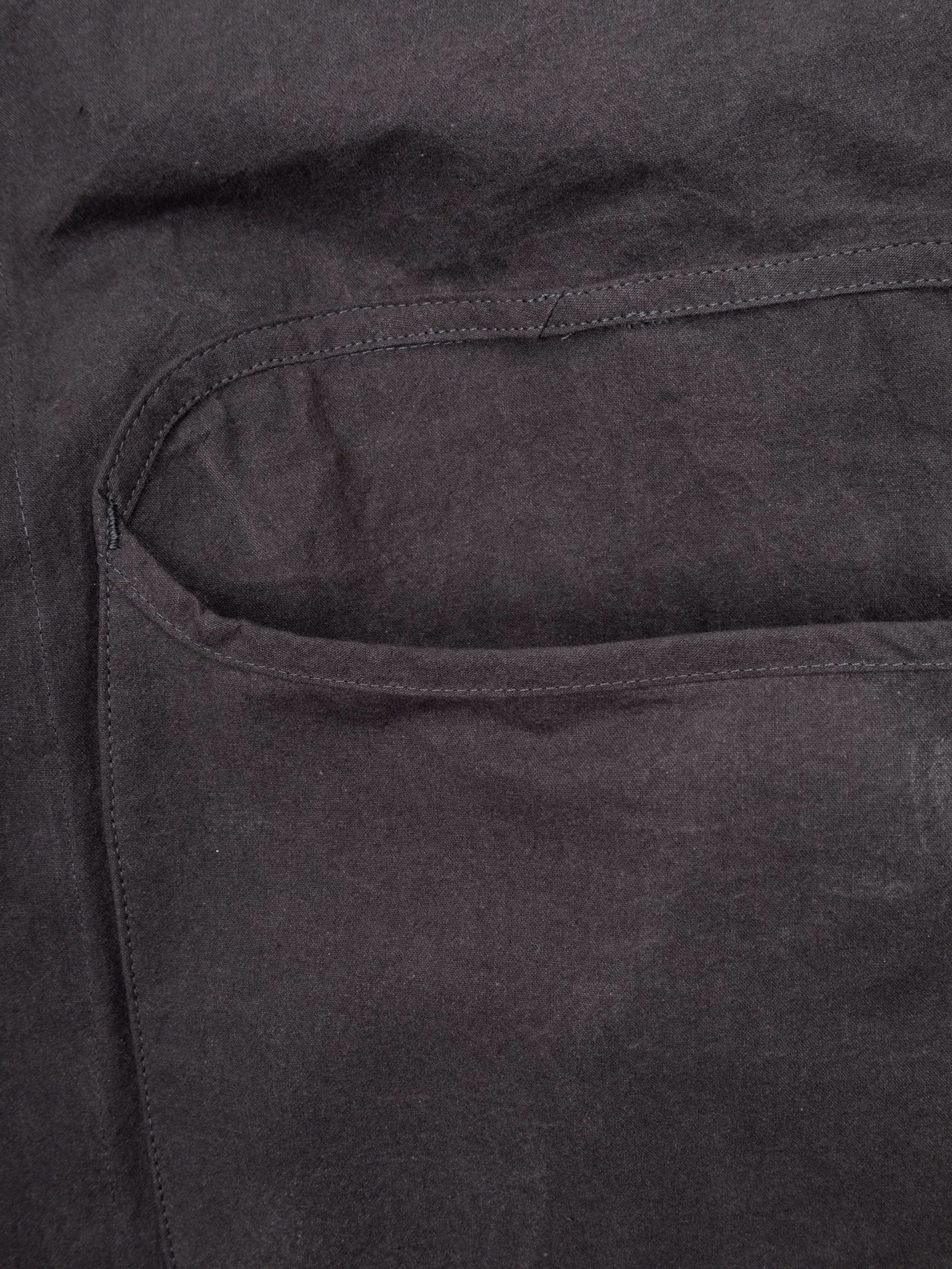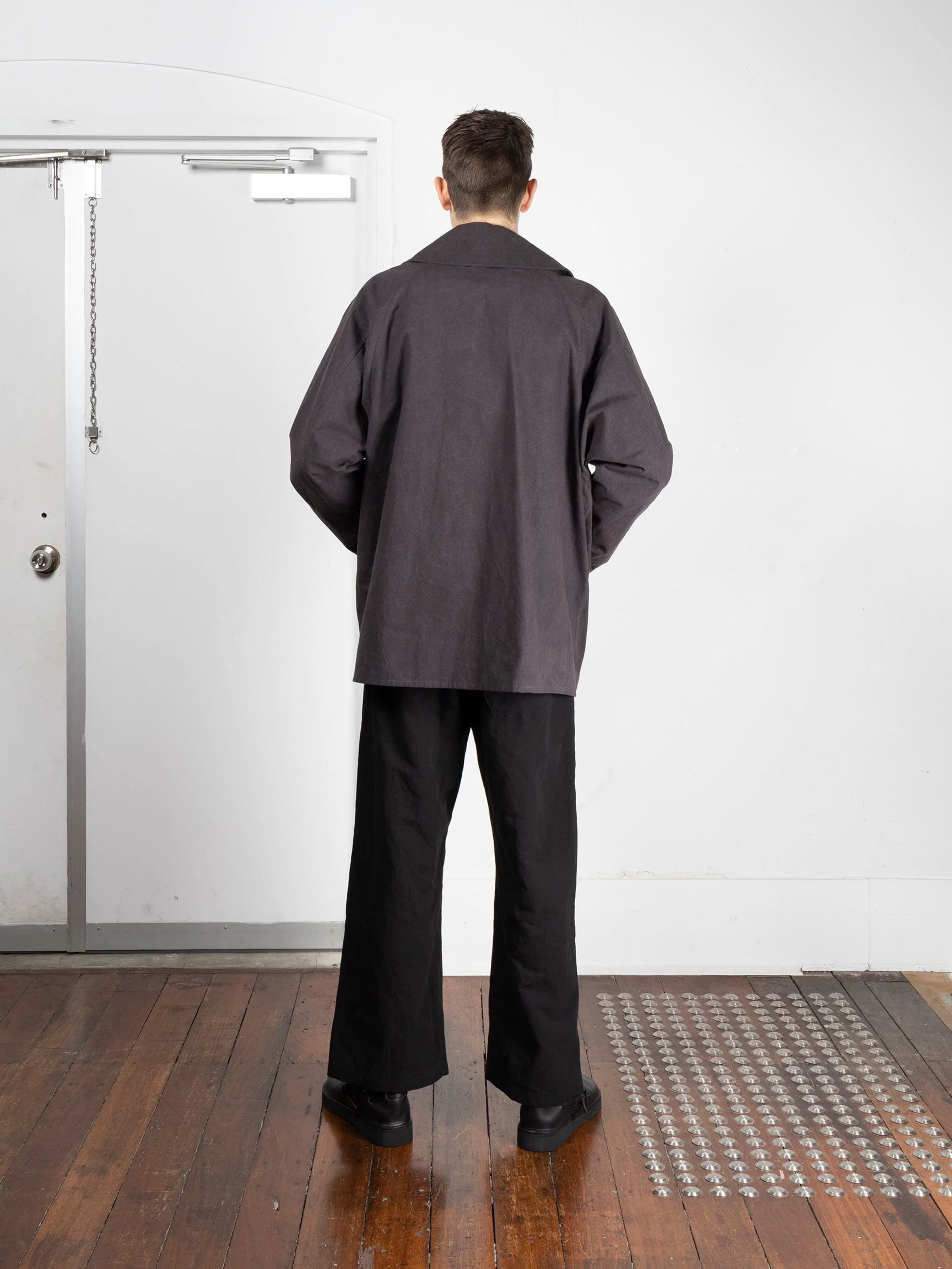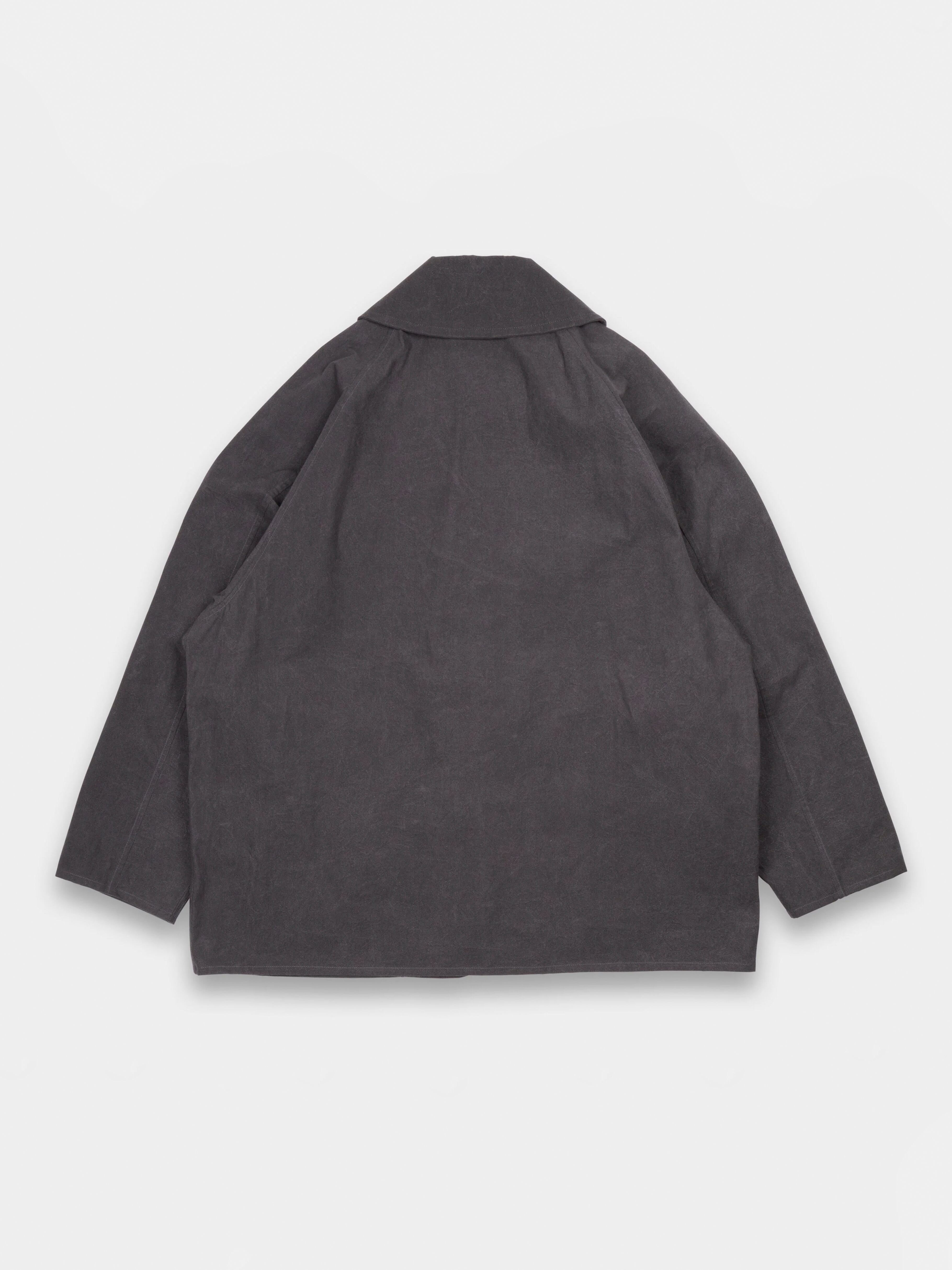 綿100%でパラフィンワックスコーティングが施されています。オーストラリアとアメリカ産の綿を使用し、日本で糸を紡績、染色しました。静岡で織り、福井でパラフィンワックスをコーティングしました。この MAN–TLE のオリジナル生地、Wax は、時間の経過とともにより経年変化による新しい色、質感が現れるように設計されています。最初は厚手で自然な硬さがありますが、洗濯や着用により柔らかくなり、色褪せ、形が変化し、着用者によりフィットしていきます。