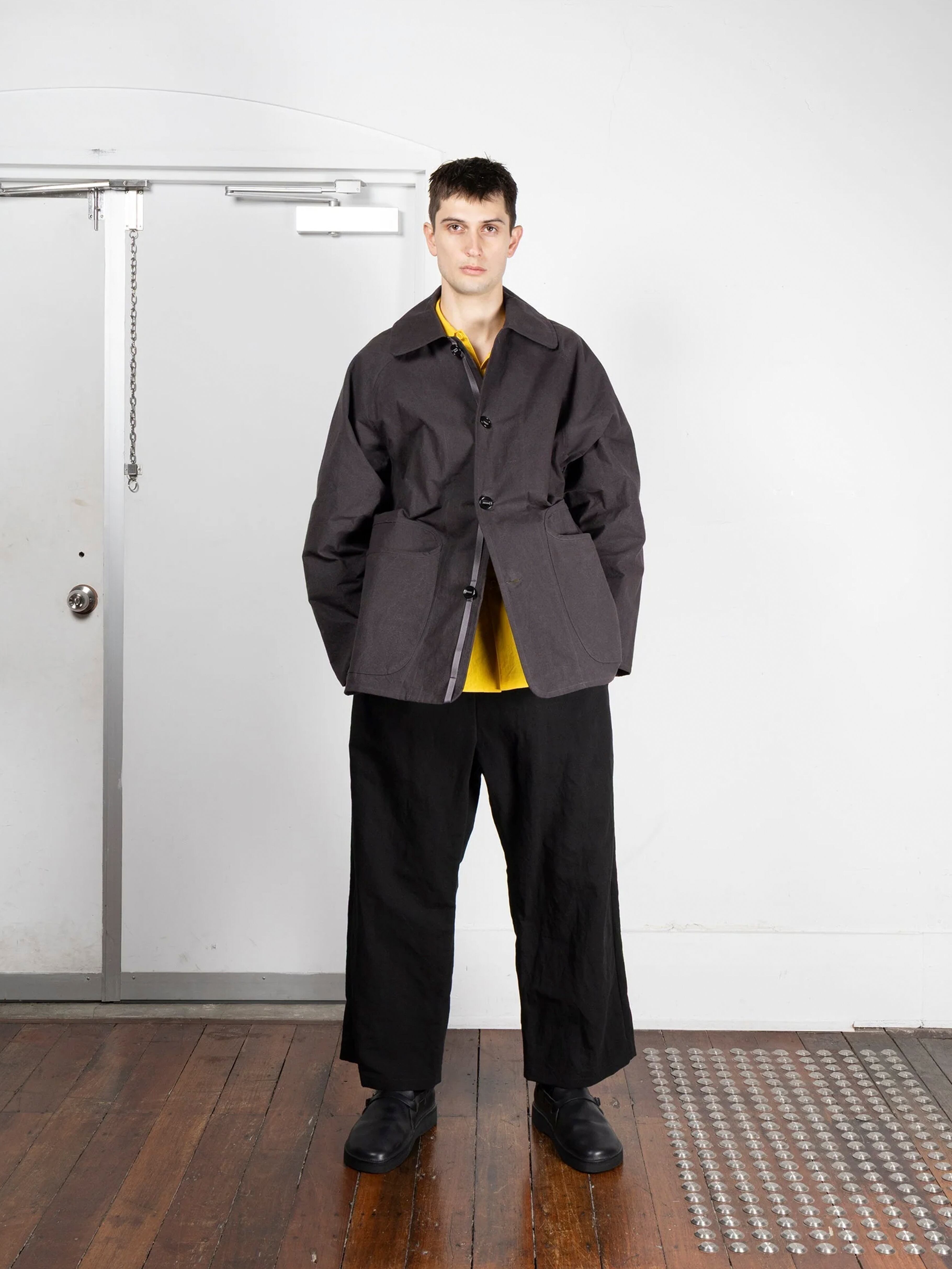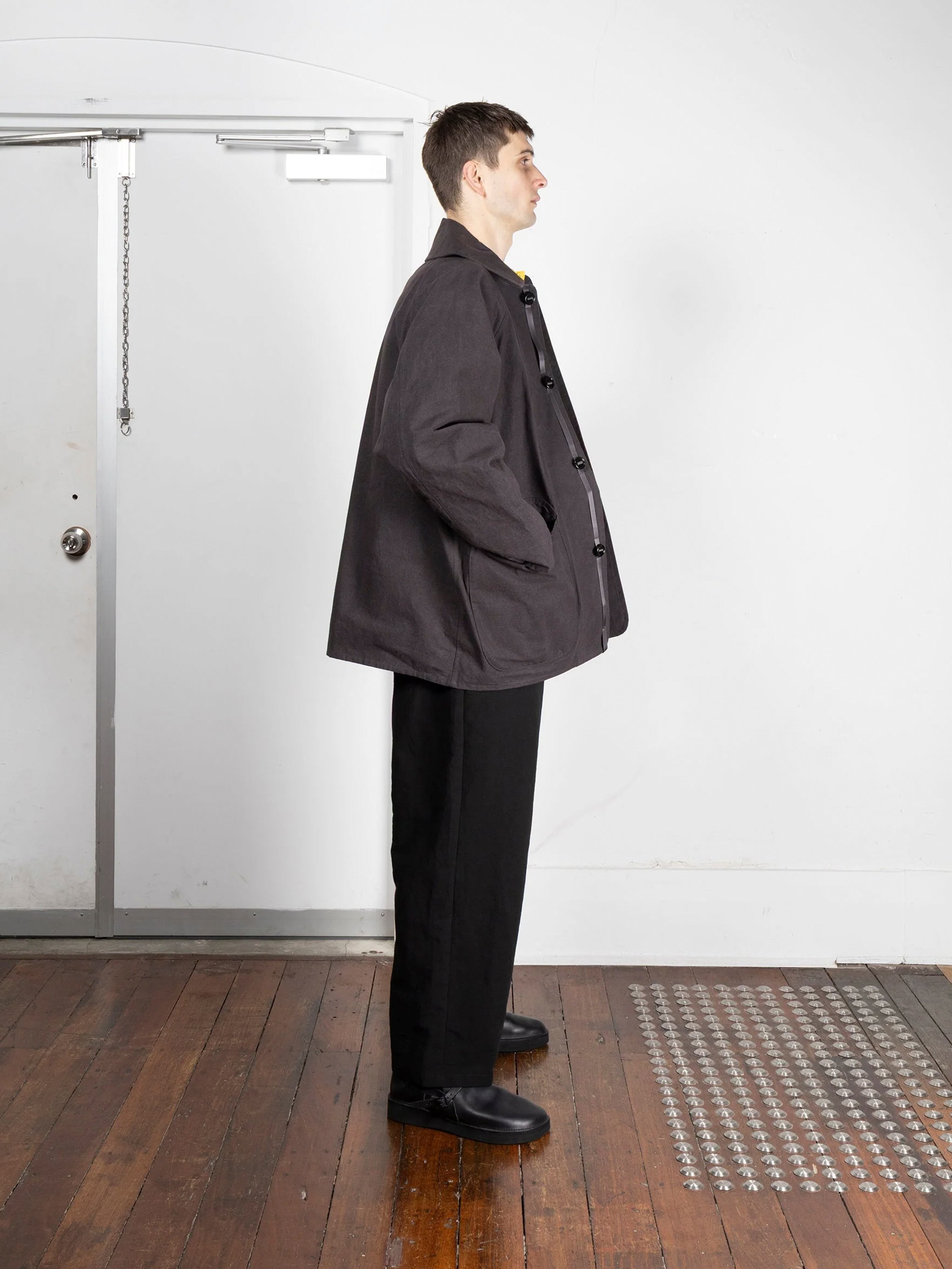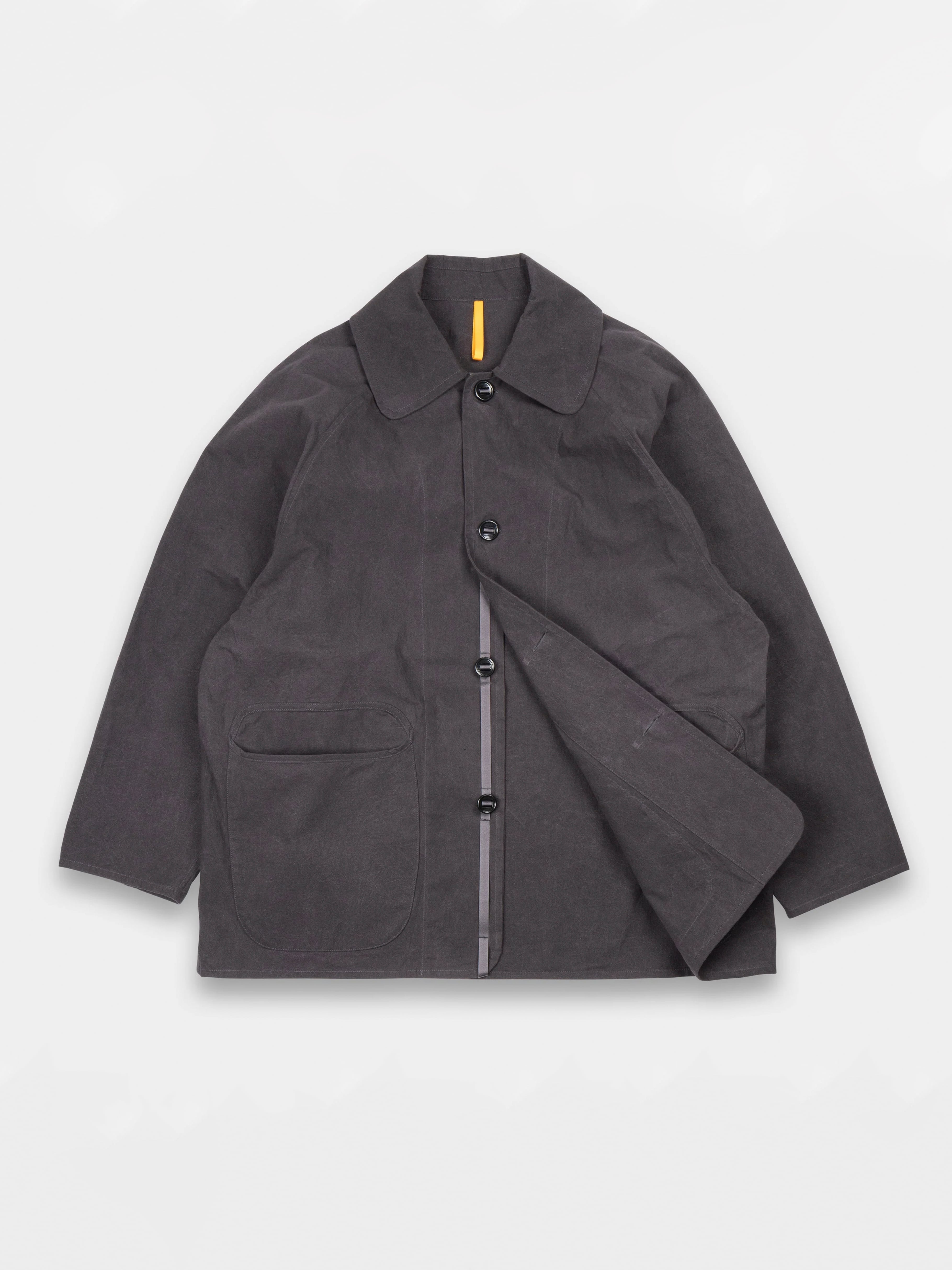 綿100%でパラフィンワックスコーティングが施されています。オーストラリアとアメリカ産の綿を使用し、日本で糸を紡績、染色しました。静岡で織り、福井でパラフィンワックスをコーティングしました。この MAN–TLE のオリジナル生地、Wax は、時間の経過とともにより経年変化による新しい色、質感が現れるように設計されています。最初は厚手で自然な硬さがありますが、洗濯や着用により柔らかくなり、色褪せ、形が変化し、着用者によりフィットしていきます。
